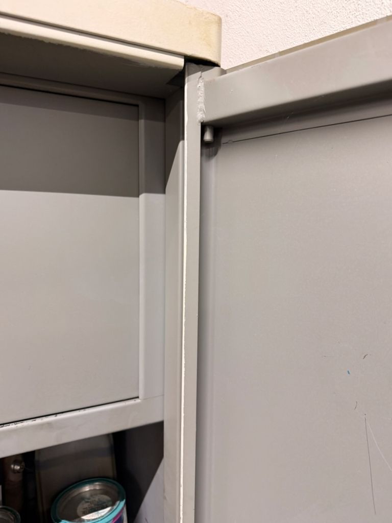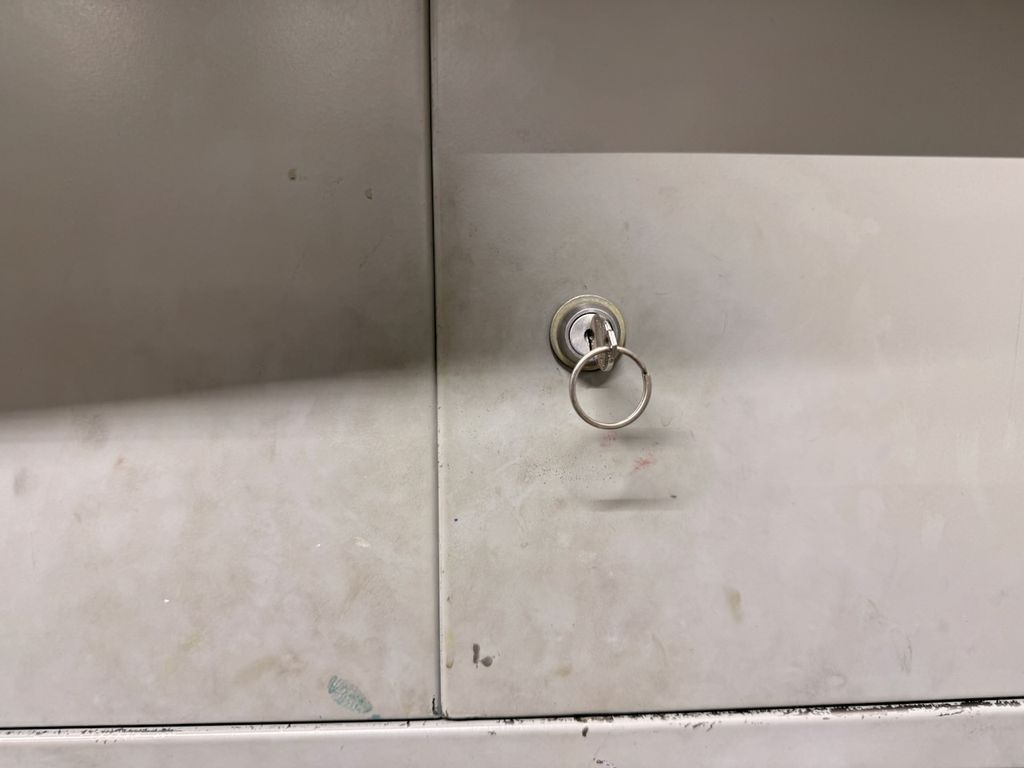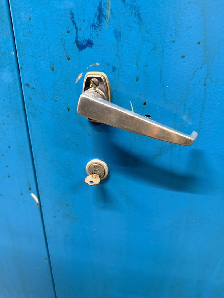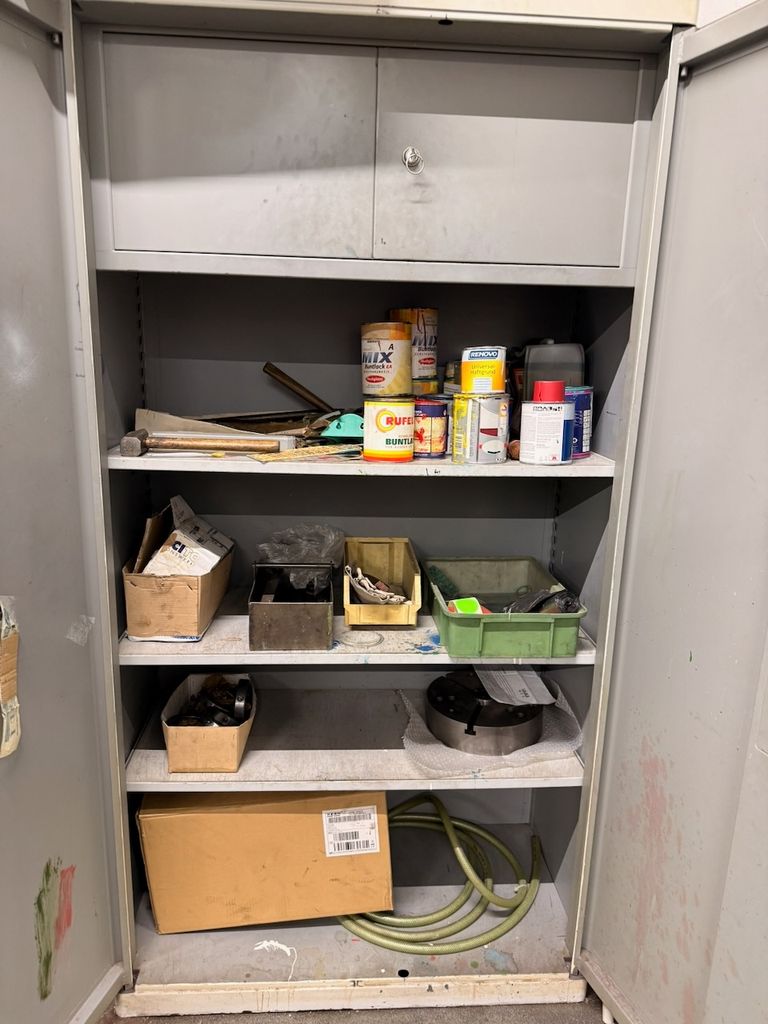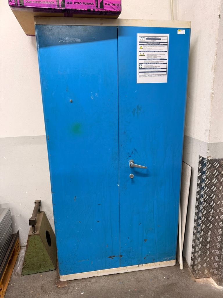 Robuste Konstruktion, zwei Türen, drei höhenverstellbare Fachböden, abschließbares Innenfach, Schlüssel vorhanden