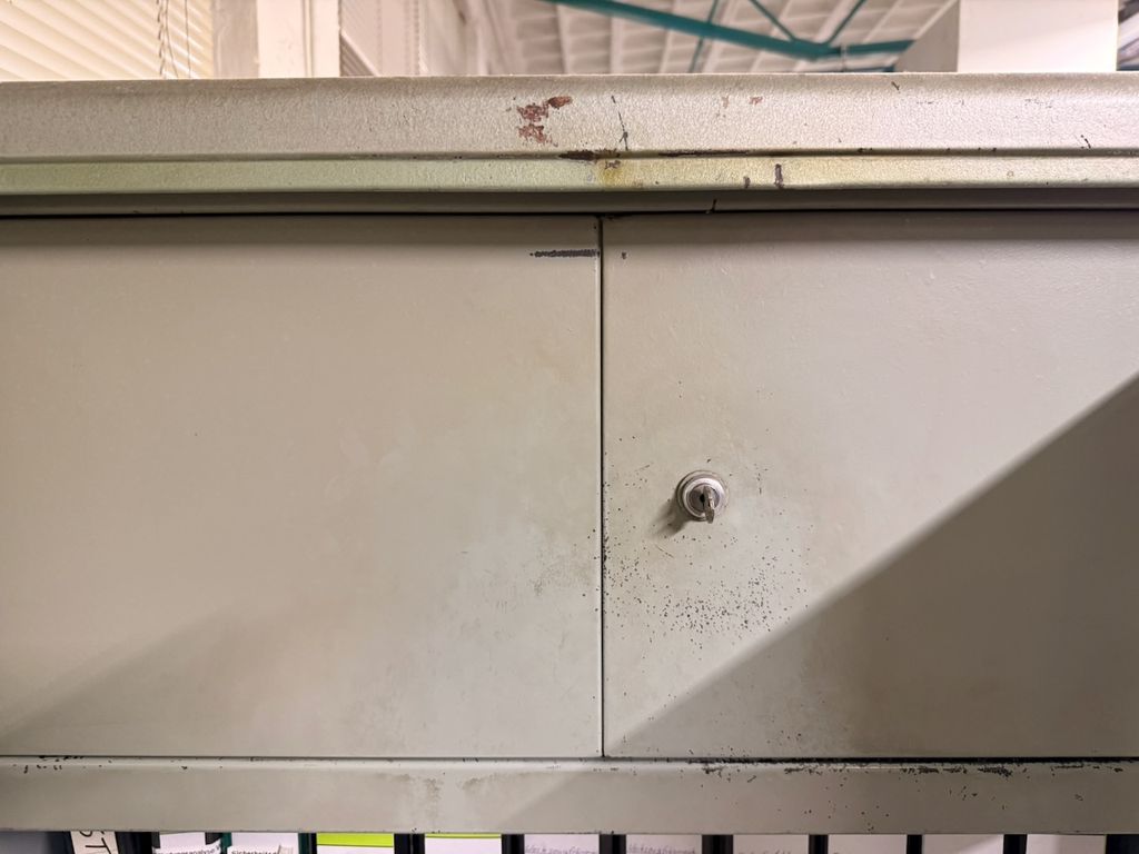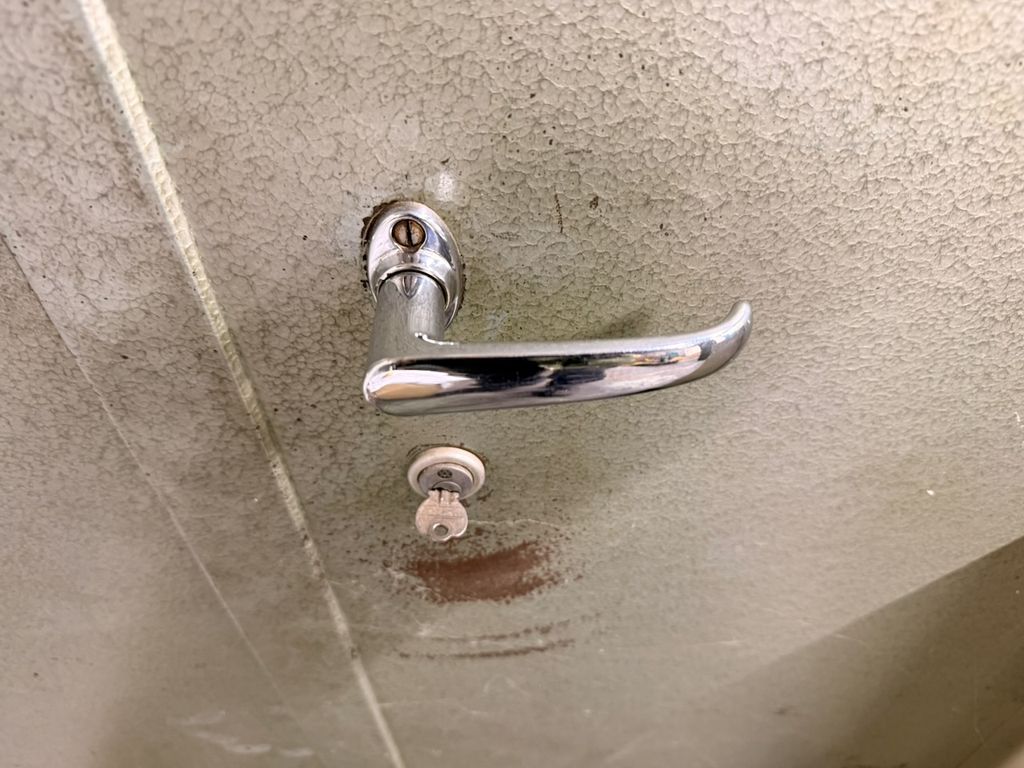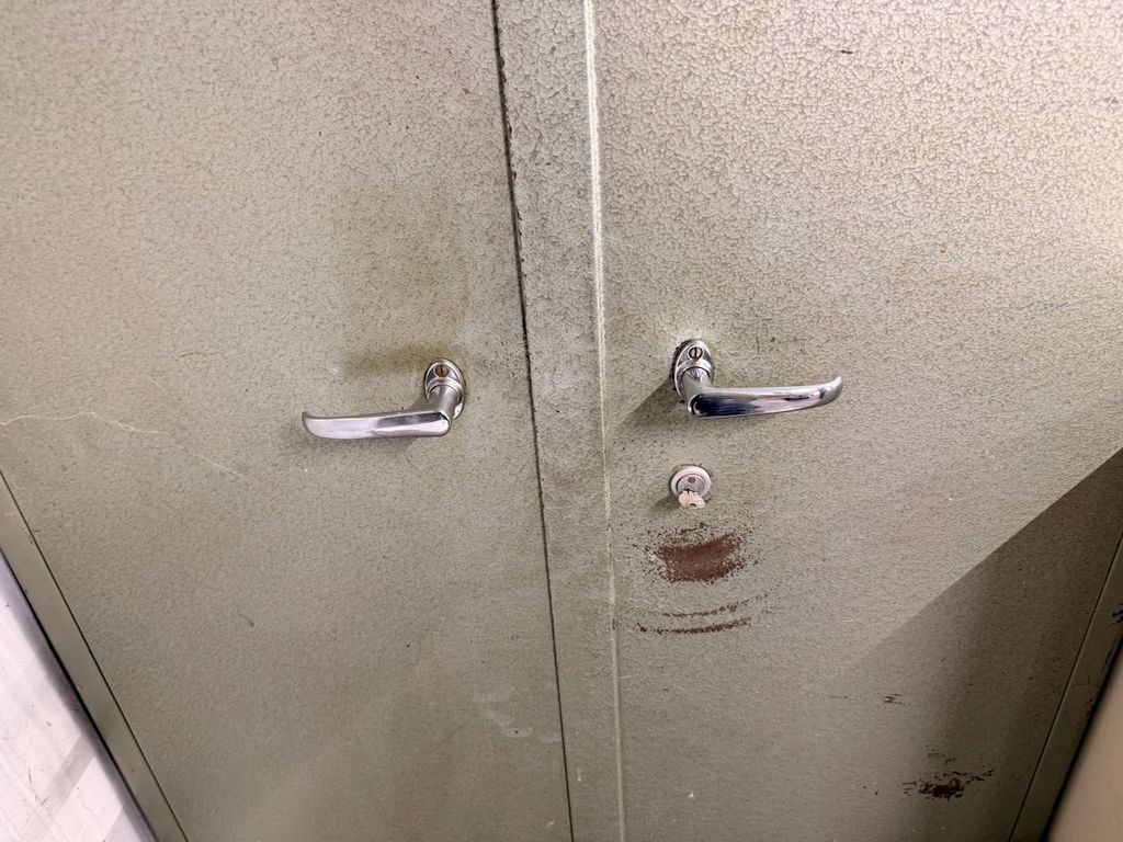 Robuste Konstruktion, zwei Türen, drei höhenverstellbare Fachböden, abschließbares Innenfach, Schlüssel vorhanden, Originallackierung