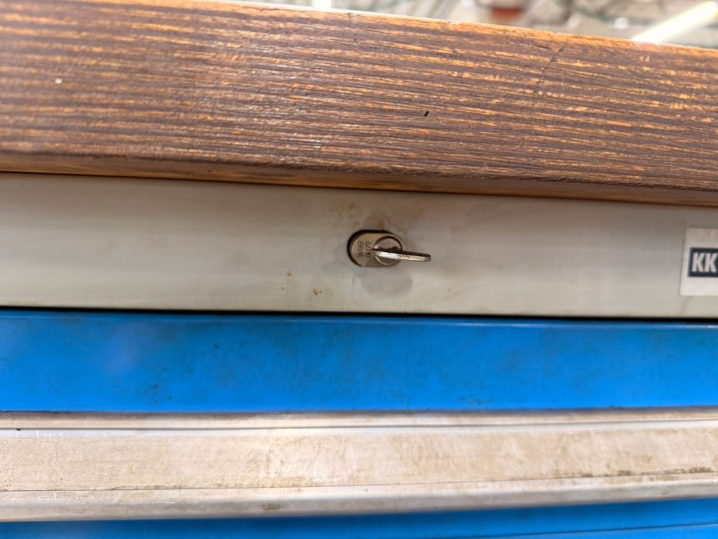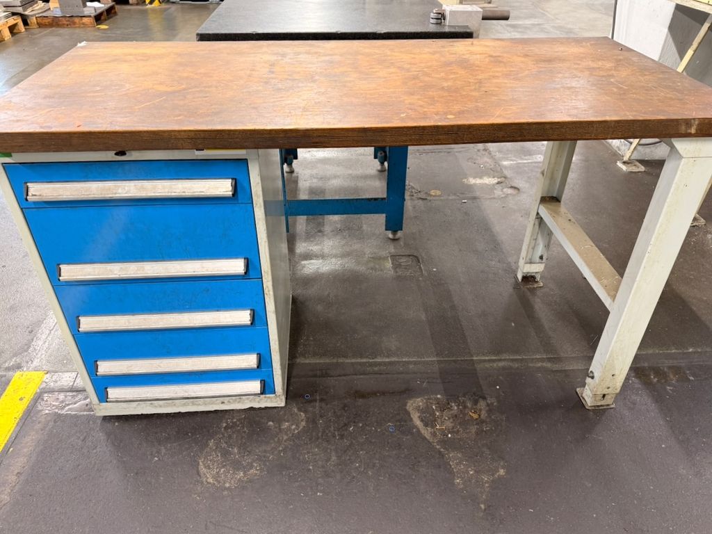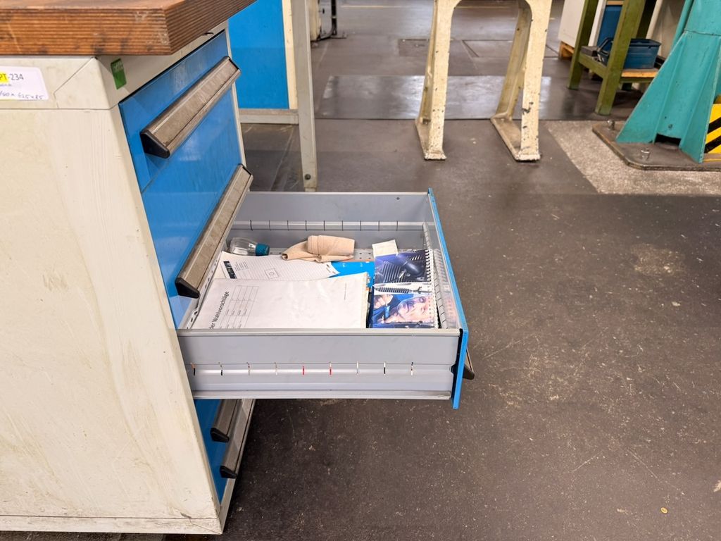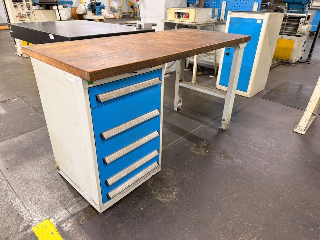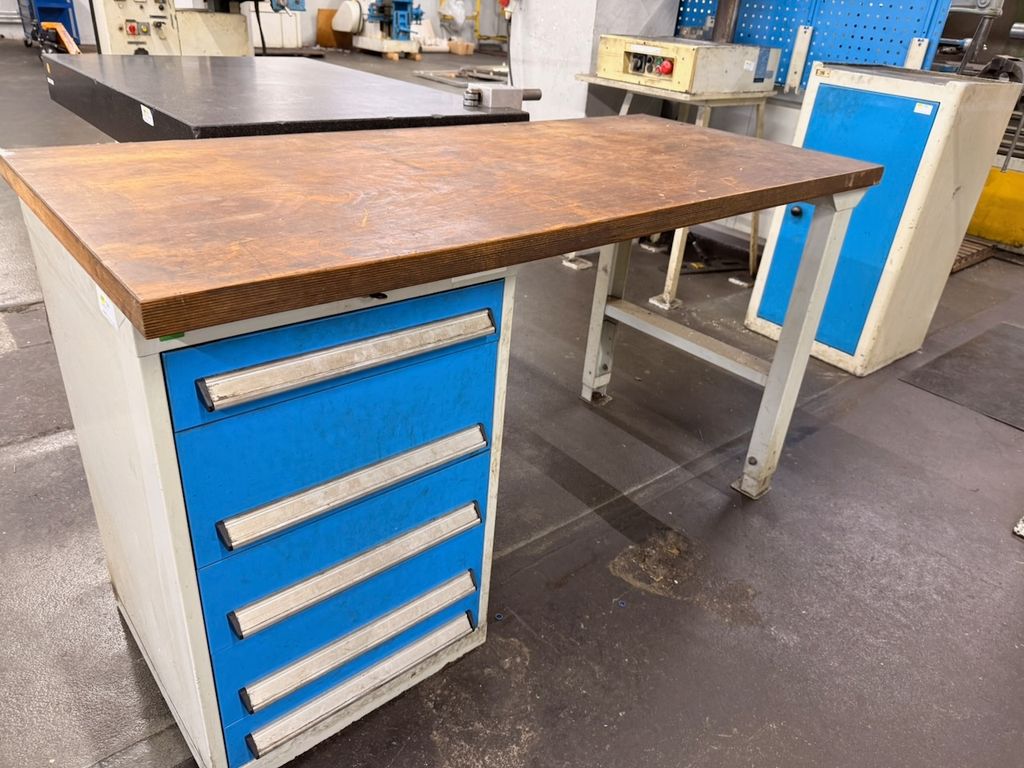 Die Werkbank verfügt über eine massive Holzarbeitsplatte mit sichtbaren Gebrauchsspuren, jedoch ohne strukturelle Beschädigungen. Untergebaut ist ein Schubladenschrank mit 5 Auszügen, alle Schubladen sind leer. Die Schubladeneinheit ist abschließbar, ein Schlüssel ist vorhanden.