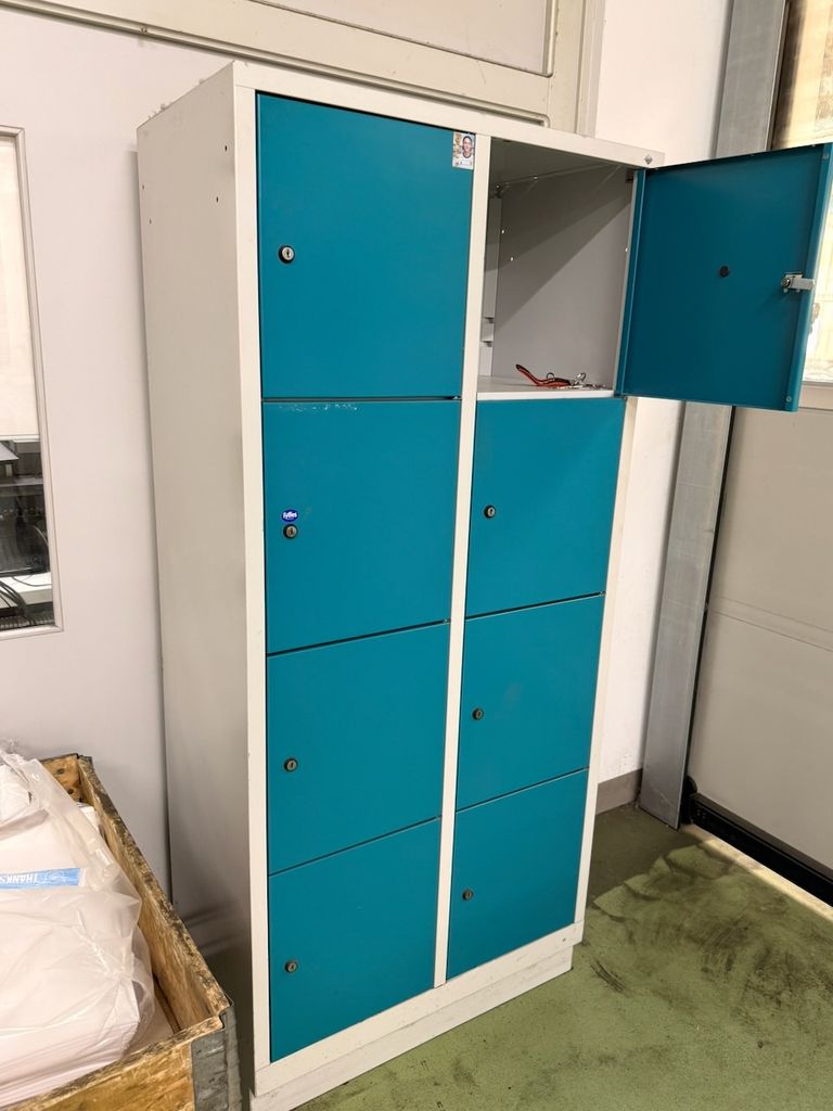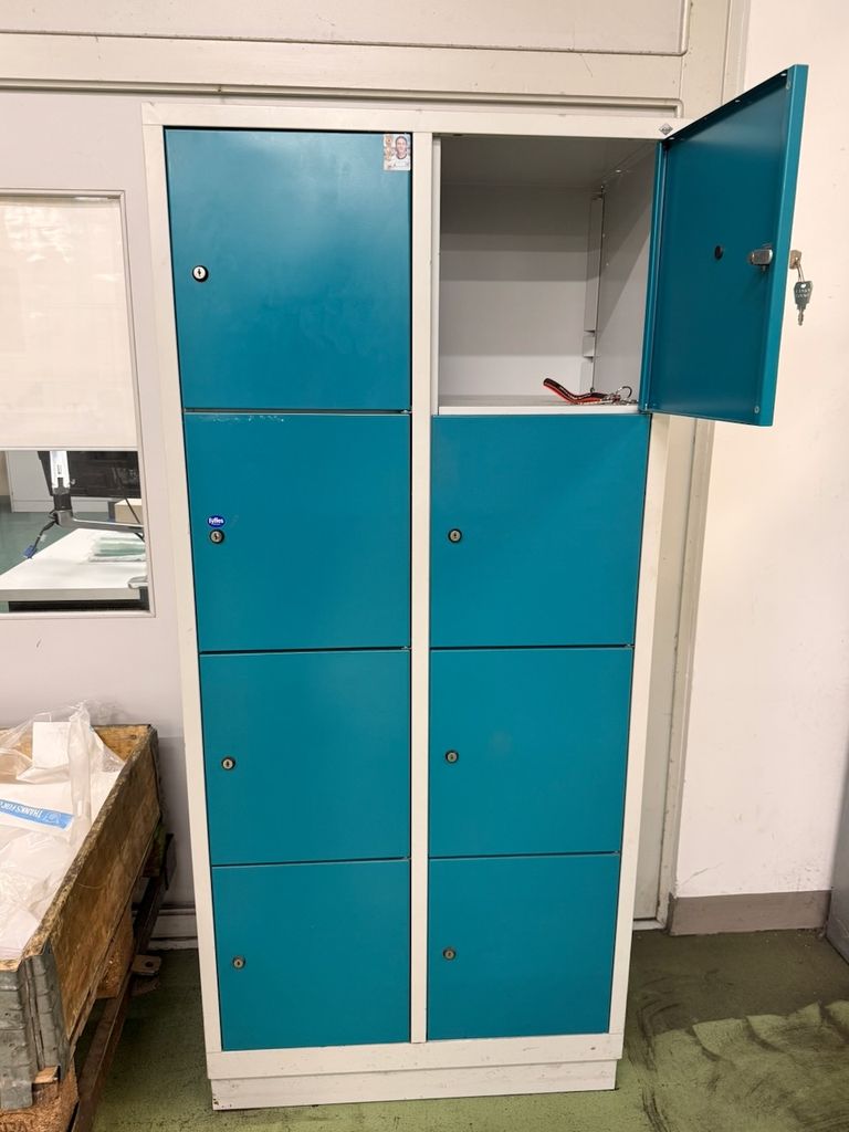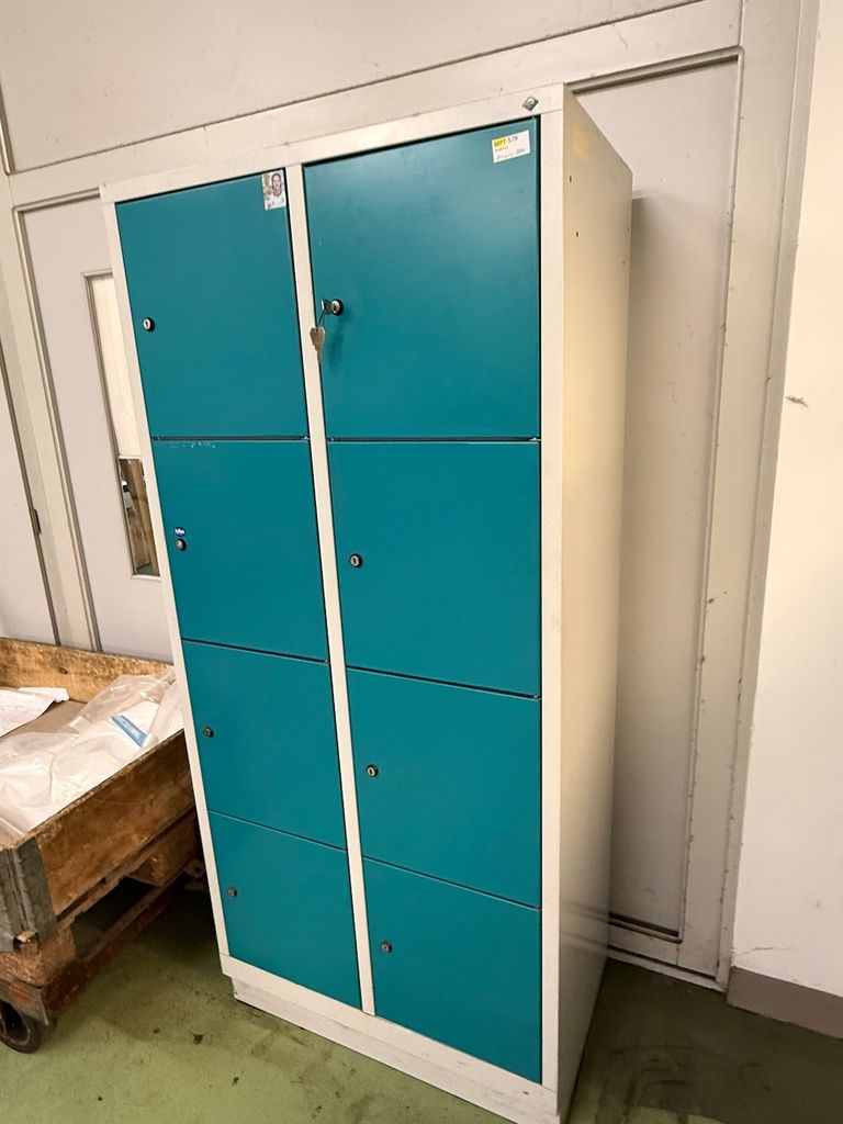 Gebrauchter Stahl-Spindschrank des Herstellers CP mit insgesamt 8 einzeln verschließbaren Fächern (2 Spalten mit jeweils 4 Fächern übereinander).