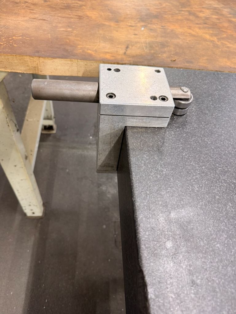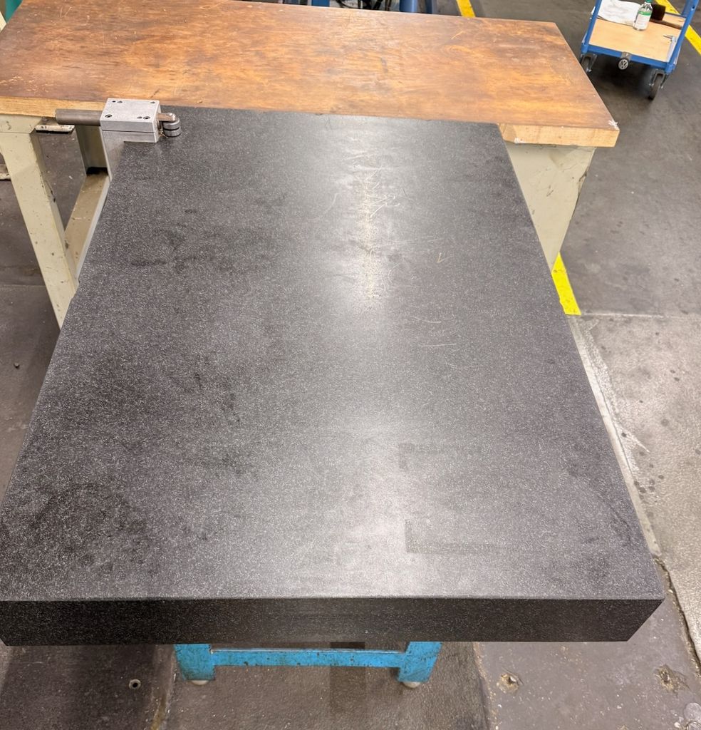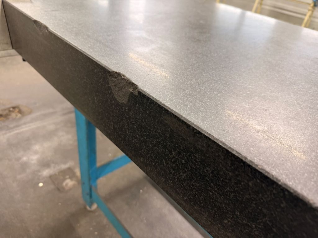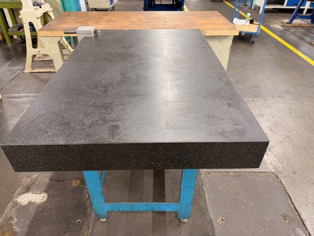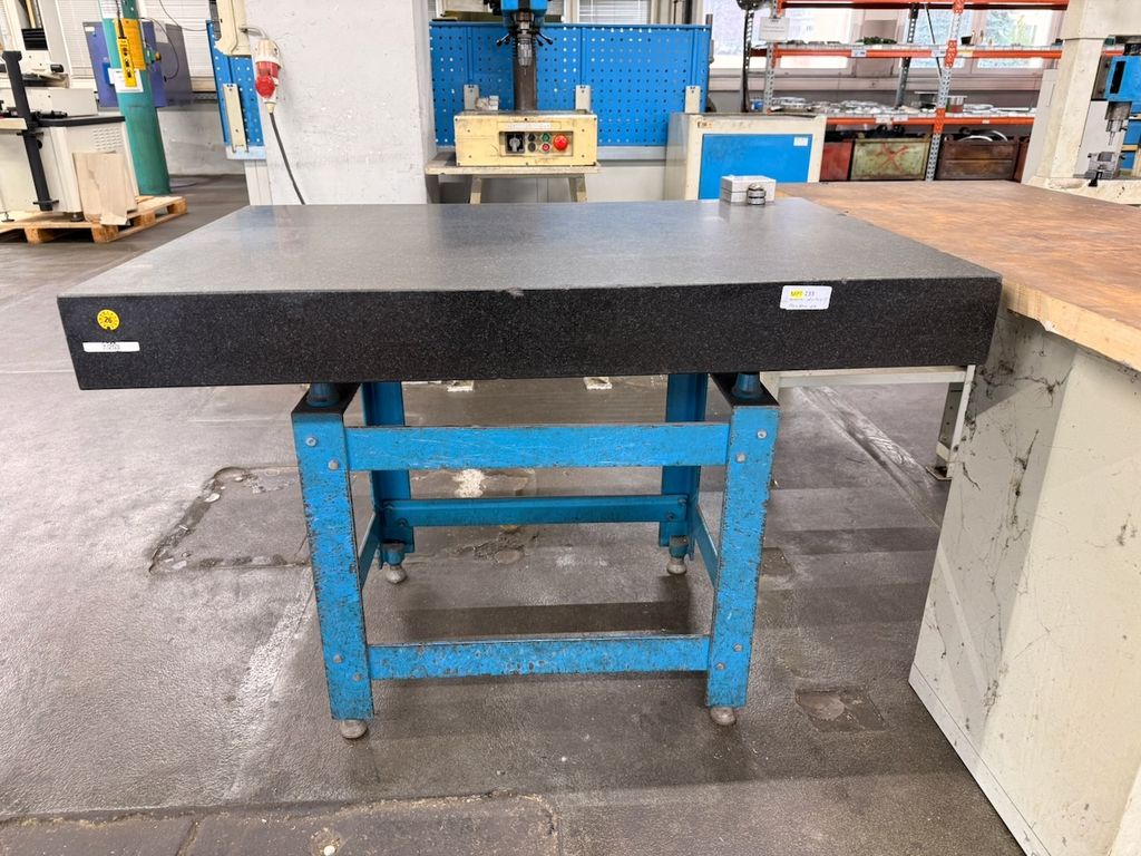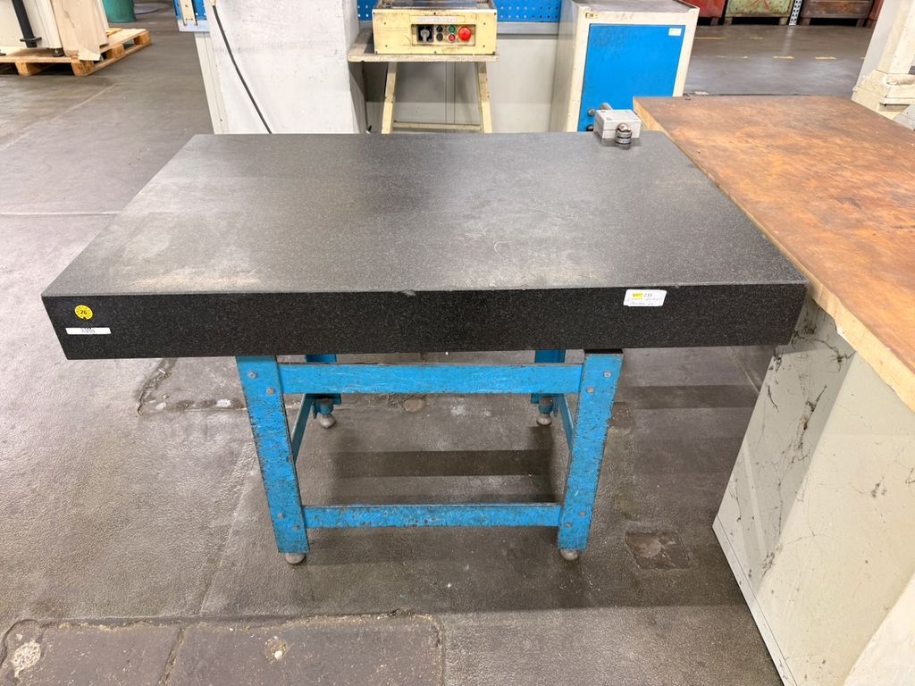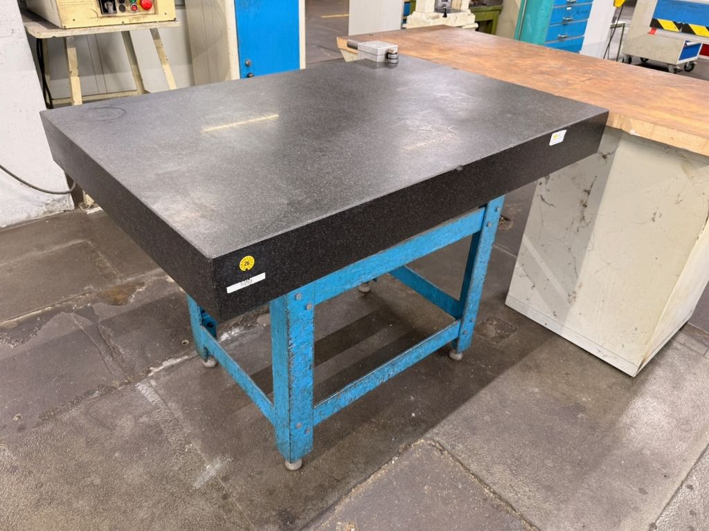 Granit-Messplatte zur Mess-, Prüf- und Anreißarbeit. Ausführung auf stabilem Stahluntergestell. Oberfläche plan geschliffen. An einer Ecke kleiner Kantenausbruch vorhanden (siehe Detailfoto), Messfläche insgesamt nutzbar. Geeignet für Messraum, Werkstatt und Qualitätssicherung.
