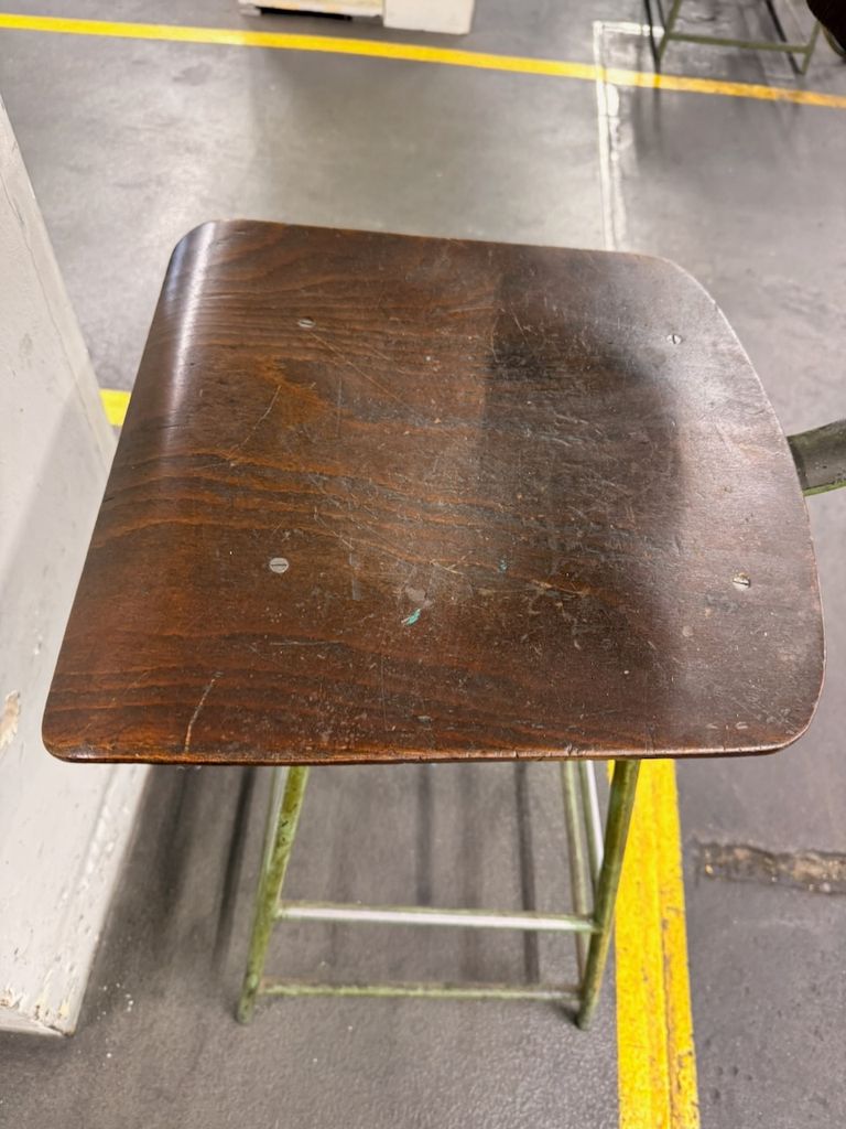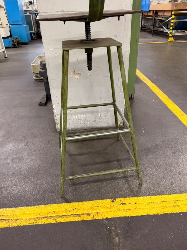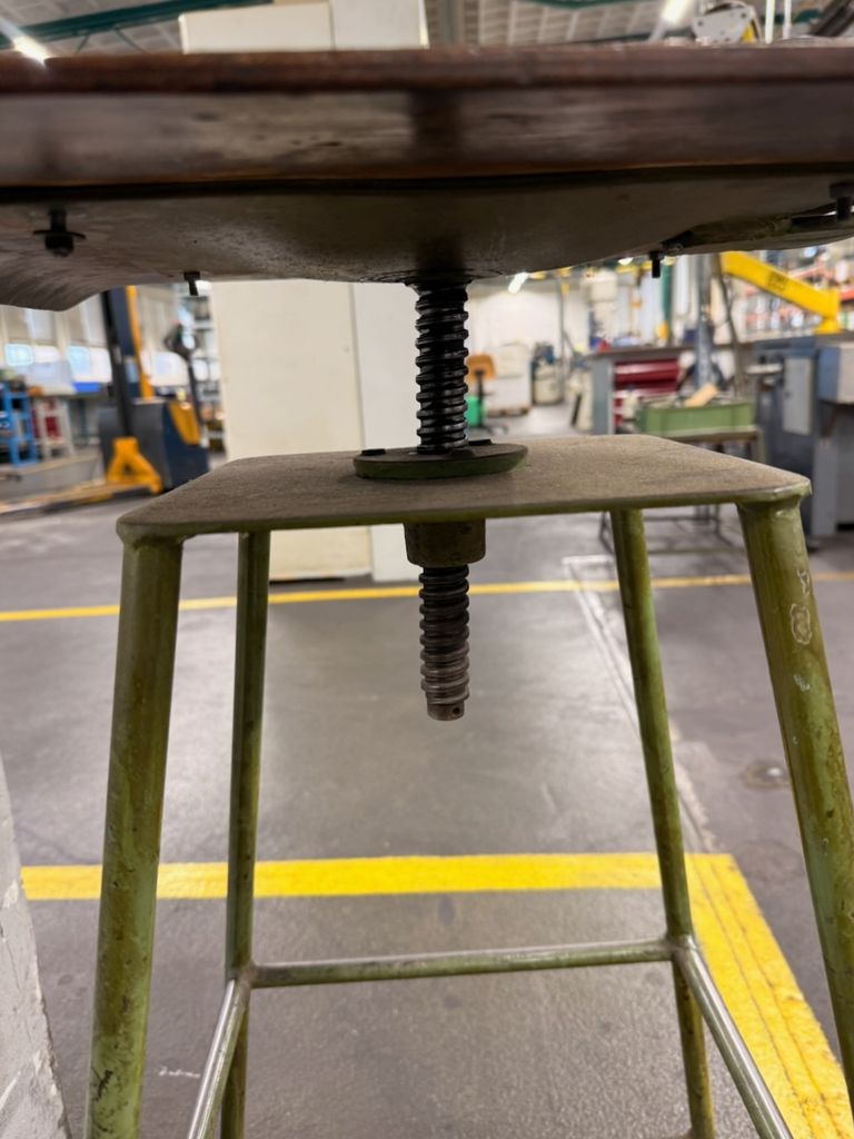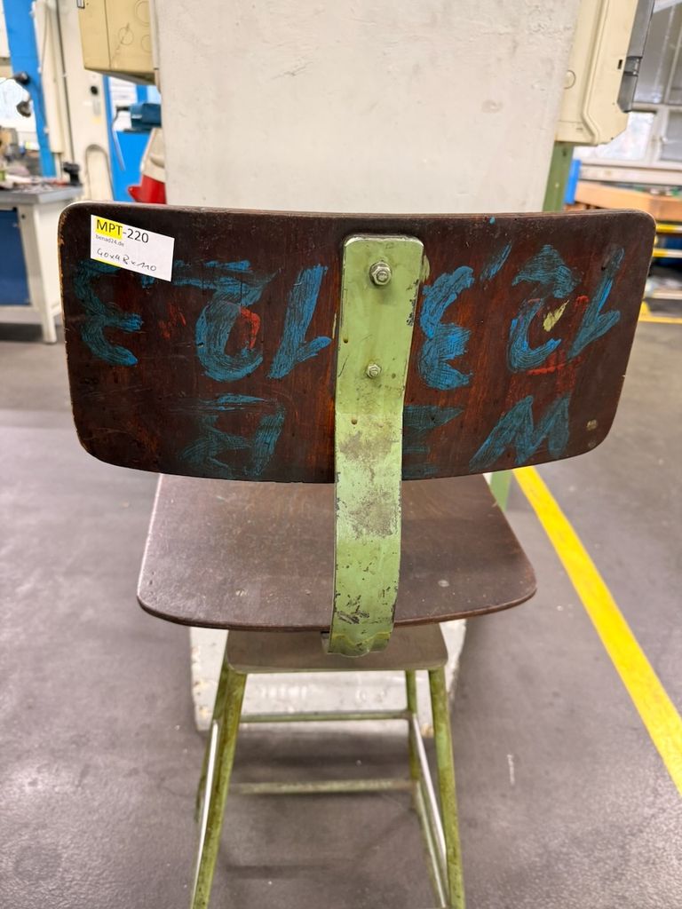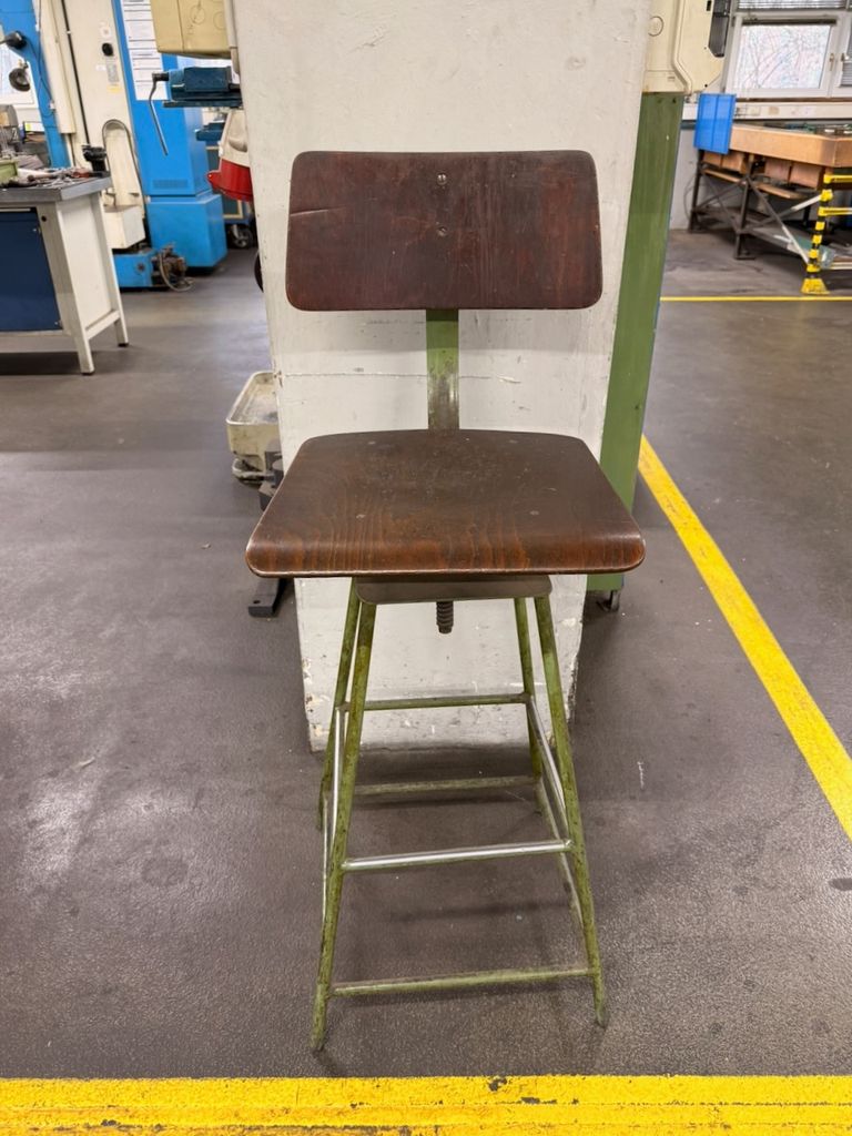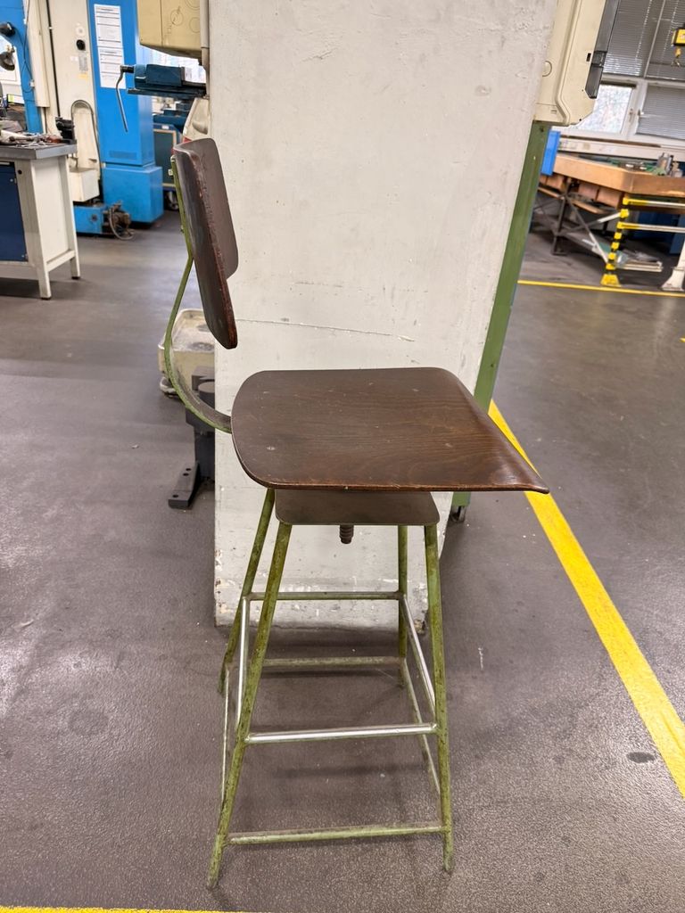 Originaler Werkstattstuhl aus Industrieumfeld mit Stahlgestell und Holzsitzfläche sowie Holzrückenlehne. Höhenverstellung über Gewindespindel. Gebrauchter Zustand mit deutlichen alters- und nutzungsbedingten Gebrauchsspuren (Patina, Lackabrieb), technisch funktionsfähig. Geeignet als Sitzmöbel im Loft-/Industrial-Bereich oder für Werkstatt und Atelier.