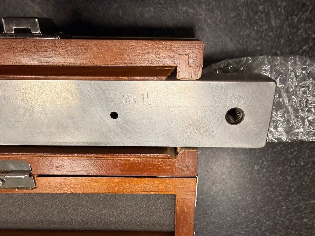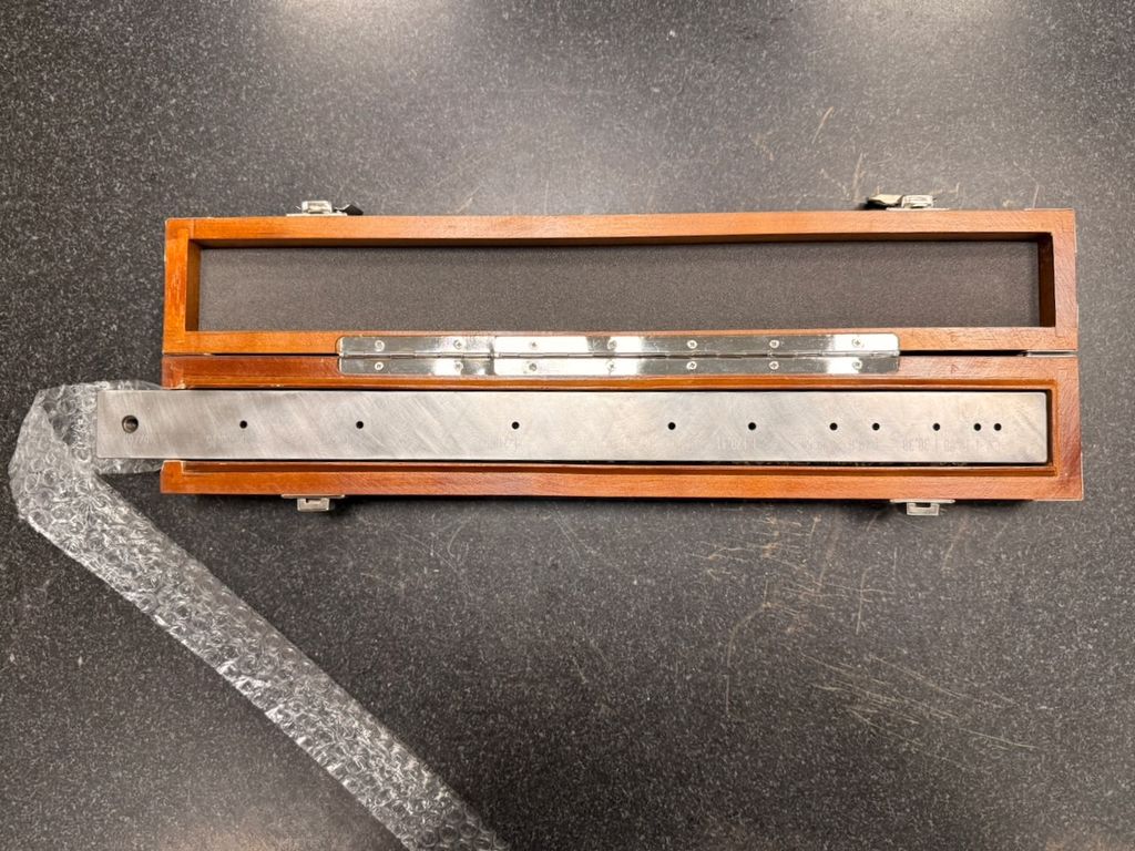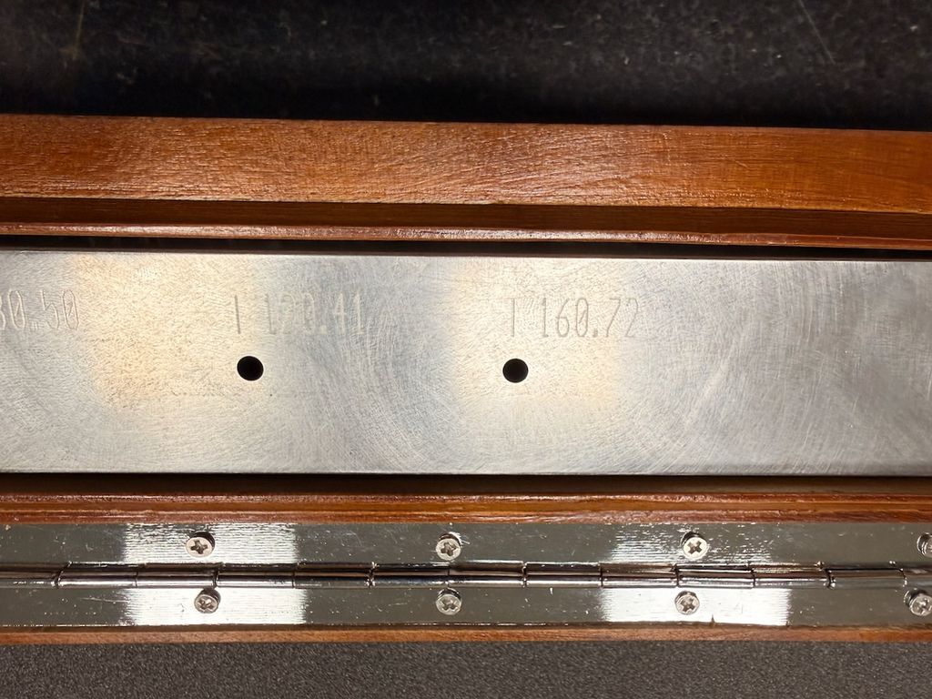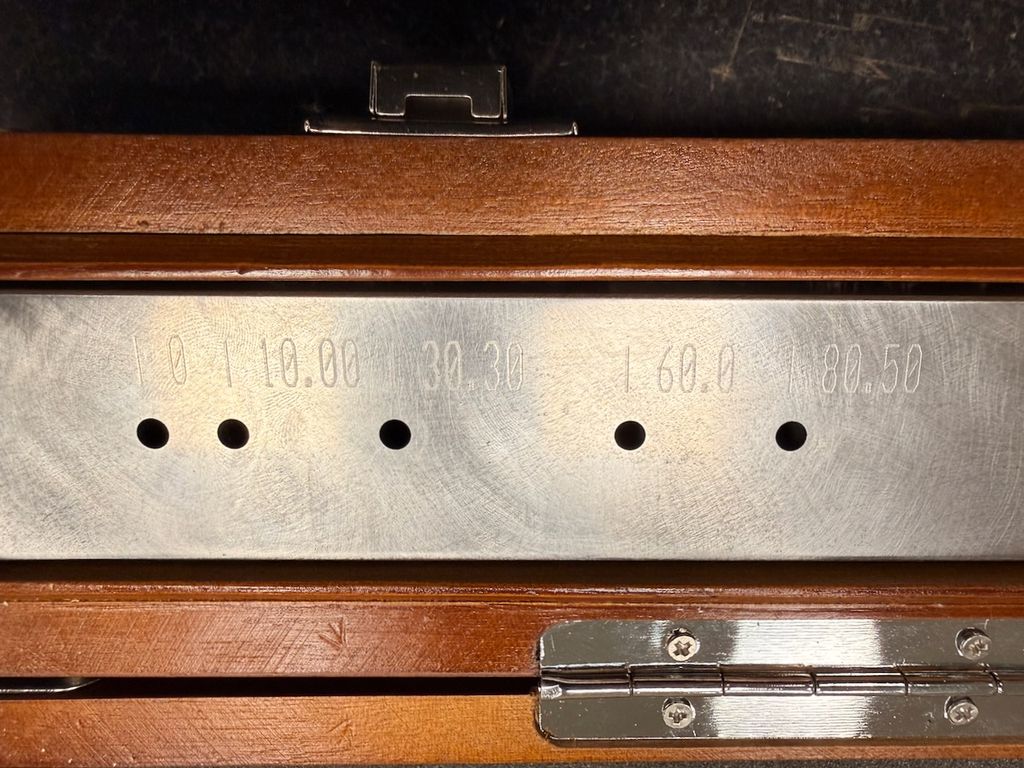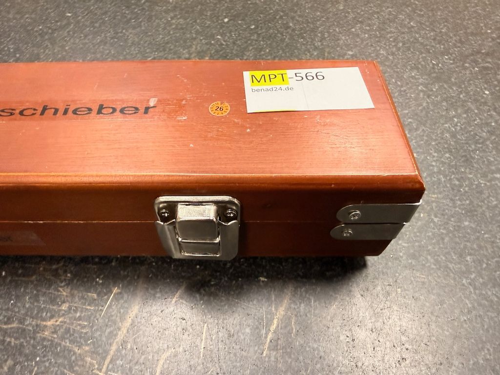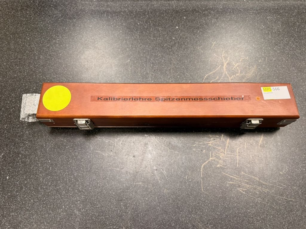 Kalibrierlehre für Spitzenmessschieber im Holzetui.