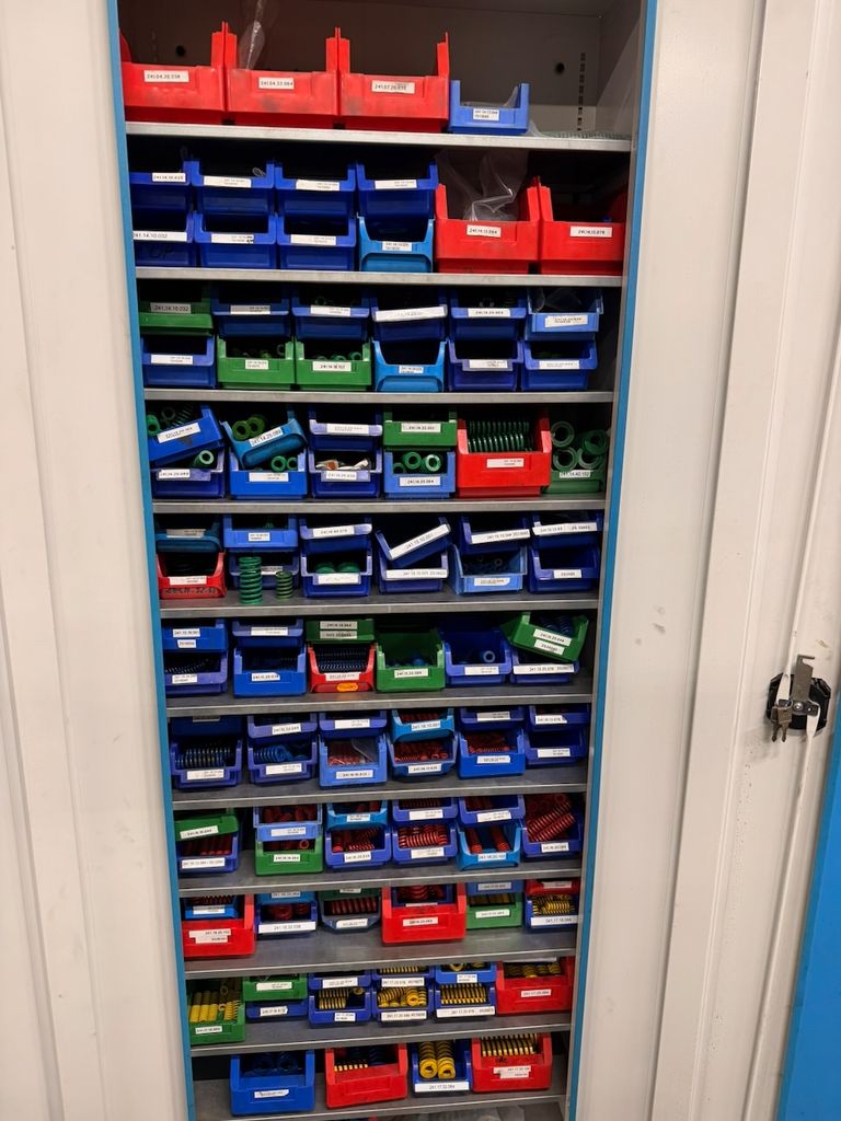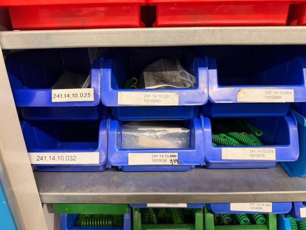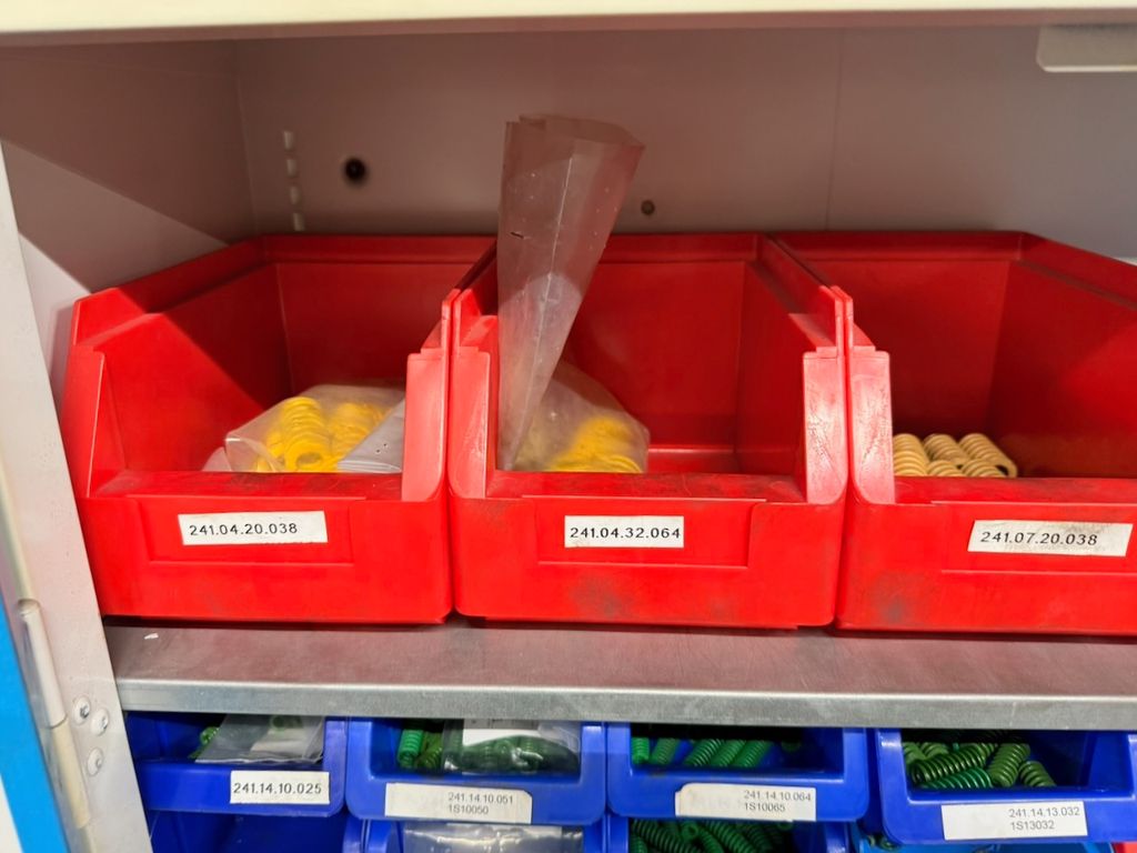 Mehrere Durchmesser- und Längenabstufungen vorhanden, systematisch in Lagersichtbehältern gelagert.
