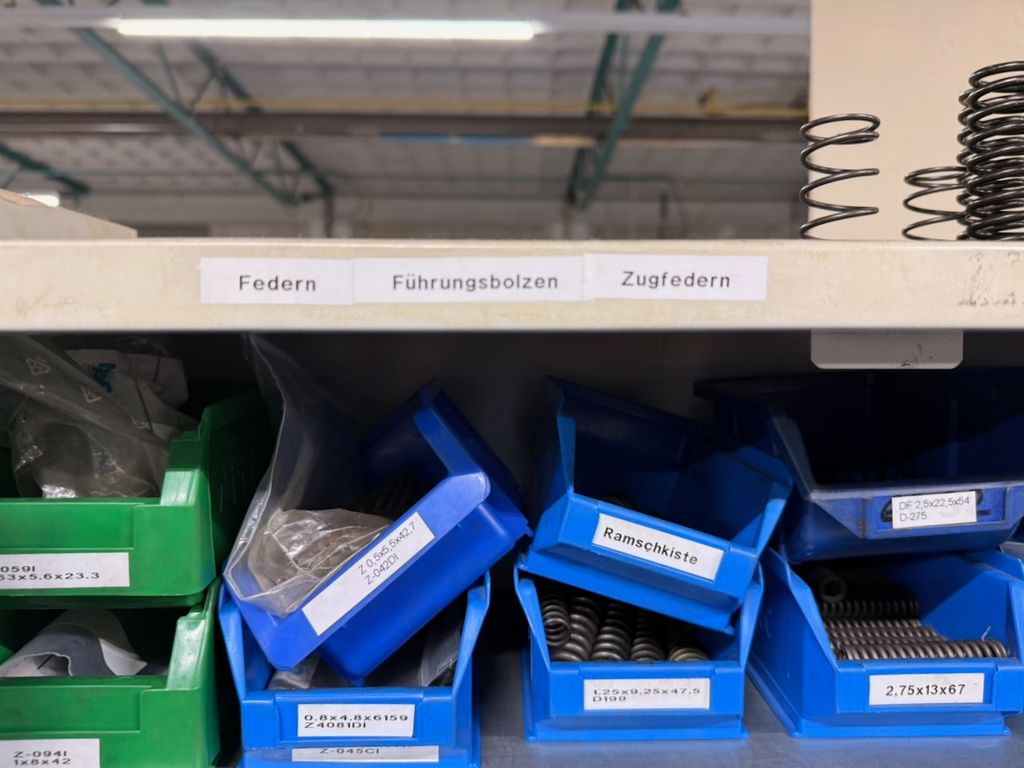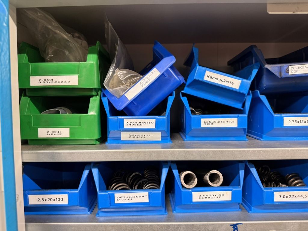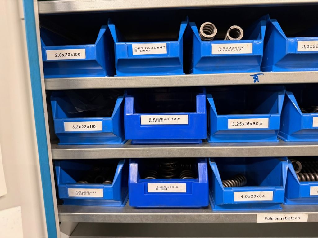 Bestand an zylindrischen Druckfedern, gelagert in ca. 30 Lagersichtbehältern.