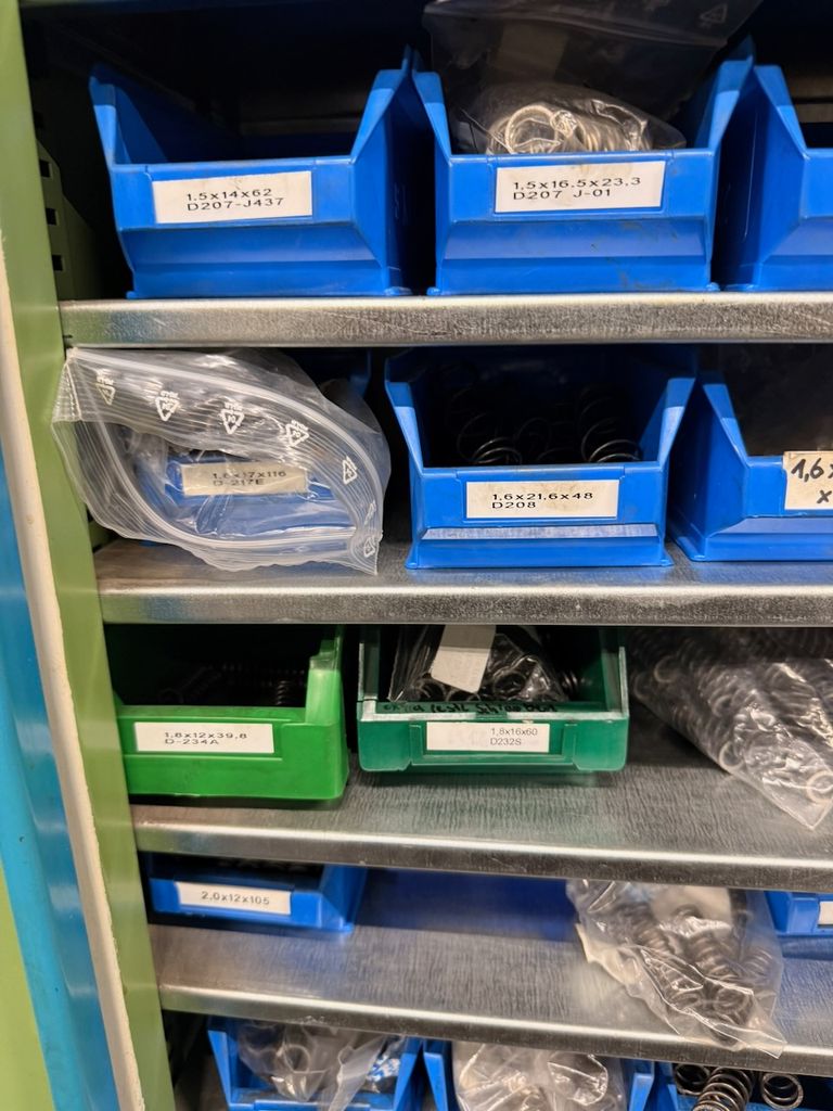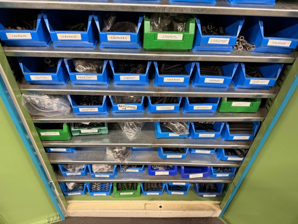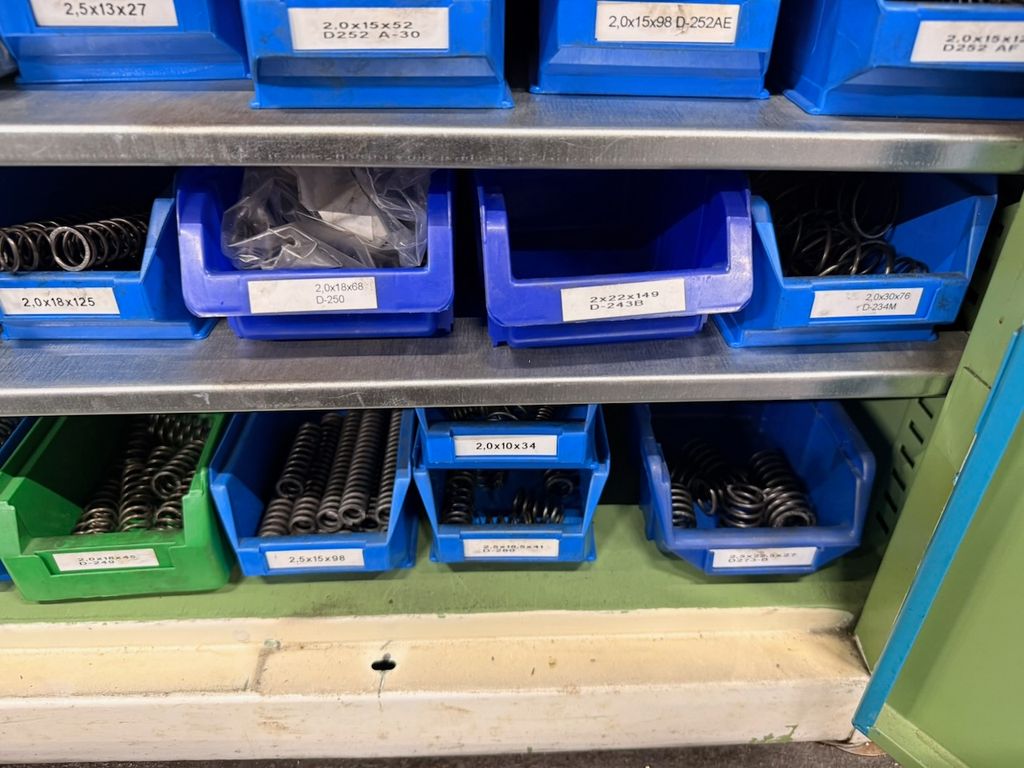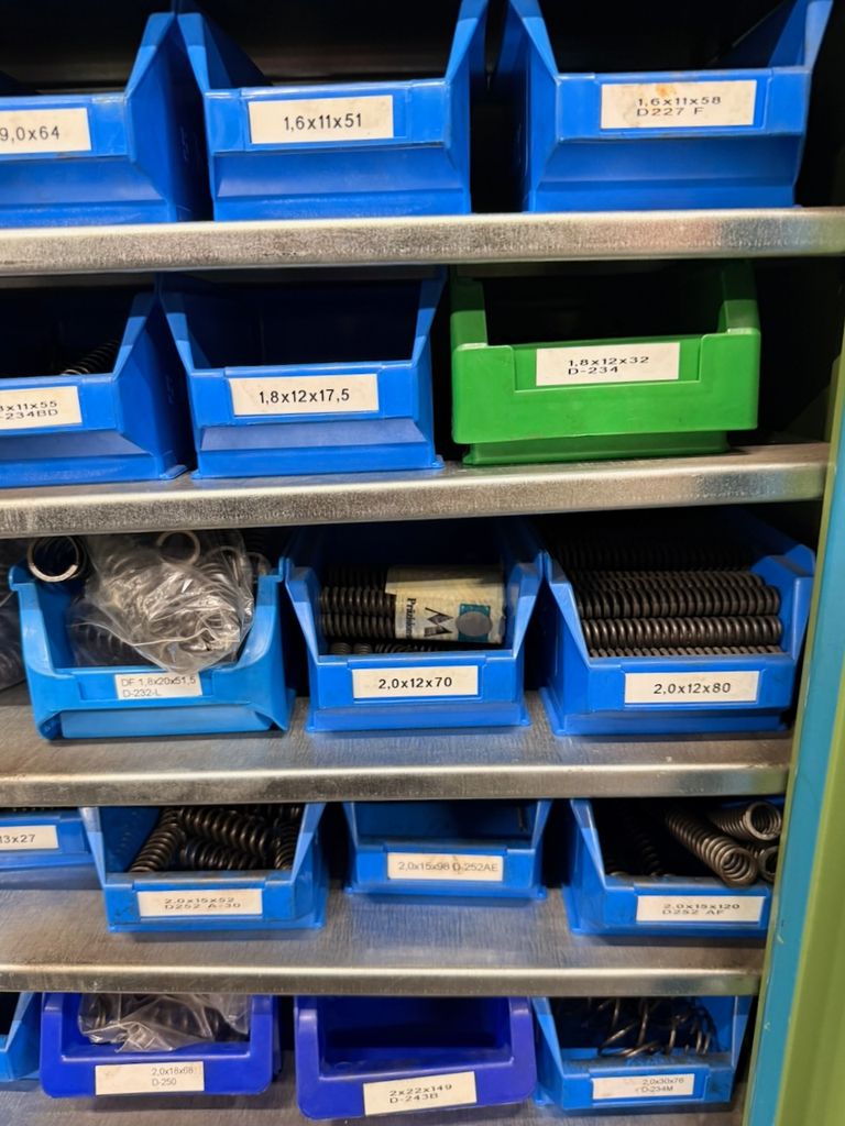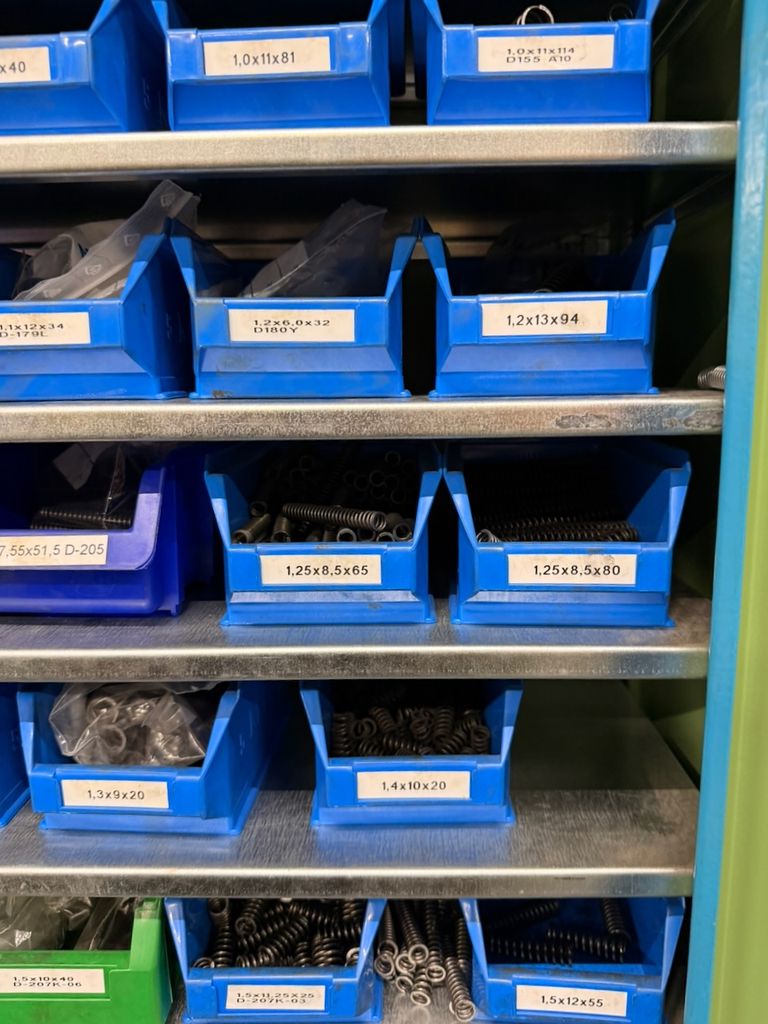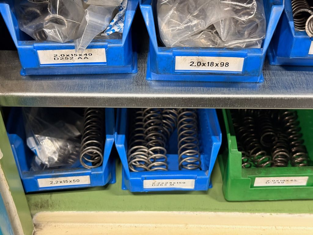 Umfangreicher Bestand an zylindrischen Druckfedern, systematisch gelagert in ca. 115 Lagersichtbehältern.