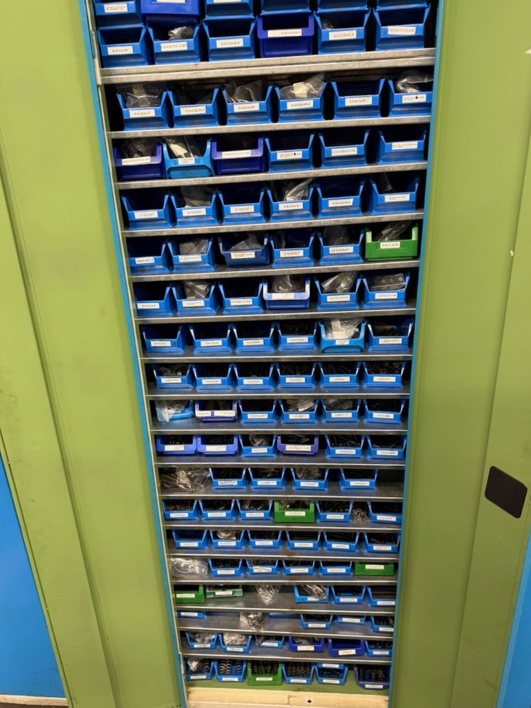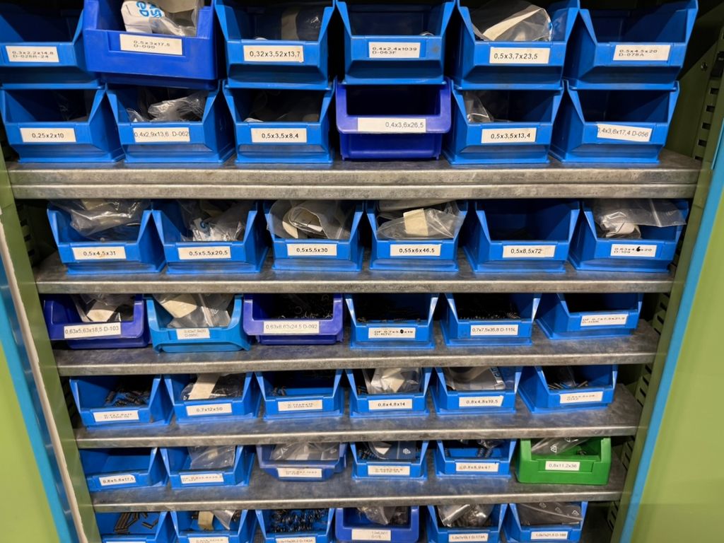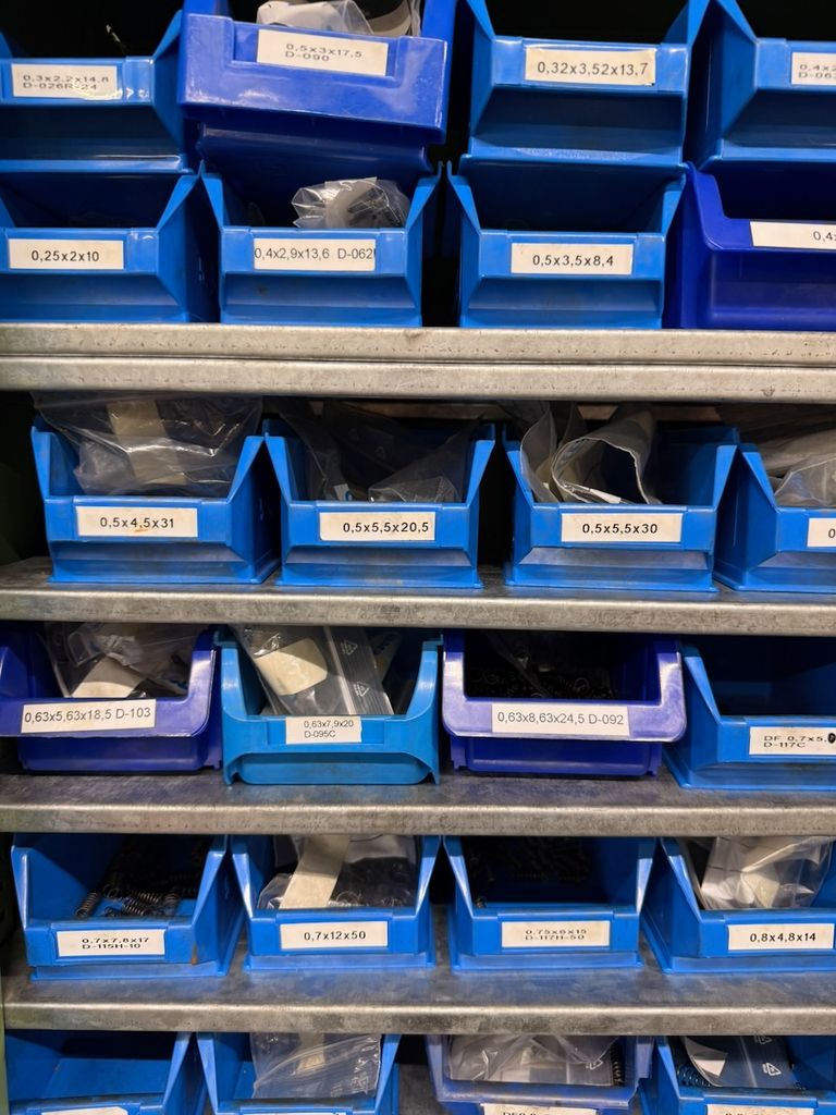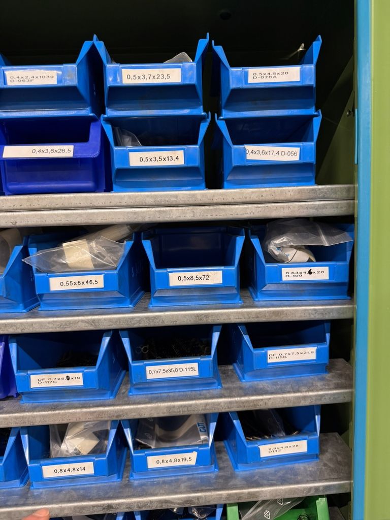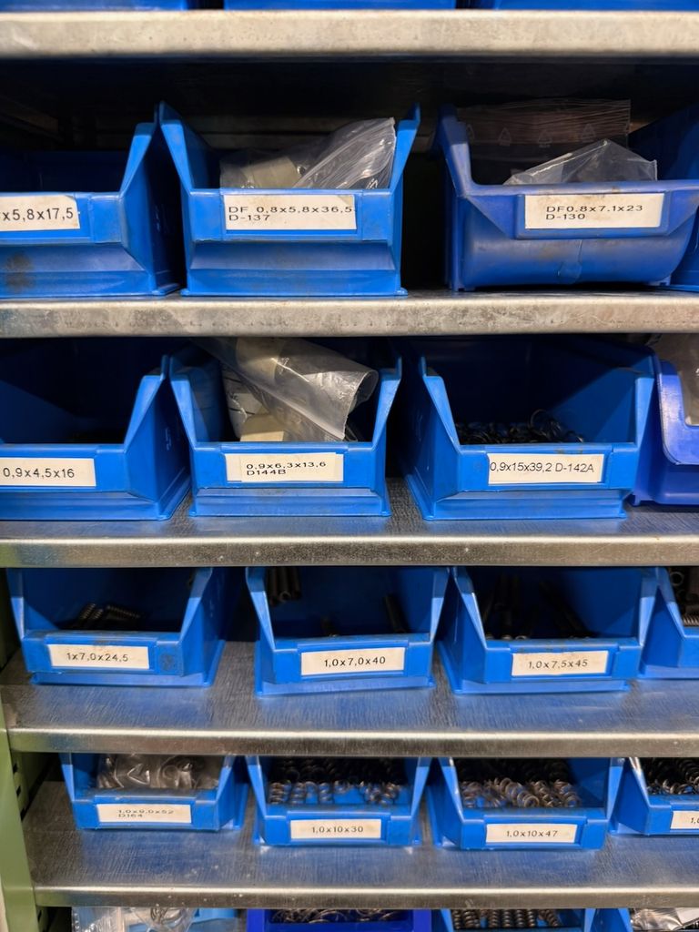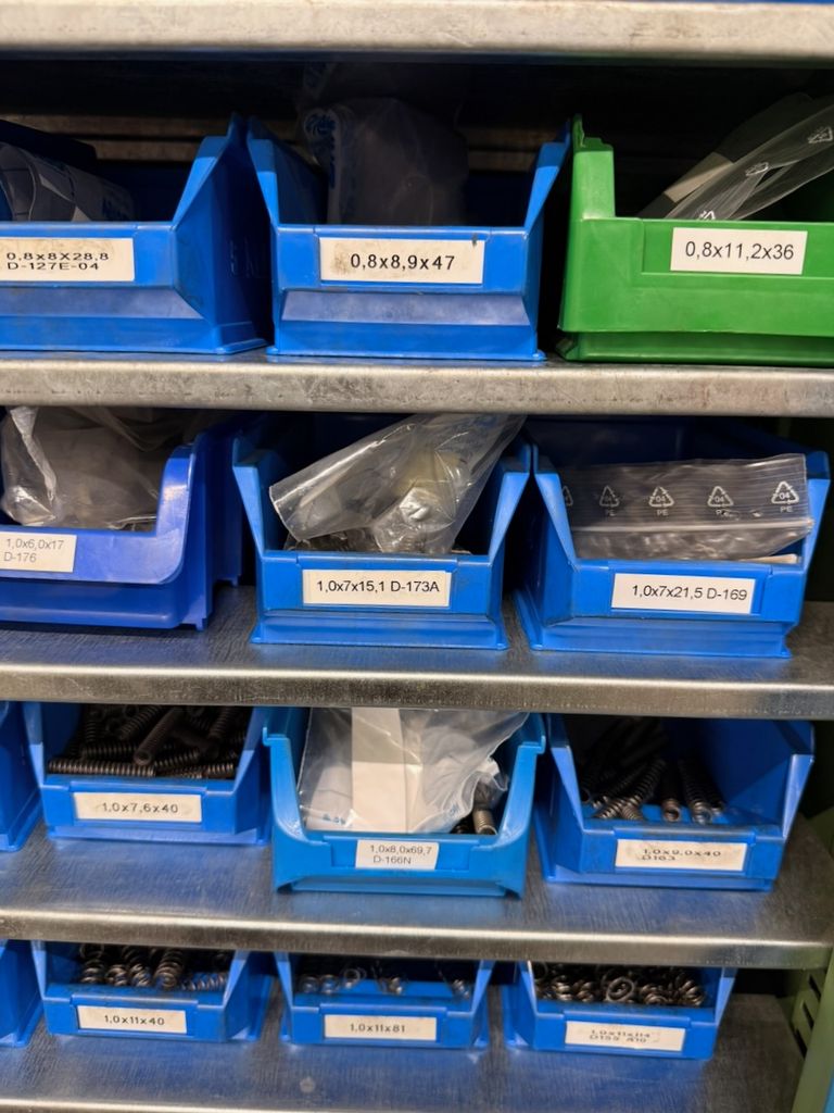 Umfangreicher Bestand an zylindrischen Druckfedern, systematisch gelagert in ca. 115 Lagersichtbehältern.
