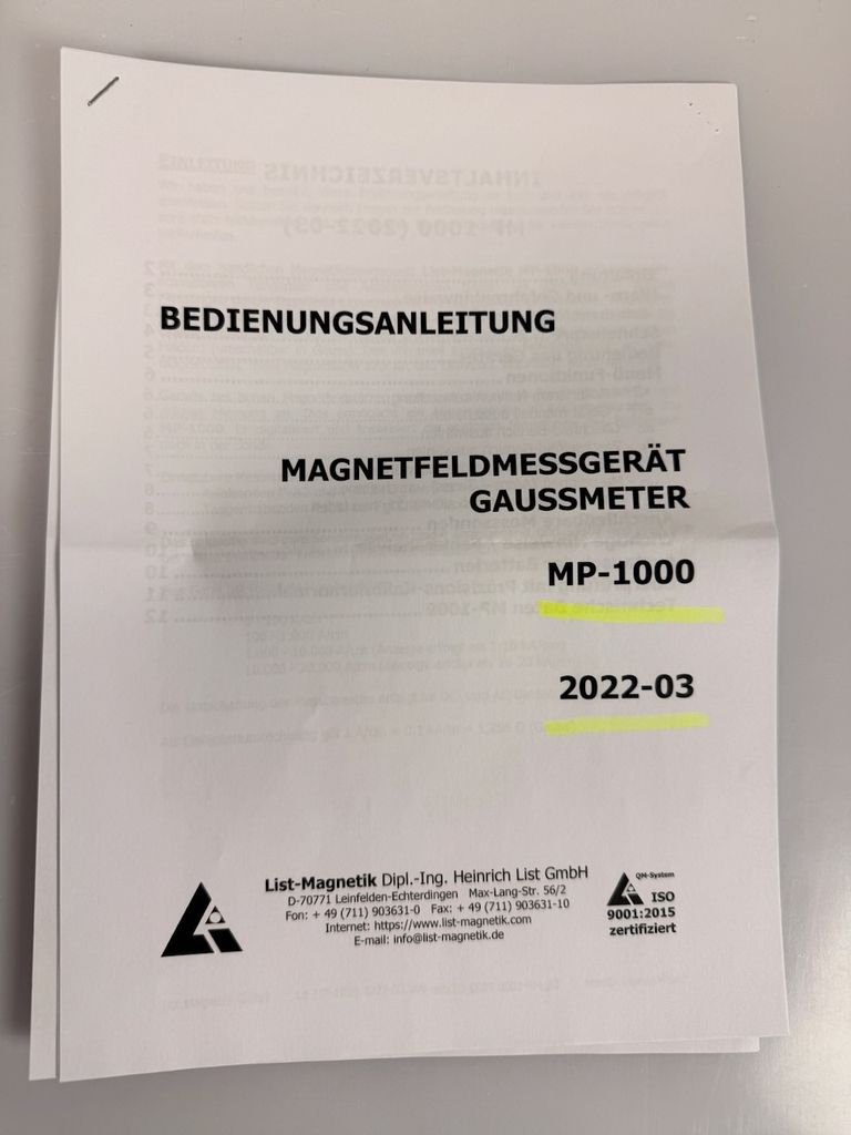 Magnetfeldmessgerät (Gaussmeter) Typ MP-1000 von LIST-MAGNETIK GmbH.