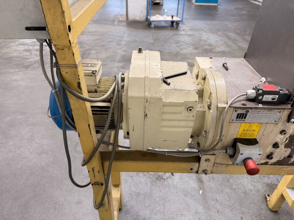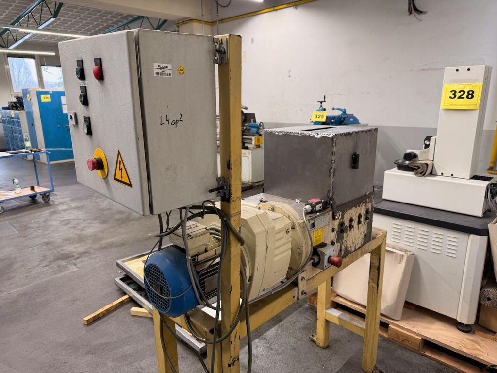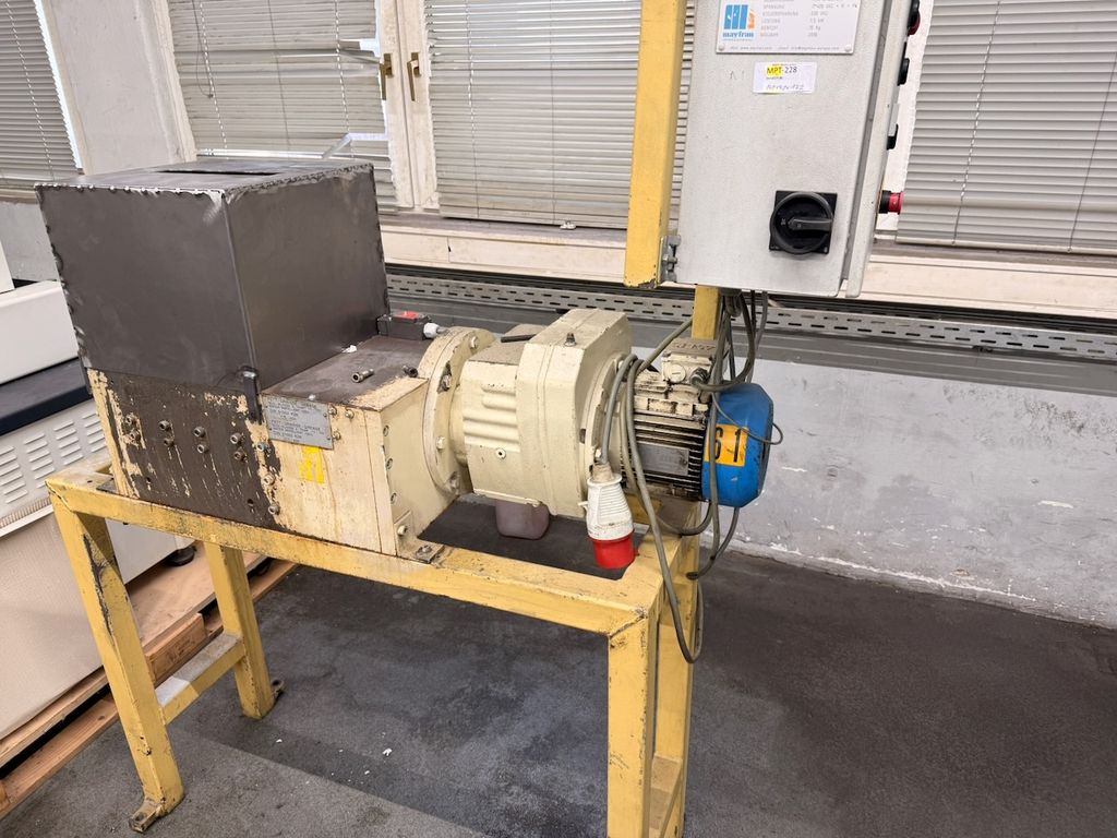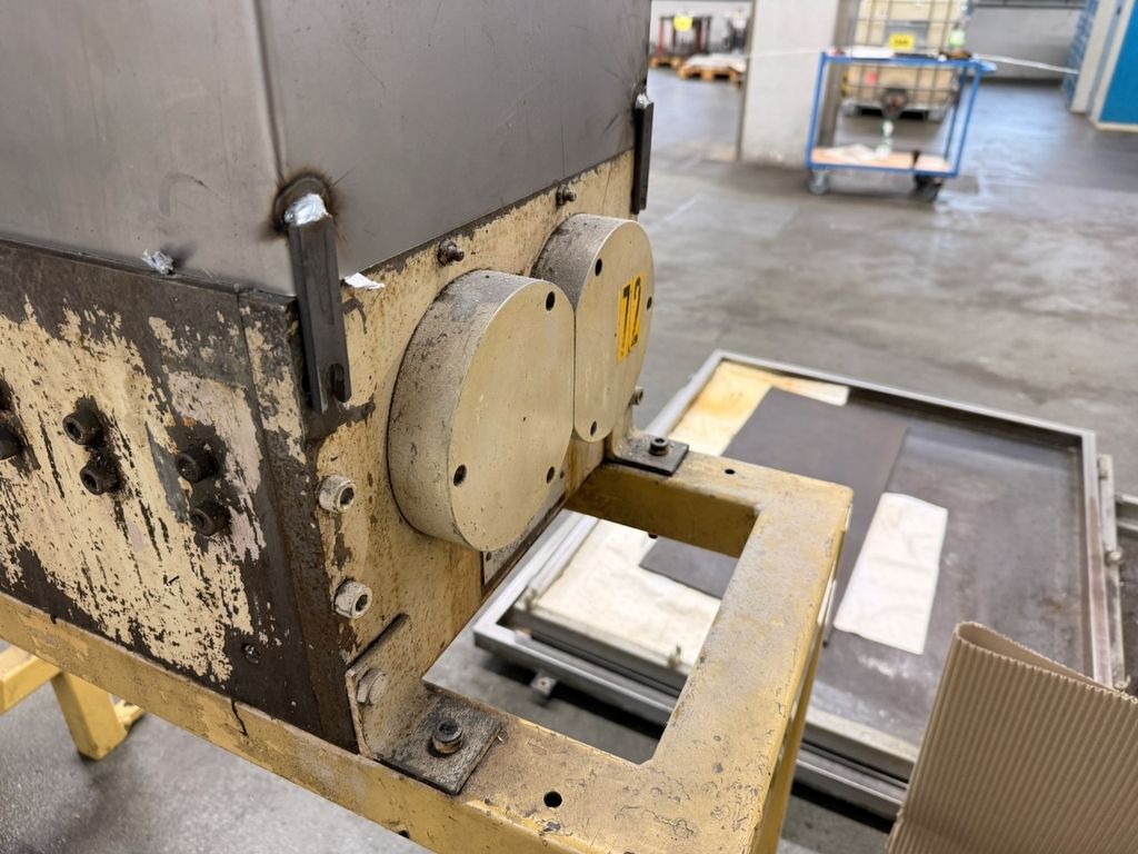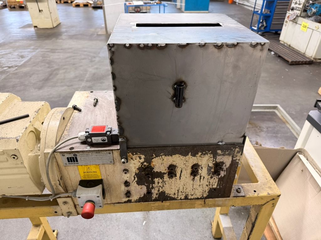 Industrie-Brecher von Mayfran zur Zerkleinerung von Spänen bzw. Produktionsabfällen. Massive Bauweise, montiert auf Stahluntergestell. Antrieb über Elektromotor mit Getriebe, separate Schaltschranke mit Not-Aus und Bedienelementen vorhanden.