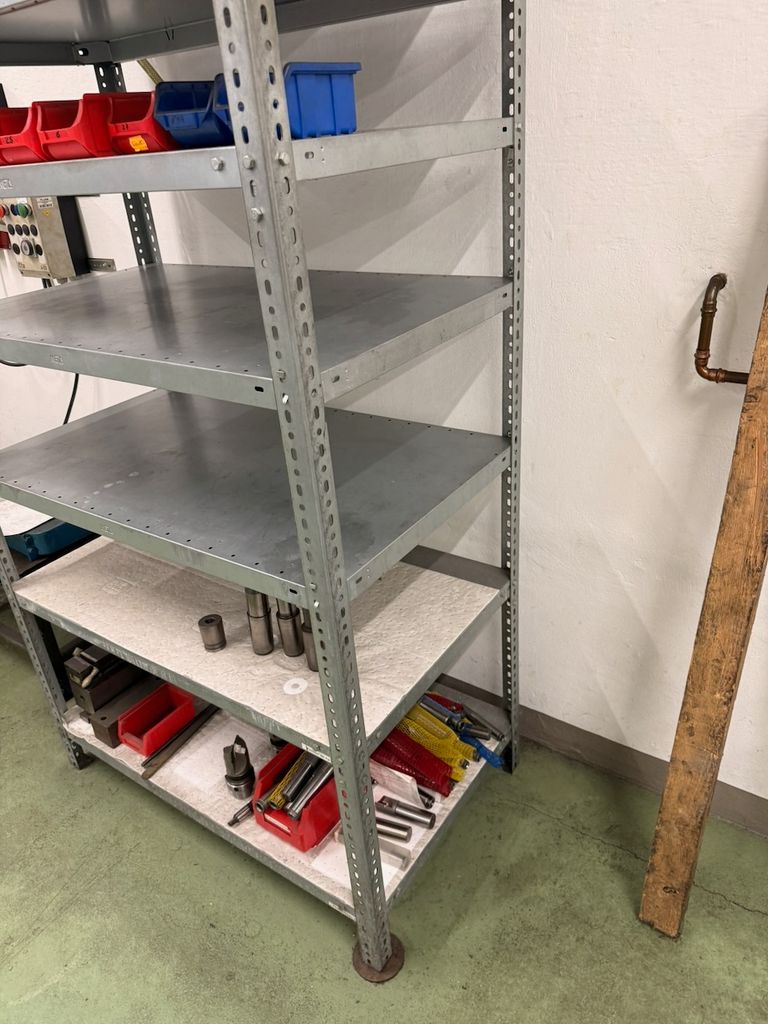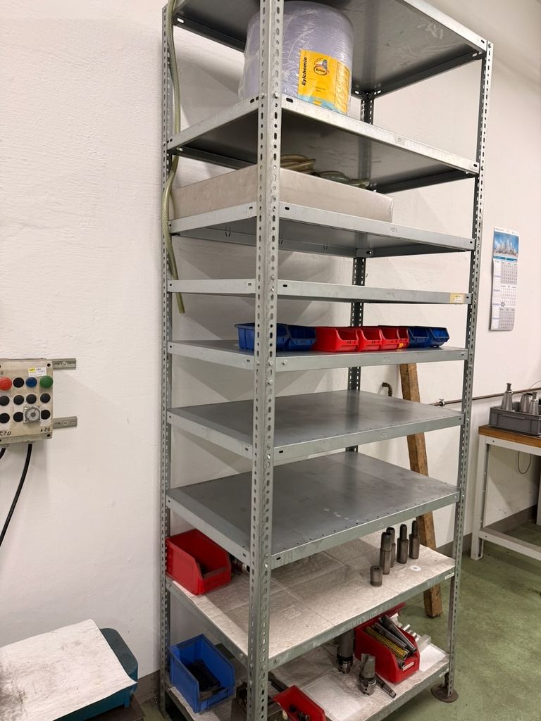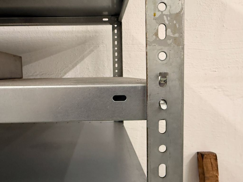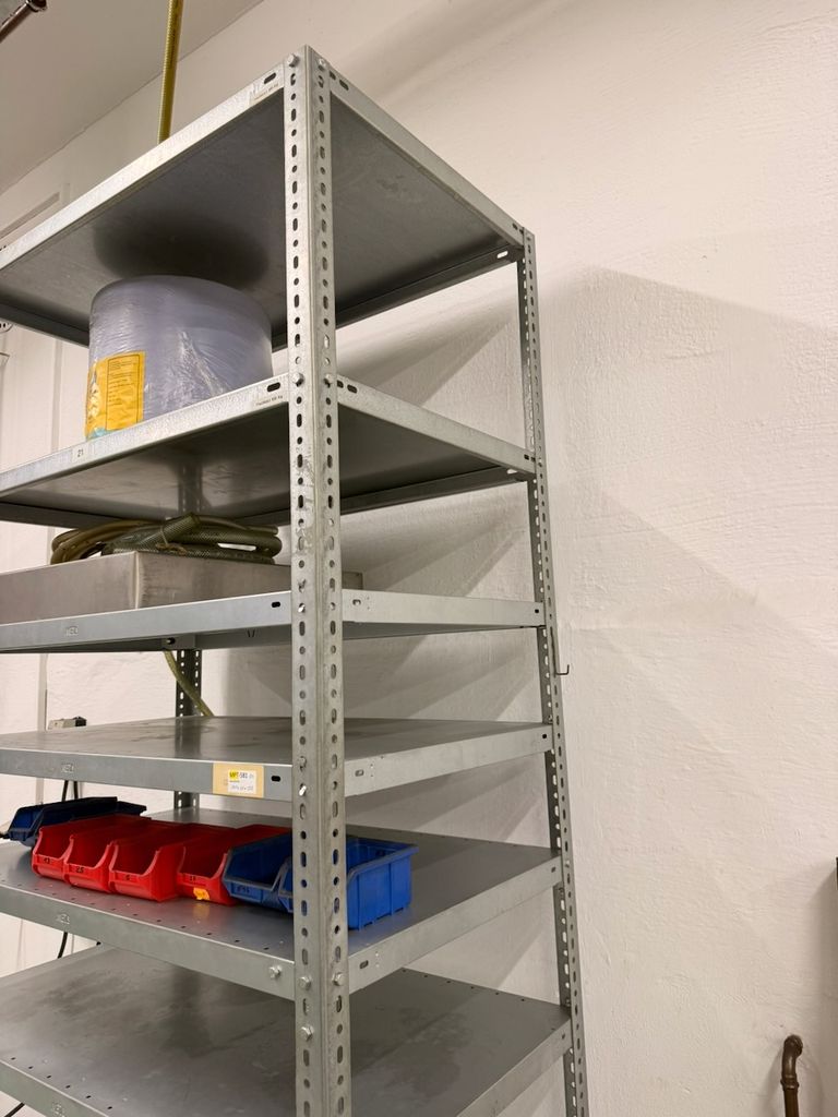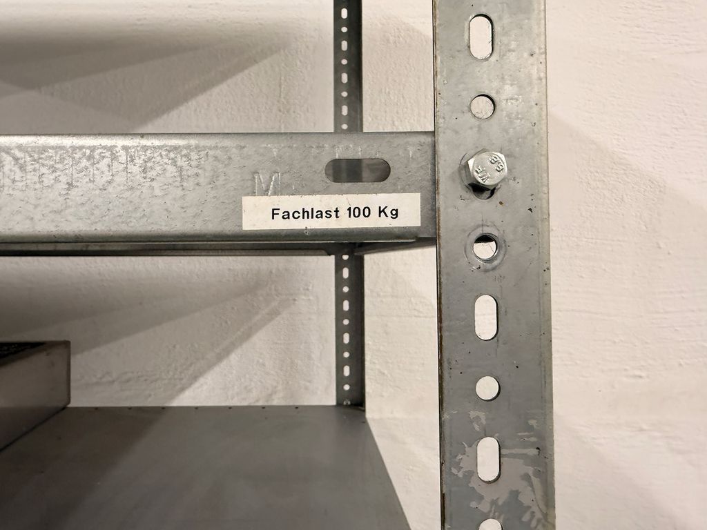 Die Regale bestehen aus verzinkten Stahlrahmen mit Metall-Fachböden. Teilweise verschraubte, teilweise gesteckte Ausführung.