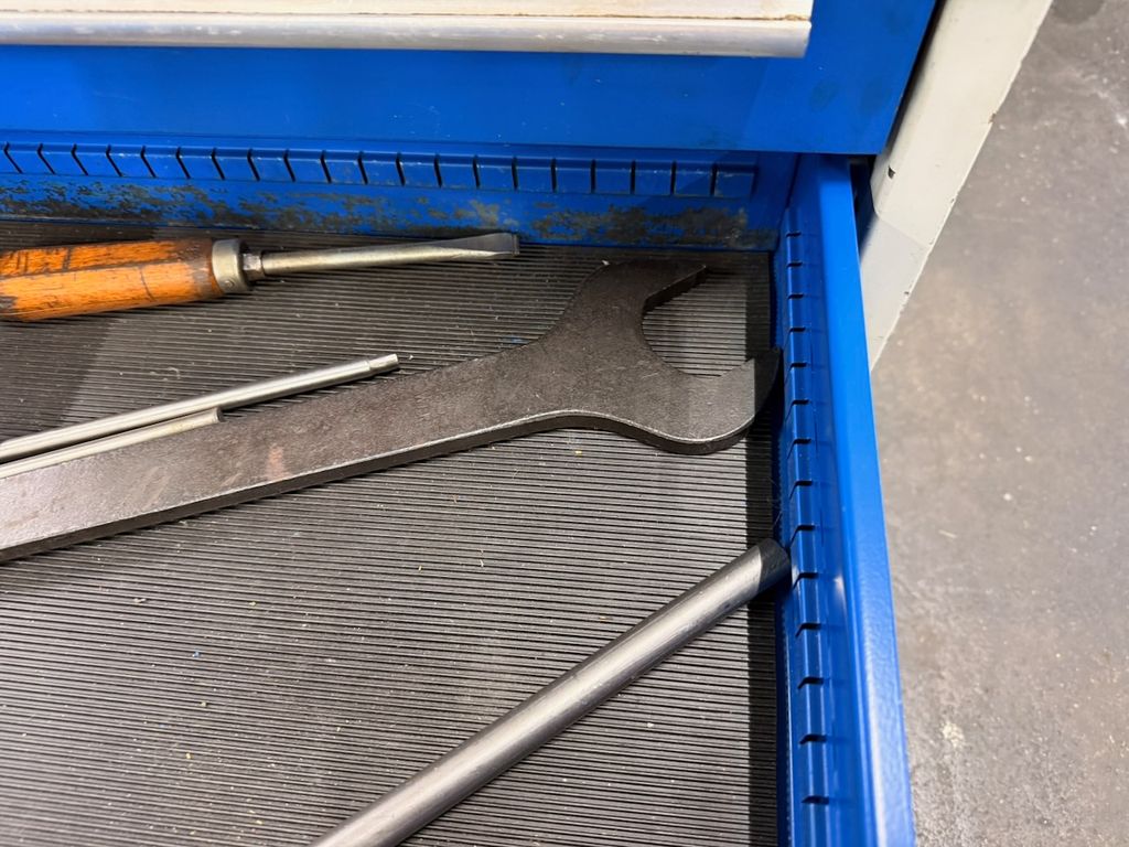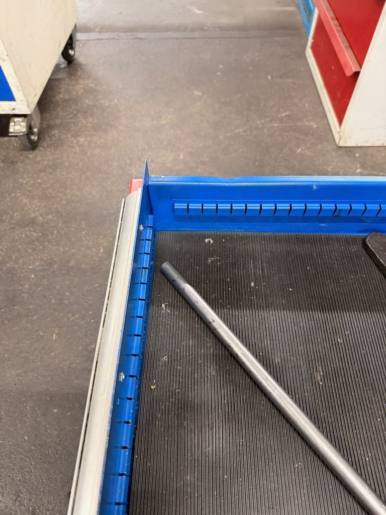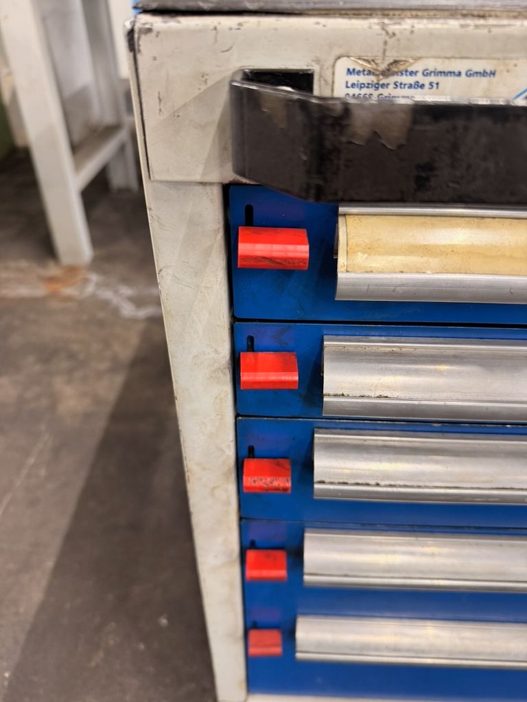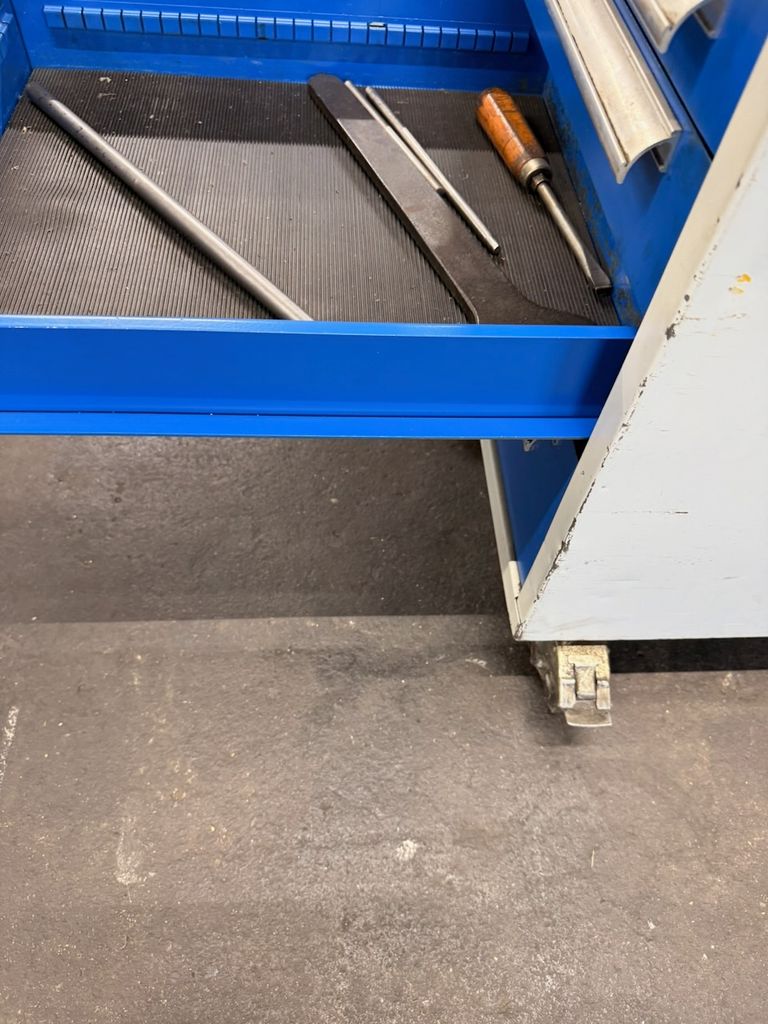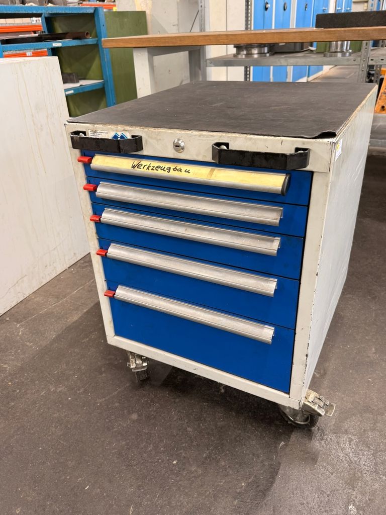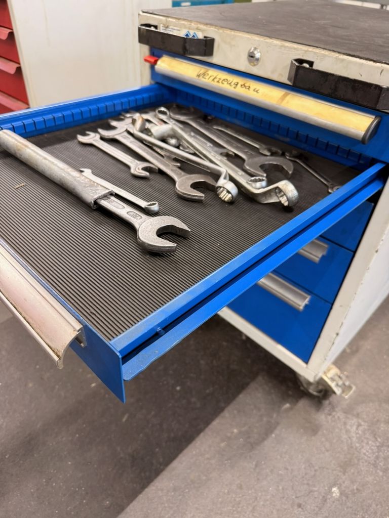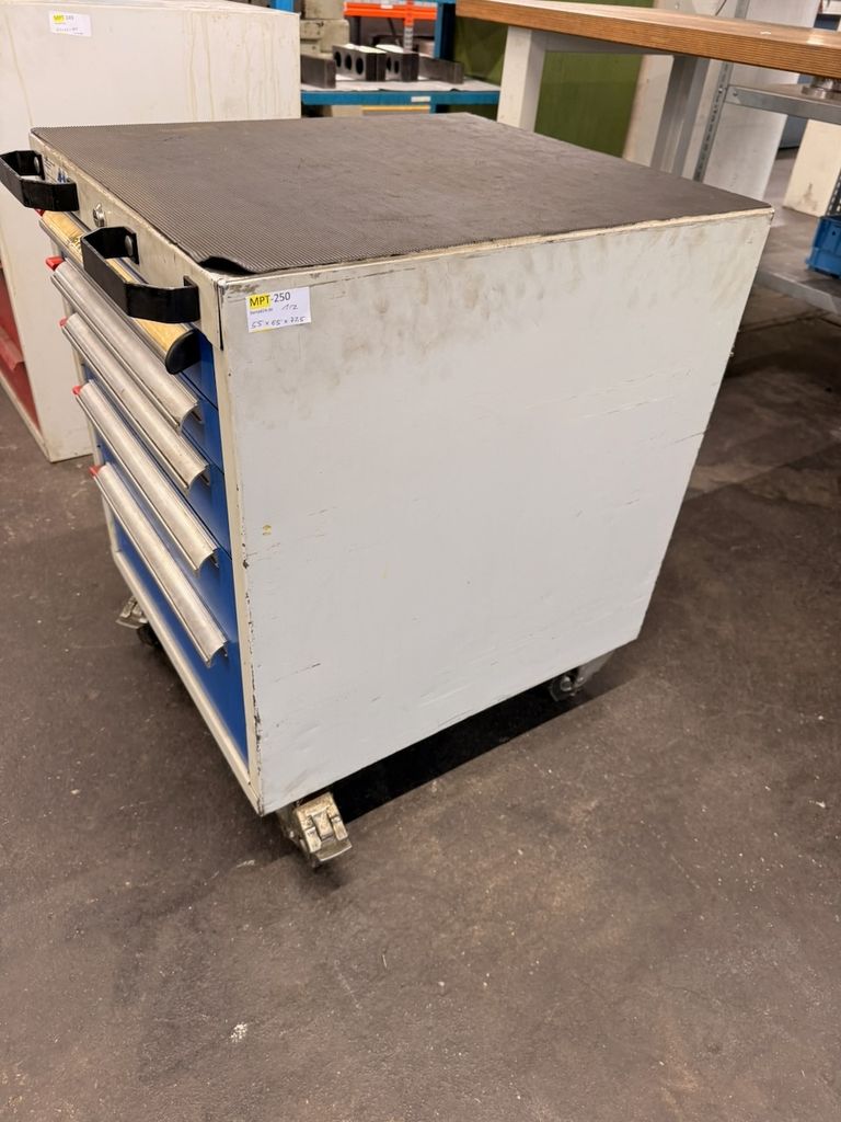 Mobiler Werkzeugwagen in stabiler Stahlausführung mit 5 Schubladen. Der Wagen ist fahrbar und mit Rollen ausgestattet. Die Schubladen laufen leichtgängig und verfügen über durchgehende Griffleisten. Auf der Oberseite befindet sich eine Gummimatte als Arbeits- und Ablagefläche.