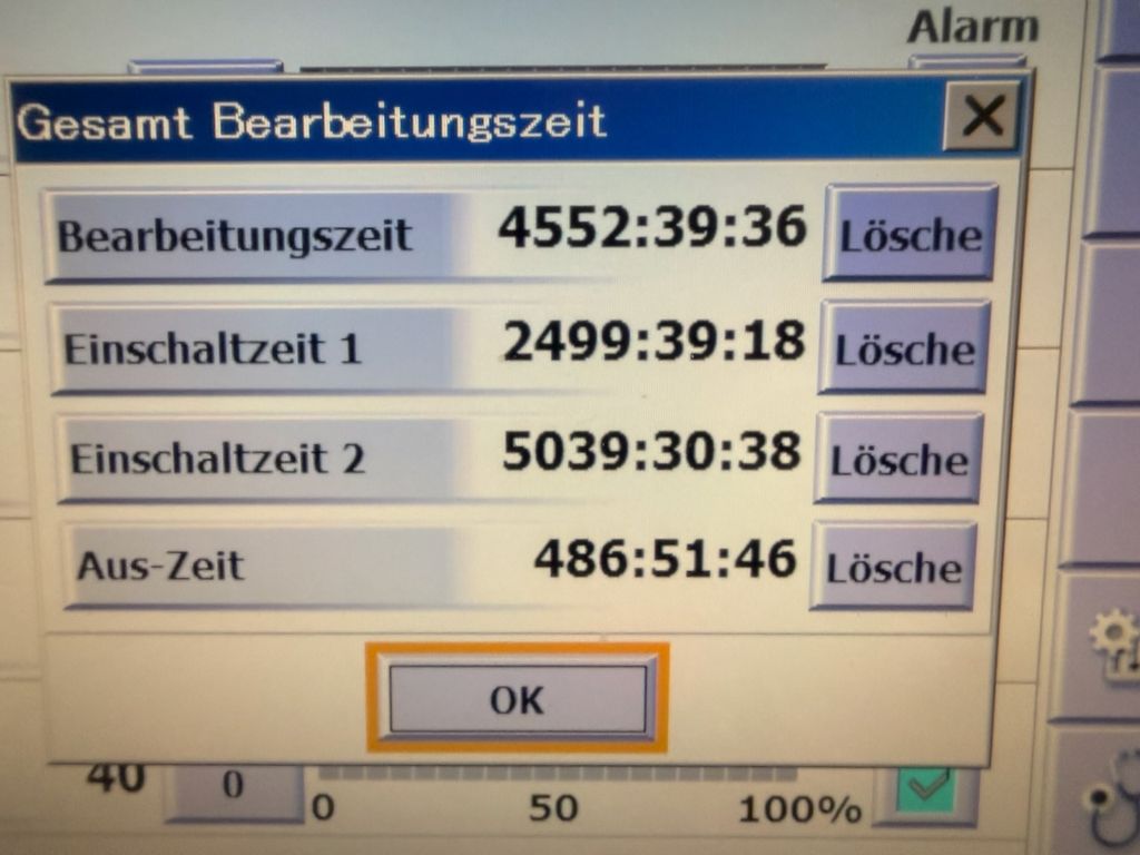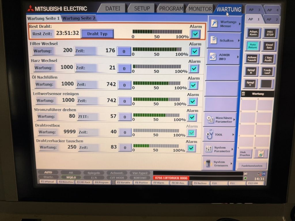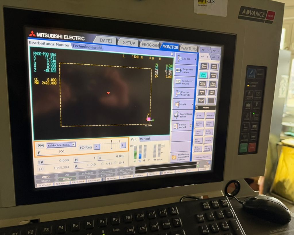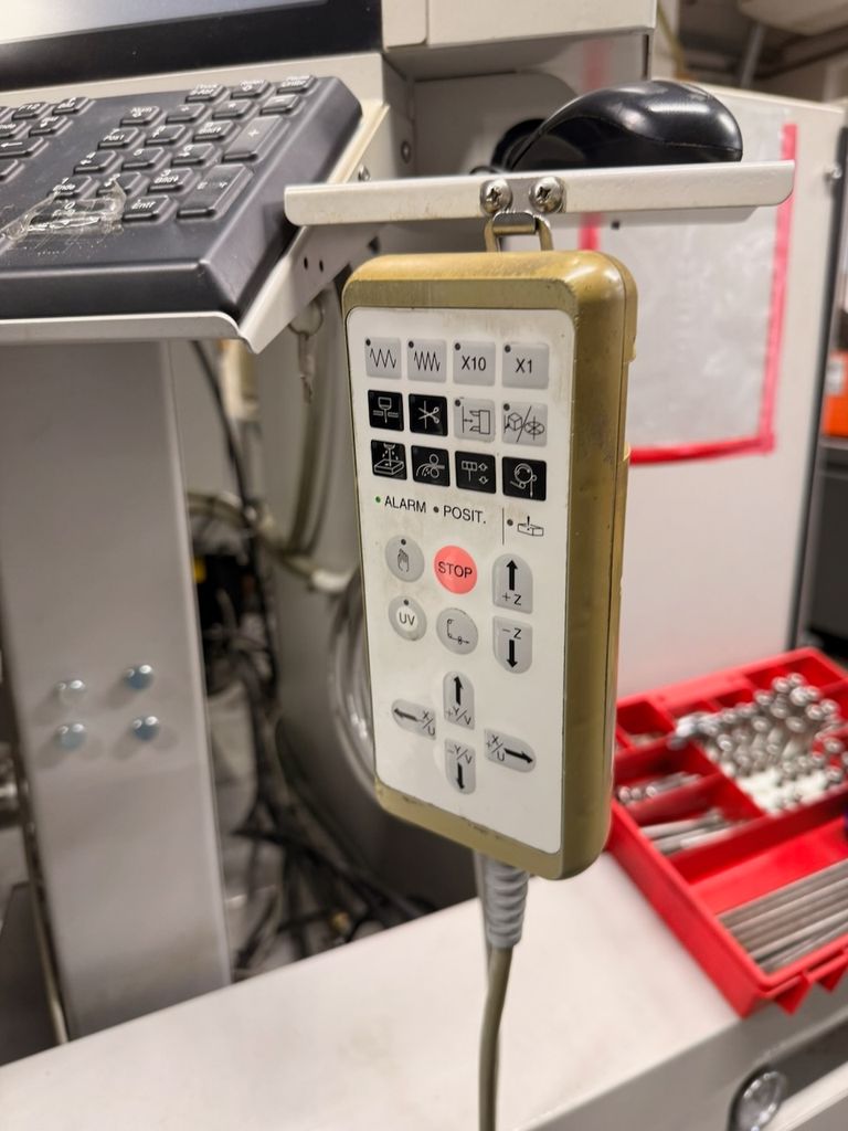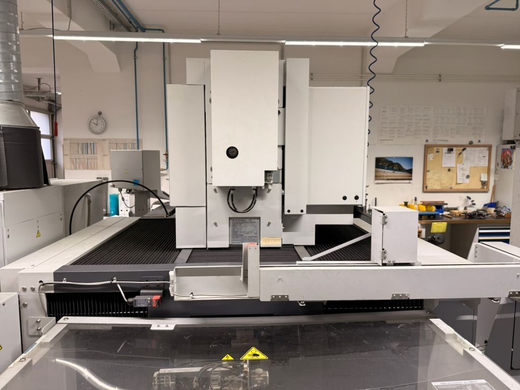 Die Maschine stammt aus produktivem Einsatz und befindet sich in funktionsfähigem, gebrauchten Zustand. Alle relevanten Baugruppen sind vollständig, der Generatorschrank, Steuerung, Drahtvorschub und AT-System (Automatic Threader) sind vollständig vorhanden.