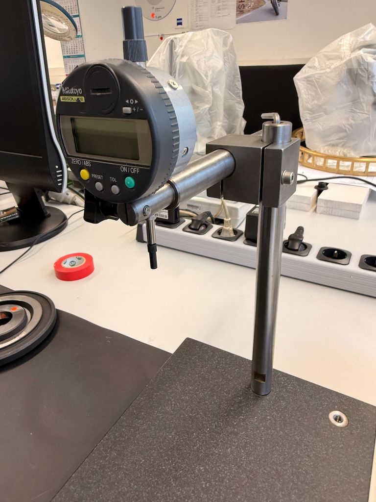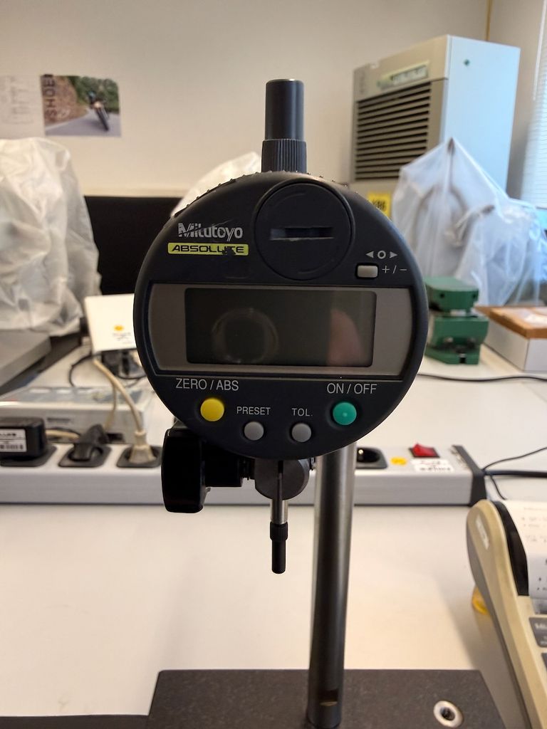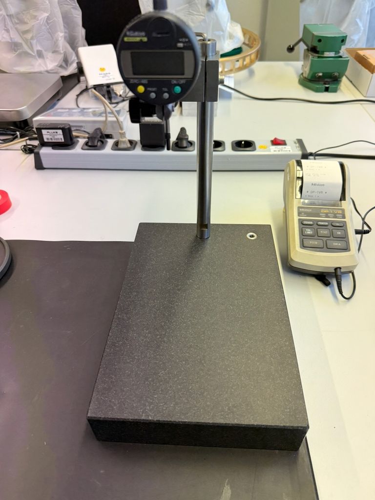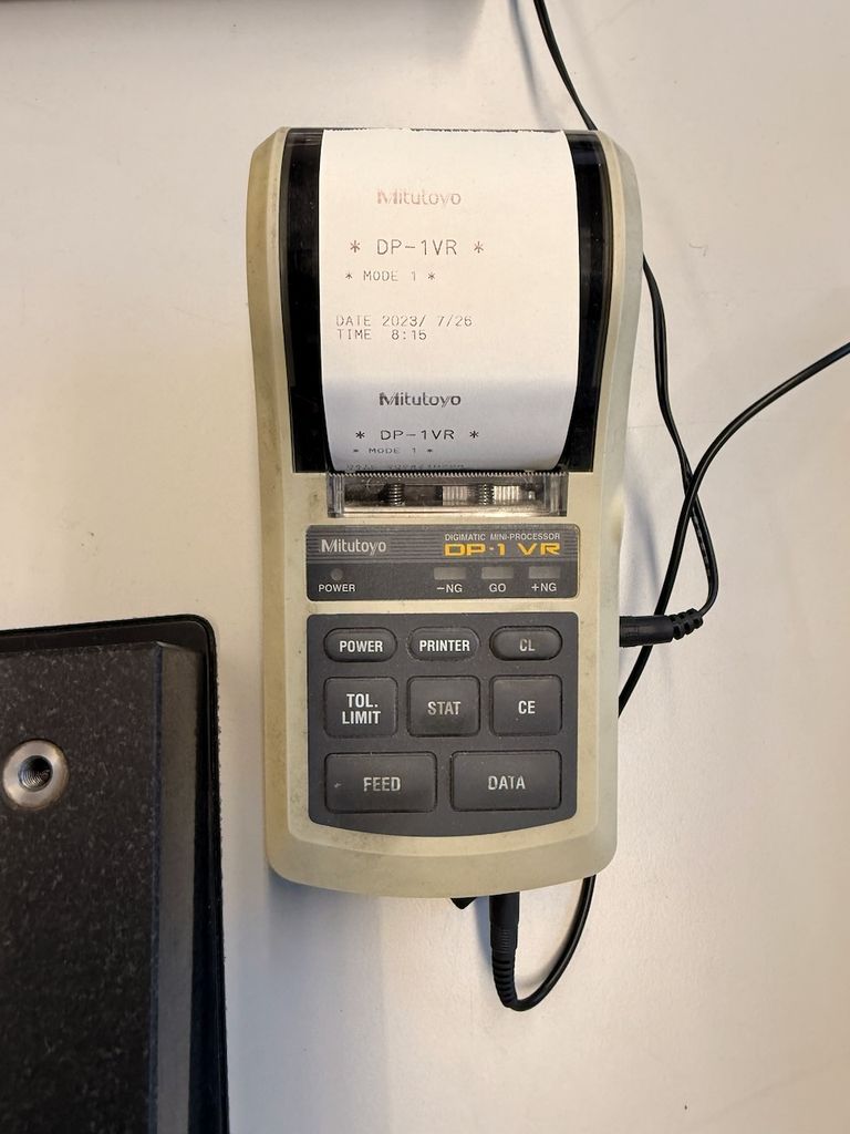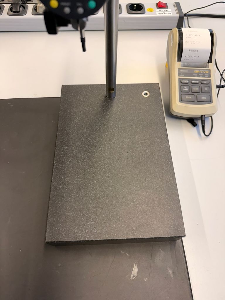 Mitutoyo Digitalmesssystem bestehend aus einer ABSOLUTE Digitalmessuhr ID-C112B, montiert auf einem Messständer mit Granitplatte, inklusive Digimatic Mini-Prozessor DP-1VR mit integrierter Druckfunktion.