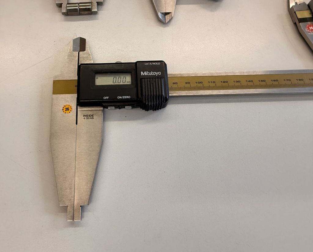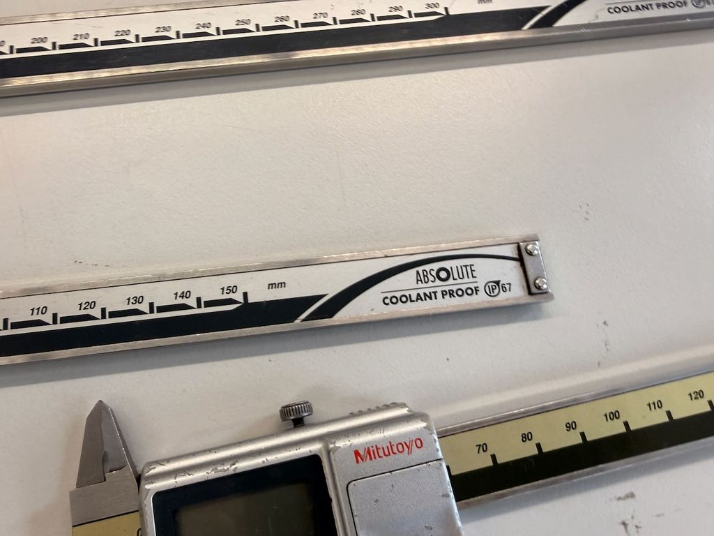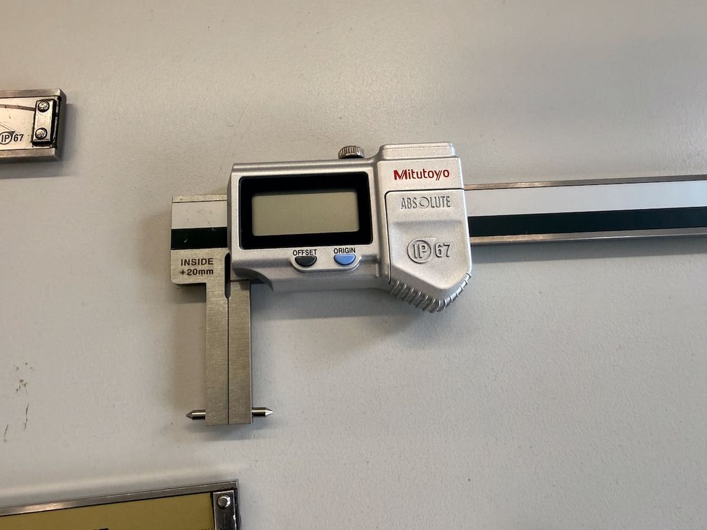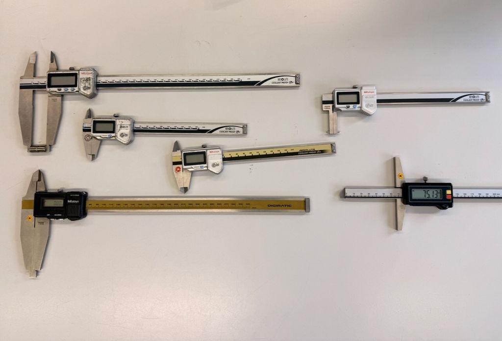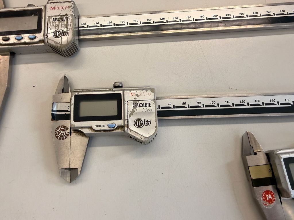 Bei mehreren Geräten handelt es sich um Mitutoyo ABSOLUTE Messschieber, teilweise Coolant Proof (IP66 / IP67). Unterschiedliche Messbereiche (u. a. ca. 150 mm, 200 mm, 300 mm). Ausführungen für Außen-, Innen- und Tiefenmessungen. Teilweise mit Origin-/Zero-Taste, Absolute-System.