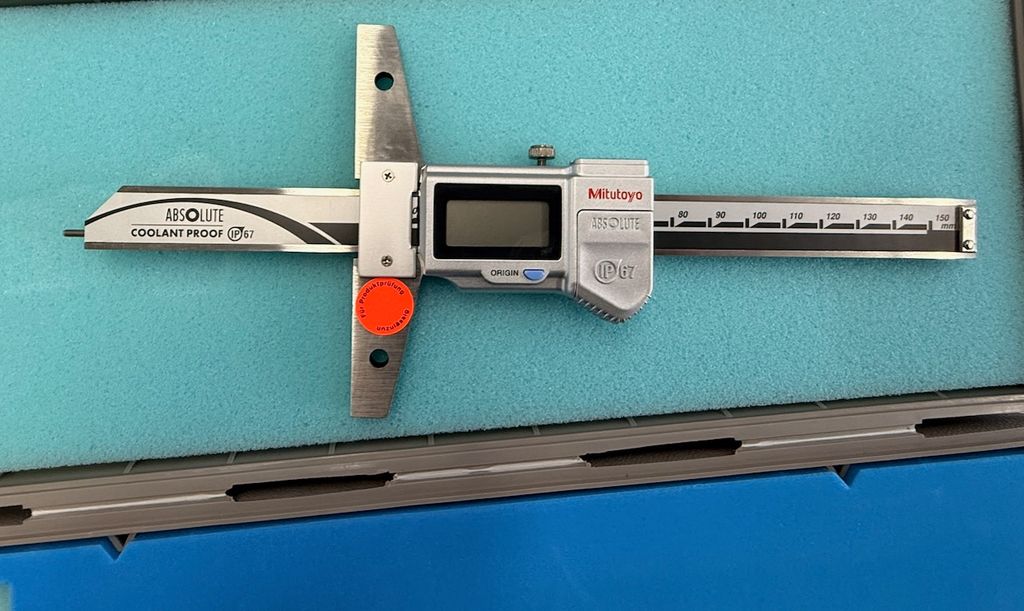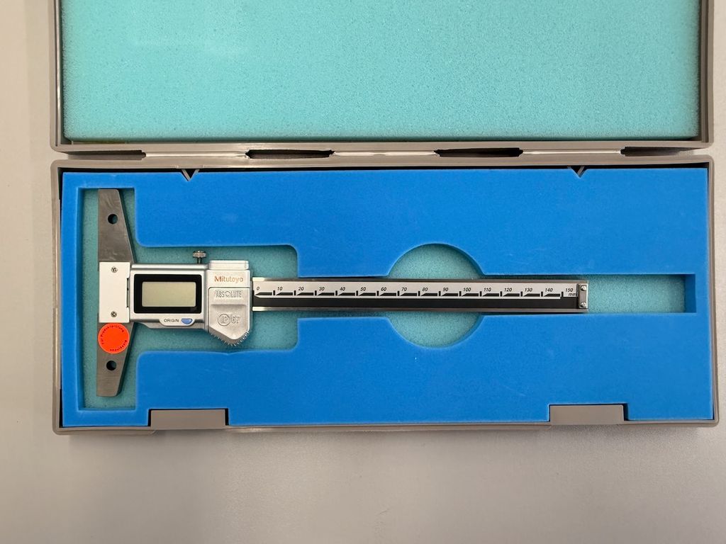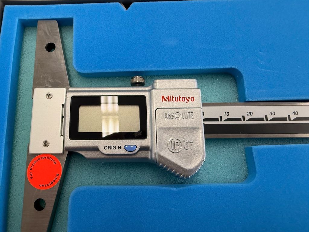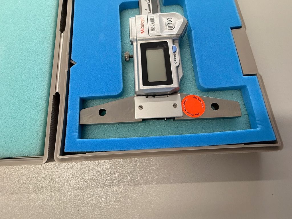 Digitaler Tiefenmessschieber von Mitutoyo mit ABSOLUTE-Messsystem.