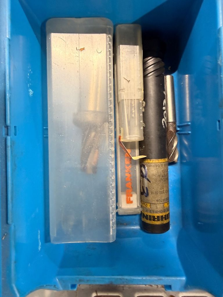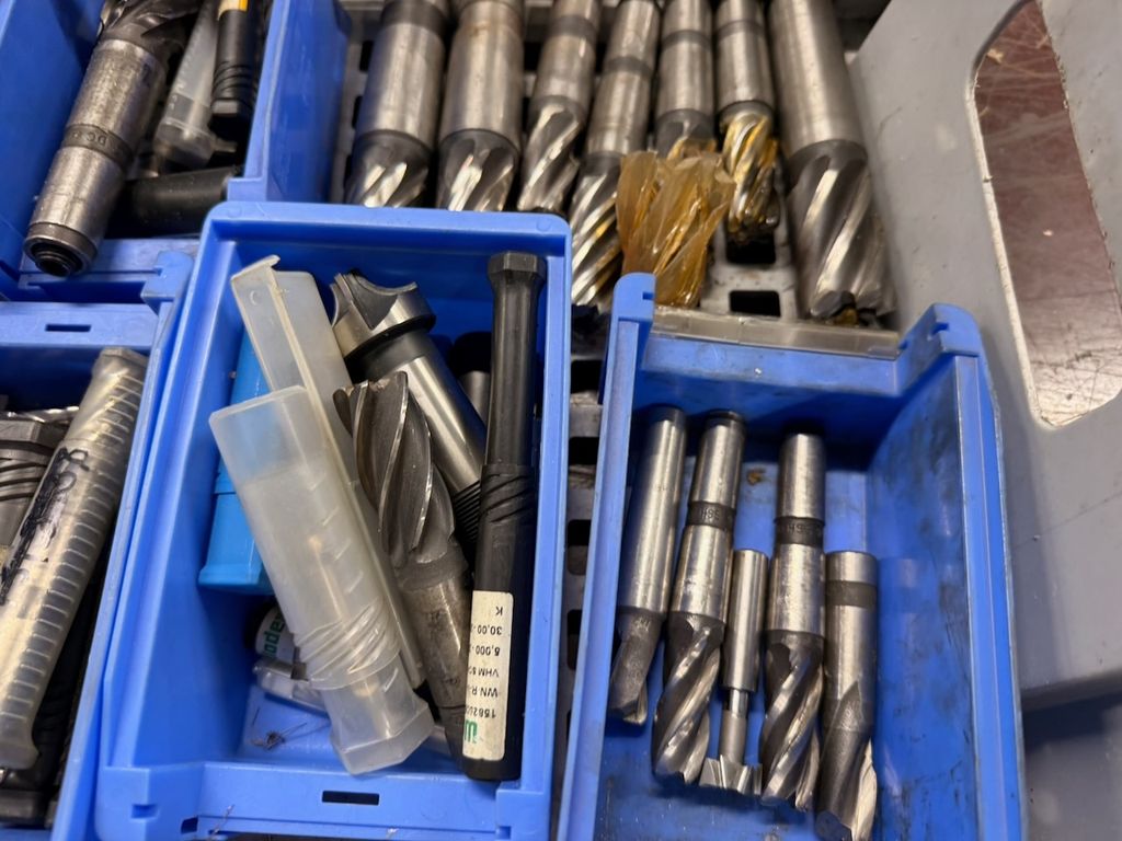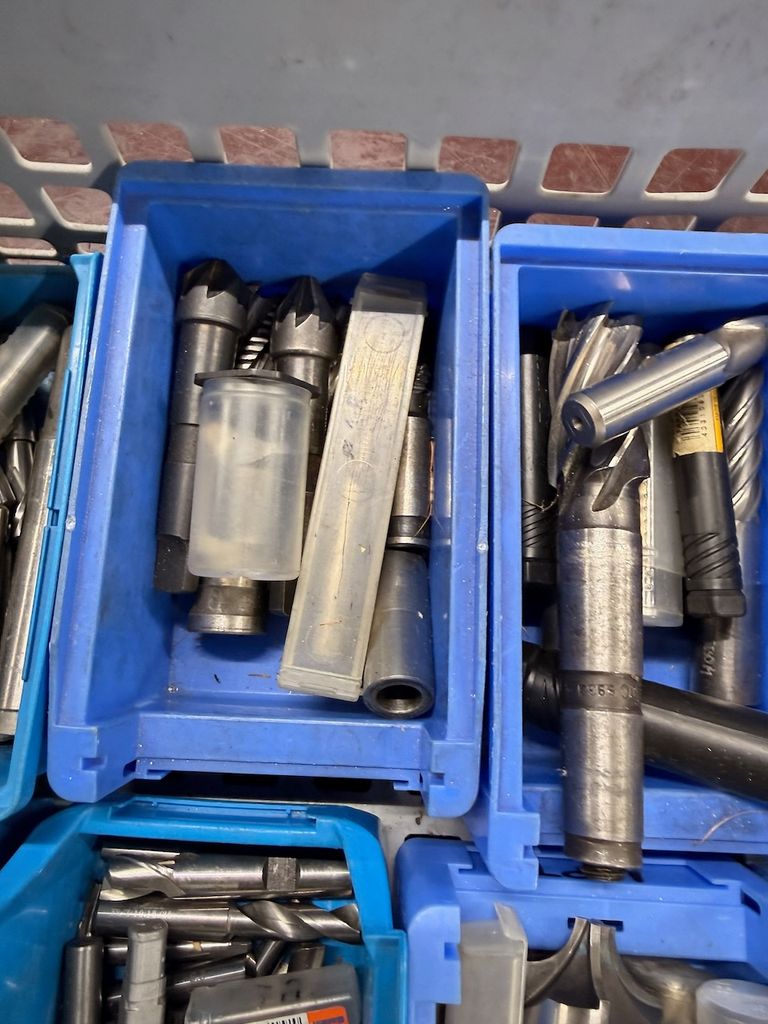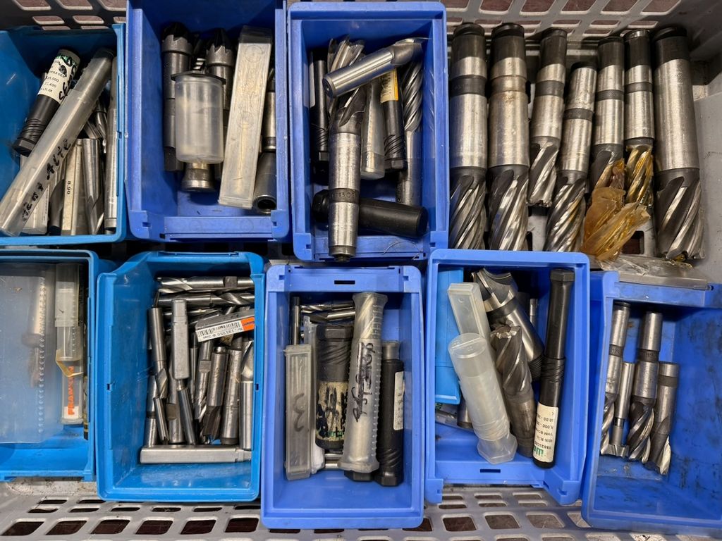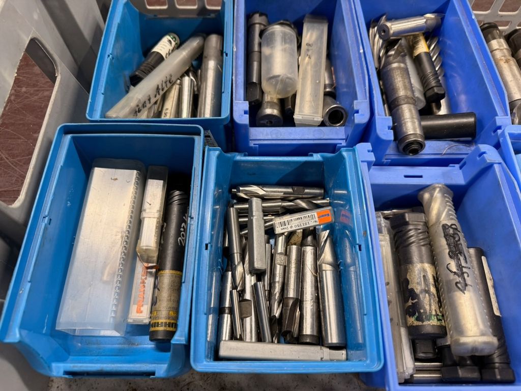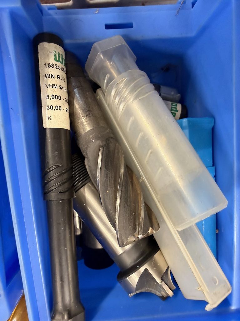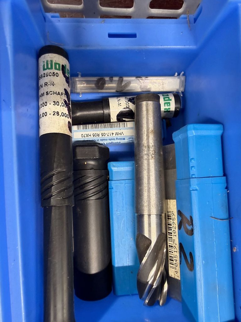 Zerspanungswerkzeuge, bestehend aus Schaftfräsern, Kleinfräsern sowie weiteren Werkzeugen in verschiedenen Abmessungen und Ausführungen. Die Werkzeuge sind überwiegend in blauen Sortierboxen gelagert.