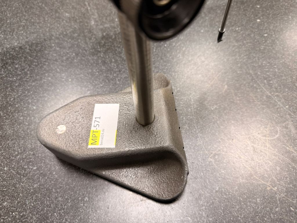Anzeigeeinheit mit LCD-Display und Bedientasten. Messbereich laut Skalenkennzeichnung 0–100 mm. Massiver Standfuß mit Säule und verstellbarer Halterung.