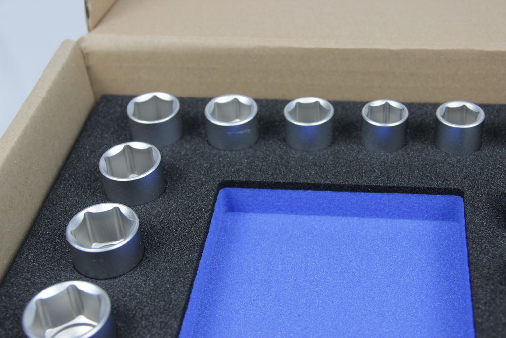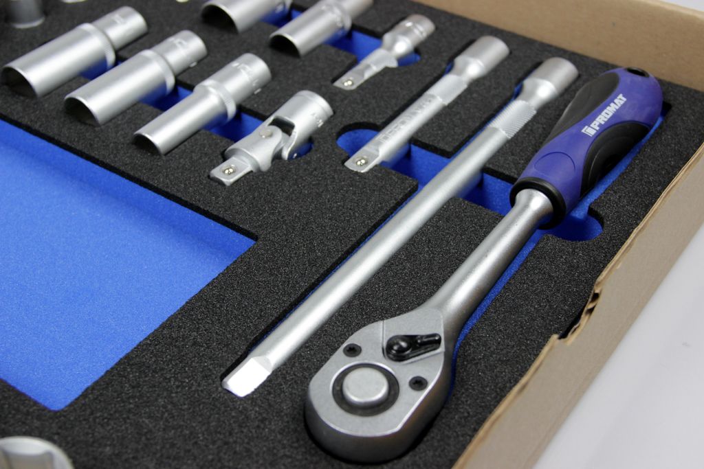 Das Set umfasst eine robuste Umschaltknarre mit 12,5 mm (1/2 Zoll) Antrieb sowie eine lückenlose Auswahl an Steckschlüsseleinsätzen und praktischem Zubehör. Alle Werkzeuge sind aus hochfestem Chrom-Vanadium-Stahl gefertigt und matt verchromt, was eine hervorragende Griffigkeit und maximalen Korrosionsschutz garantiert. Durch die systematische Anordnung im Modul ist jedes Werkzeug sofort griffbereit, und fehlende Teile fallen durch die leeren Konturen sofort auf, was die Effizienz in der täglichen Praxis massiv steigert.