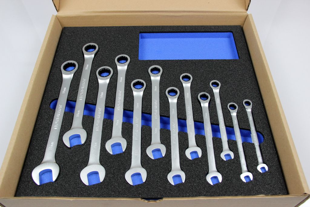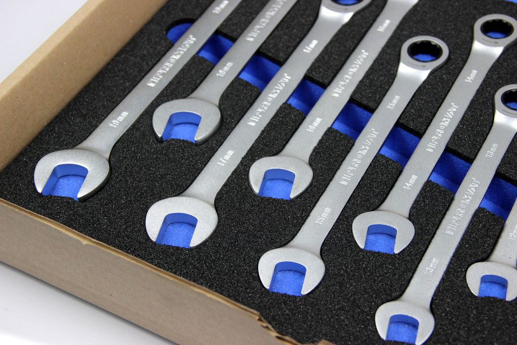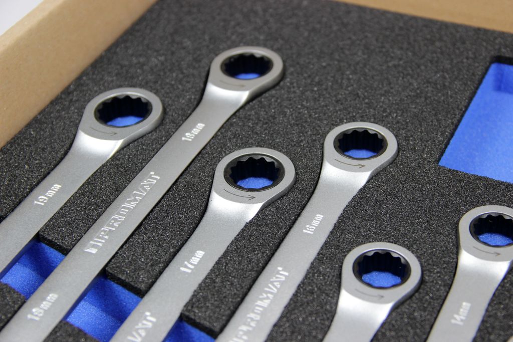 Die Schlüssel kombinieren die Vielseitigkeit eines Maulschlüssels mit dem Zeitvorteil einer Ratsche. Durch die feine Verzahnung der Ringseite ist ein Nachsetzen des Werkzeugs nicht mehr erforderlich, was den Arbeitsfortschritt insbesondere bei beengten Platzverhältnissen massiv beschleunigt. Die Einlage sorgt dafür, dass jeder Schlüssel sicher fixiert ist und Fehlbestände in der Schublade sofort ins Auge fallen.