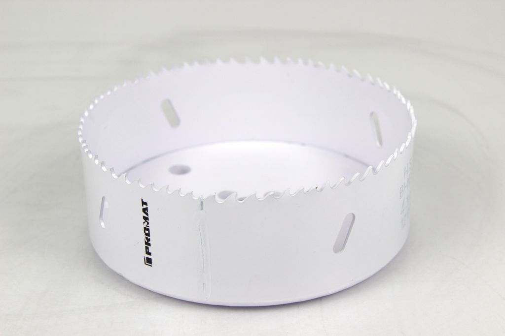 Diese professionelle Promat Lochsäge mit einem imposanten Durchmesser von 121 mm ist ein Hochleistungswerkzeug für großformatige, kreisrunde Bohrungen. Gefertigt aus erstklassigem HSS-Bi-Metall, bietet sie die perfekte Symbiose aus Zähigkeit im Grundkörper und extremer Härte an den Zahnspitzen.