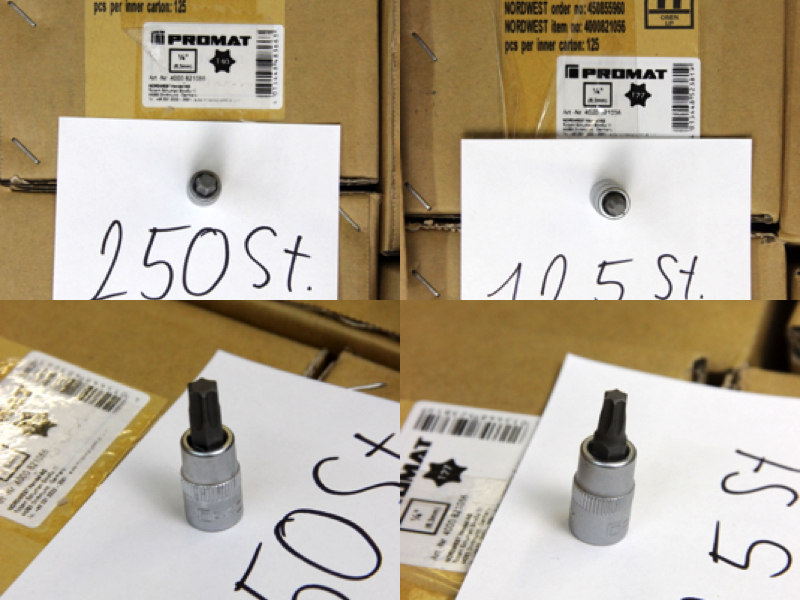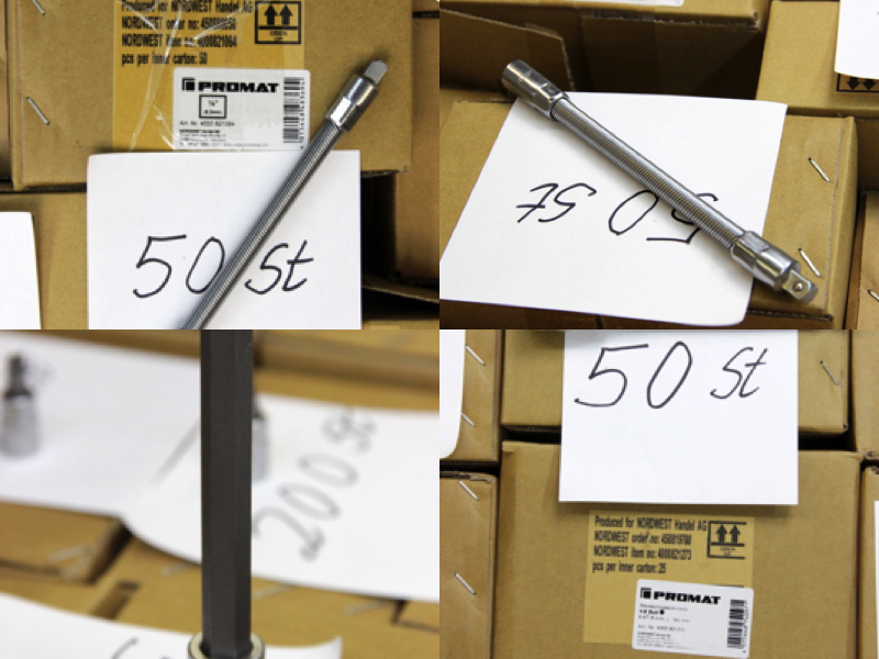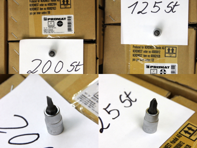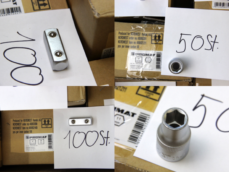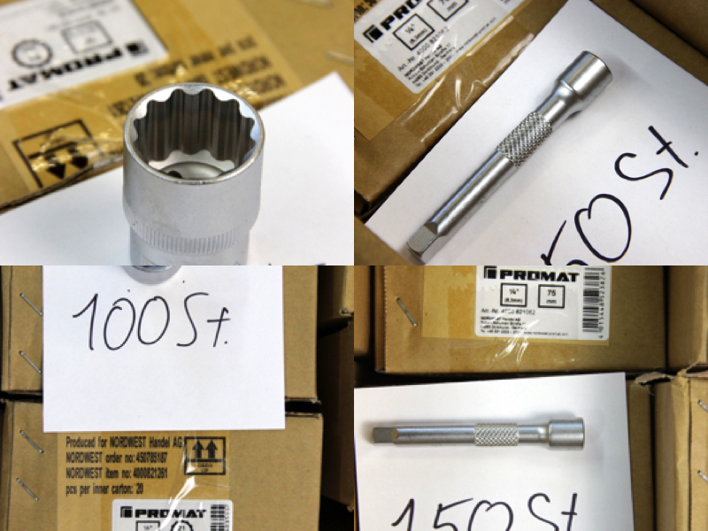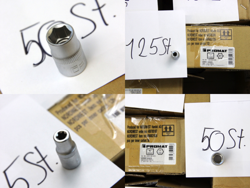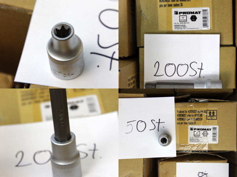Zum Verkauf steht ein großer Lagerbestand an originalen PROMAT Werkzeugkomponenten. Das Set bietet eine enorme Vielfalt für alle drei gängigen Antriebsgrößen und enthält neben Standard-Sechskanteinsätzen auch Torx (E-Profil), Vielzahn (12-kant), sowie Spezial-Verbindungsstücke. Alle Teile sind aus Chrom-Vanadium-Stahl gefertigt und matt verchromt.