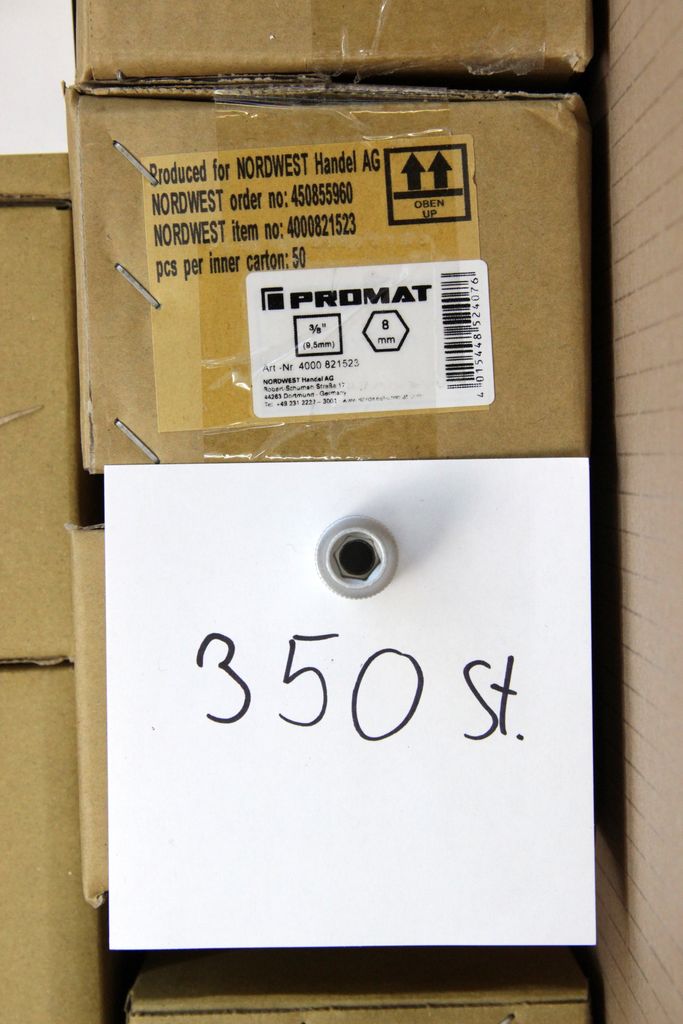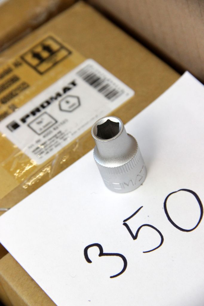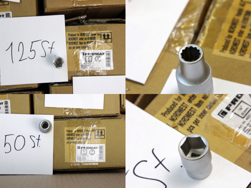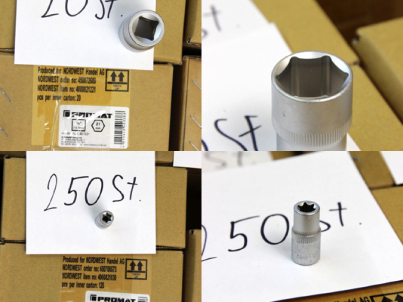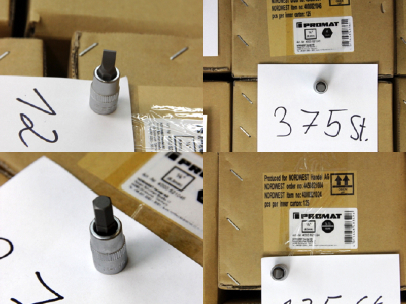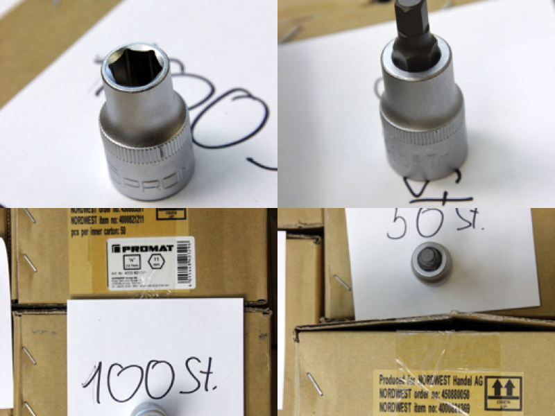 Zum Verkauf steht ein großer Lagerbestand an originalen PROMAT Werkzeugkomponenten. Das Set bietet eine enorme Vielfalt für alle drei gängigen Antriebsgrößen und enthält neben Standard-Sechskanteinsätzen auch Torx (E-Profil), Vielzahn (12-kant), sowie Spezial-Verbindungsstücke. Alle Teile sind aus Chrom-Vanadium-Stahl gefertigt und matt verchromt.
