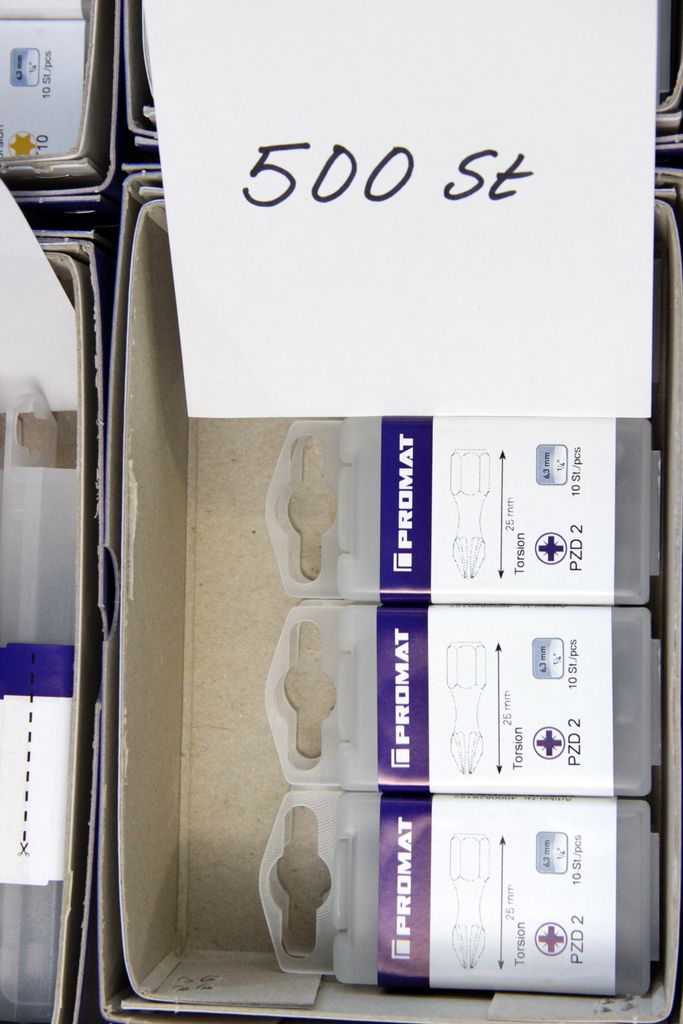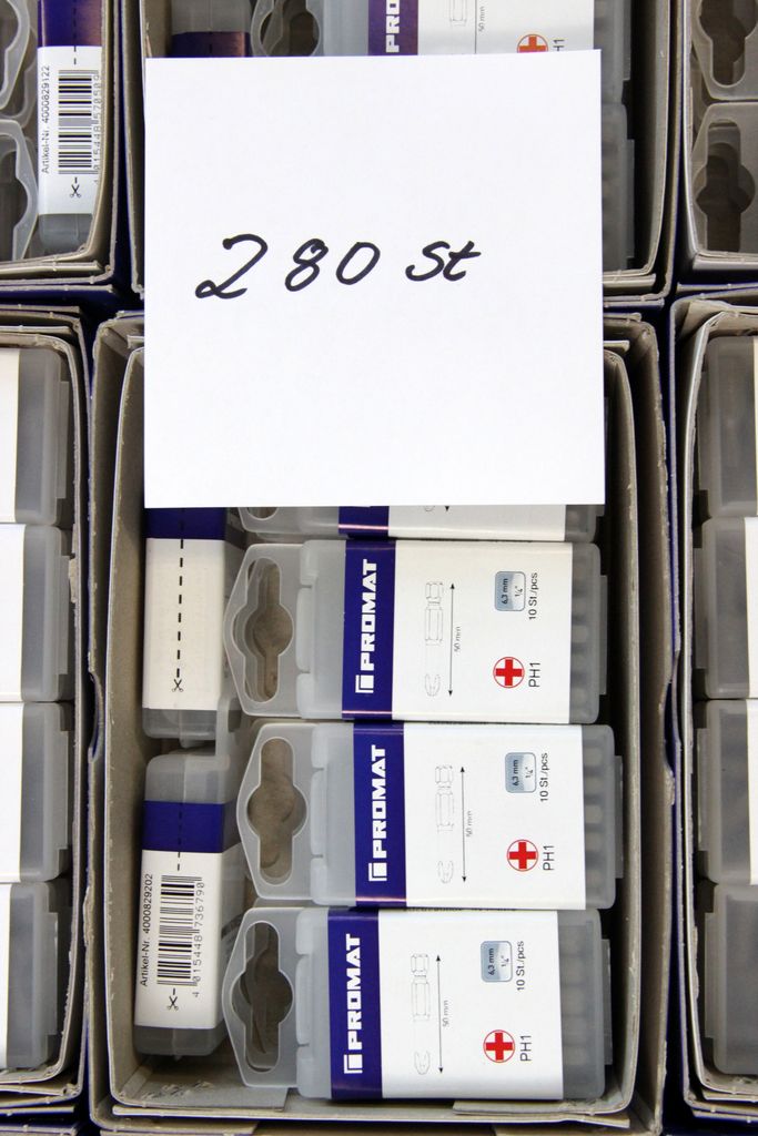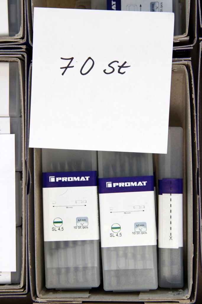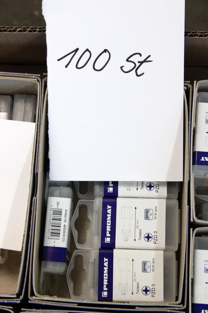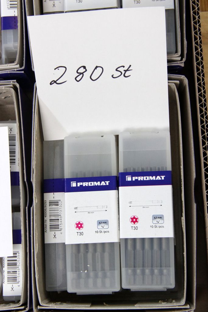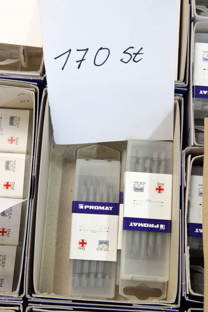 Zum Verkauf steht ein umfangreicher Lagerbestand an originalen PROMAT Qualitäts-Bits (1/4" Antrieb). Das Set enthält spezialisierte Profile für den harten gewerblichen Einsatz, darunter Torsions-Bits für Schlagschrauber, Sicherheits-Bits mit Bohrung (Tamper Resistant) und extra lange Ausführungen (89 mm).