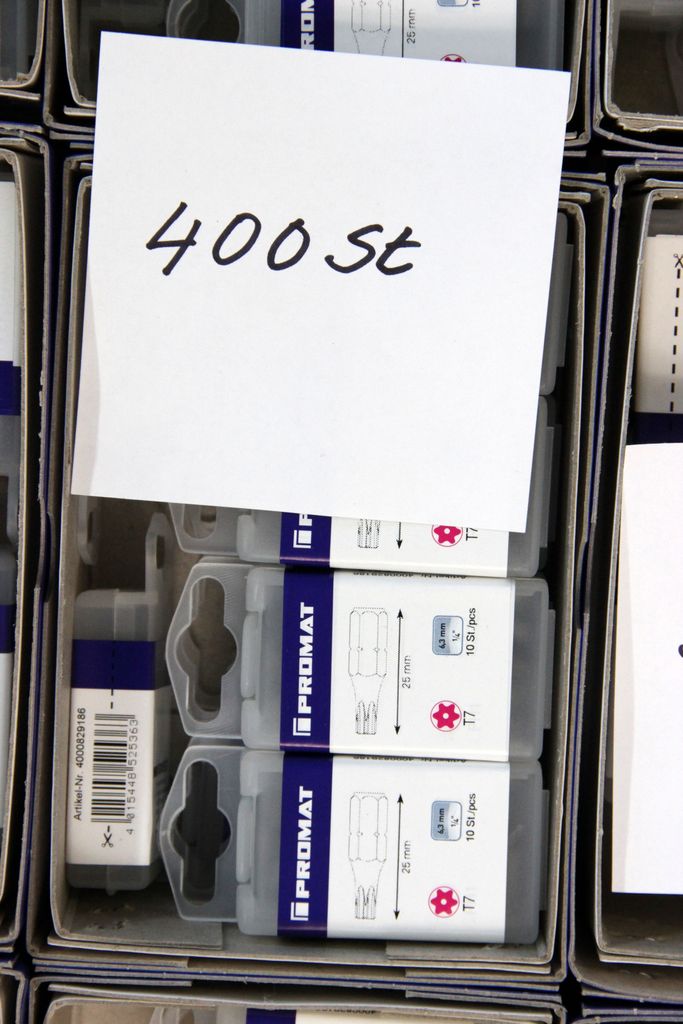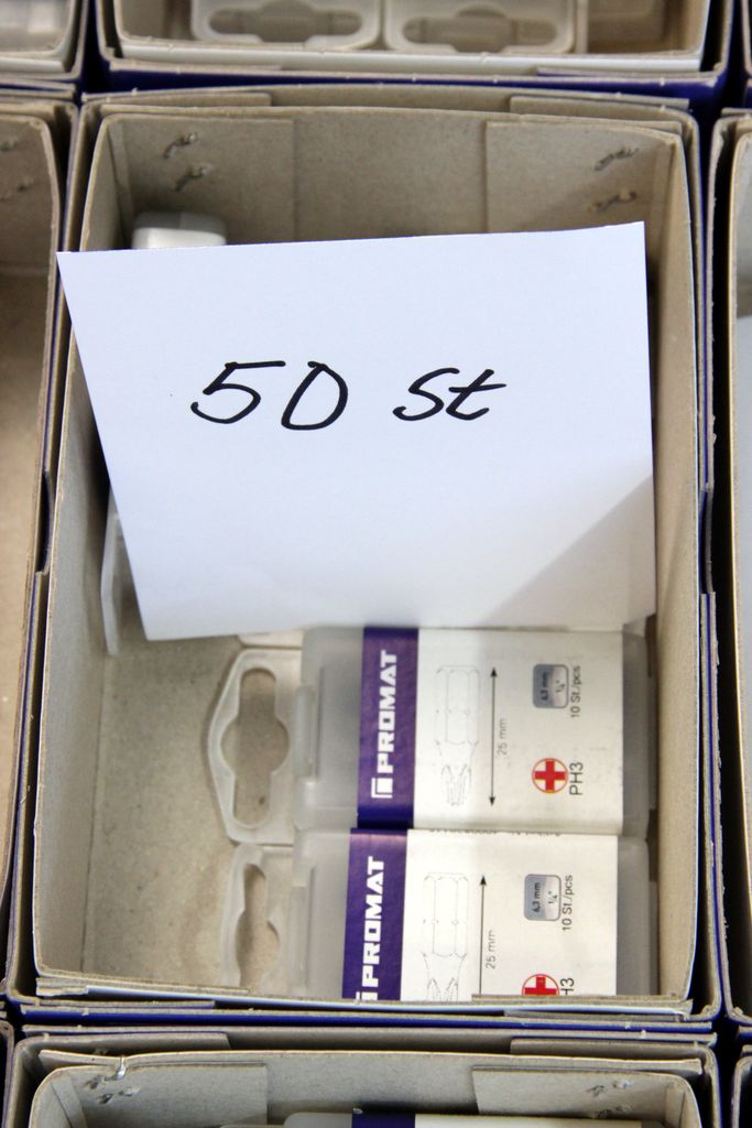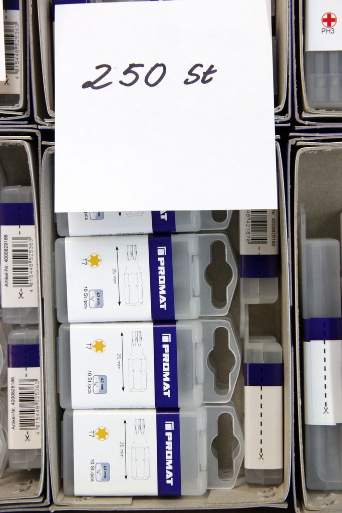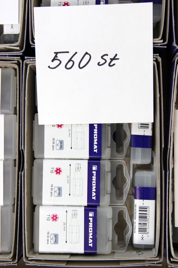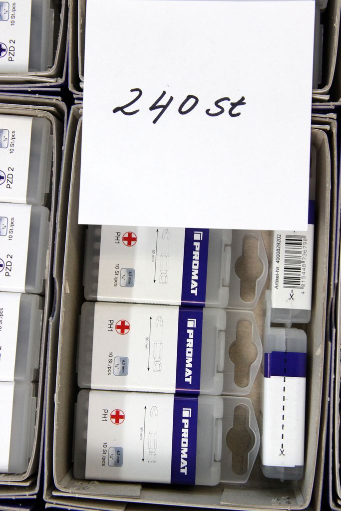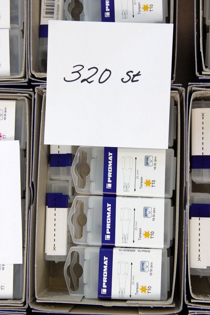 Zum Verkauf steht ein umfangreicher Lagerbestand an originalen PROMAT Qualitäts-Bits (1/4" Antrieb). Das Set enthält spezialisierte Profile für den harten gewerblichen Einsatz, darunter Torsions-Bits für Schlagschrauber, Sicherheits-Bits mit Bohrung (Tamper Resistant) und extra lange Ausführungen (89 mm).
