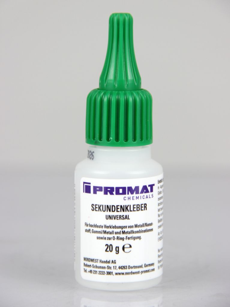 Der Promat Chemicals Sekundenkleber Universal 20 g ist ein hochfester Cyanacrylatkleber, der laut Websuche für Metall, Kunststoffe und Materialkombinationen geeignet ist.