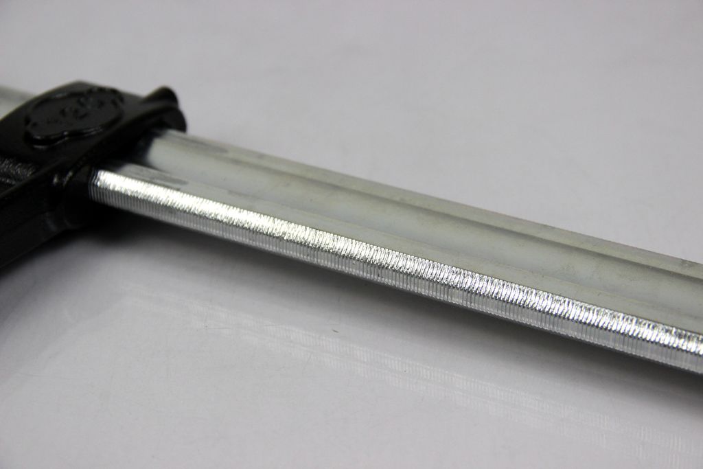 Mit einer Spannweite von 800 mm und einer Ausladung von 120 mm ermöglicht sie hohe Anpressdrücke bei gleichzeitig sicherer Handhabung. Die hohlprofilierte Stahlschiene ist verzinkt und dadurch optimal gegen Korrosion geschützt. Der ergonomisch geformte Holzgriff und die integrierte Rutschsicherung am Gleitbügel sorgen für ein sicheres Arbeiten auch unter hoher Belastung.