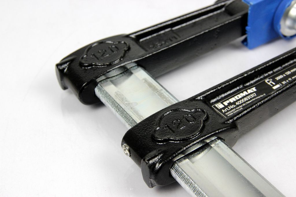 Die Kombination aus hochfesten Temperguss-Armen und einer extra verstärkten Stahlschiene garantiert eine enorme Verwindungssteifigkeit auch bei maximaler Ausnutzung der Länge. Die hohlprofilierte Schiene ist verzinkt und damit bestens gegen Korrosion geschützt. Ein ergonomischer Holzgriff und die bewährte Rutschsicherung am Gleitbügel sorgen für ein sicheres und kraftvolles Arbeiten.