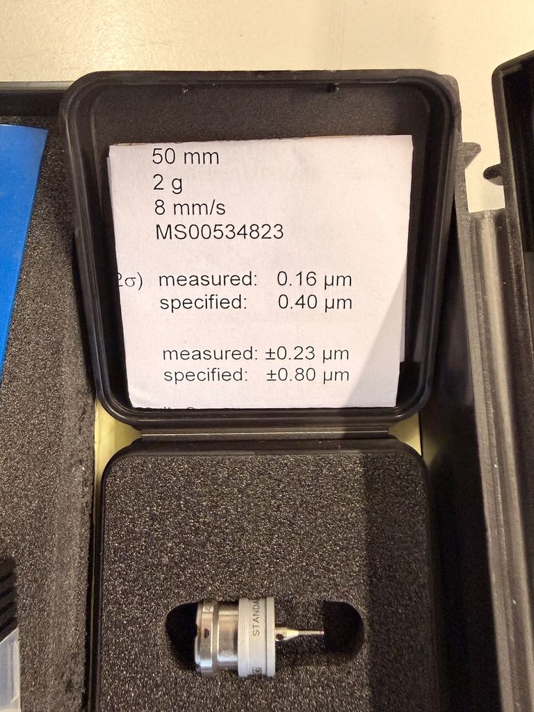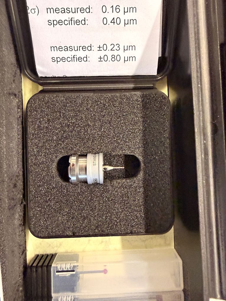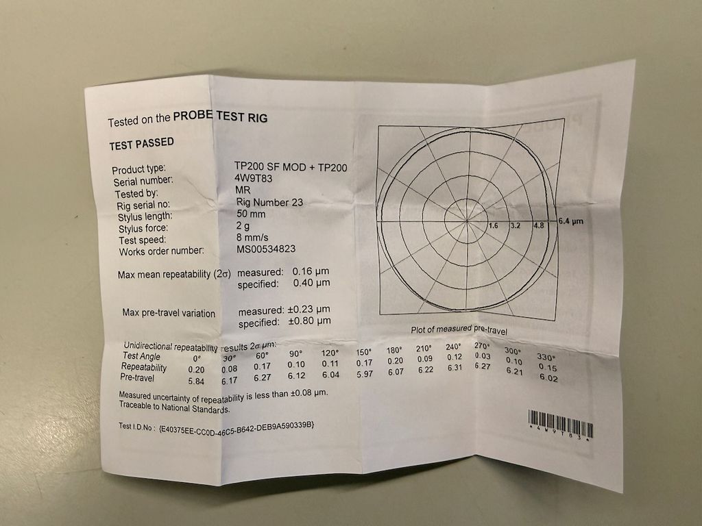 Der Messtaster wurde auf dem RENISHAW Probe Test Rig geprüft (Test Passed). Ein detaillierter Prüfbericht / Messprotokoll liegt bei und dokumentiert die Wiederholgenauigkeit sowie die Vorzugsbewegung (Pre-Travel).