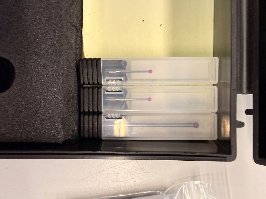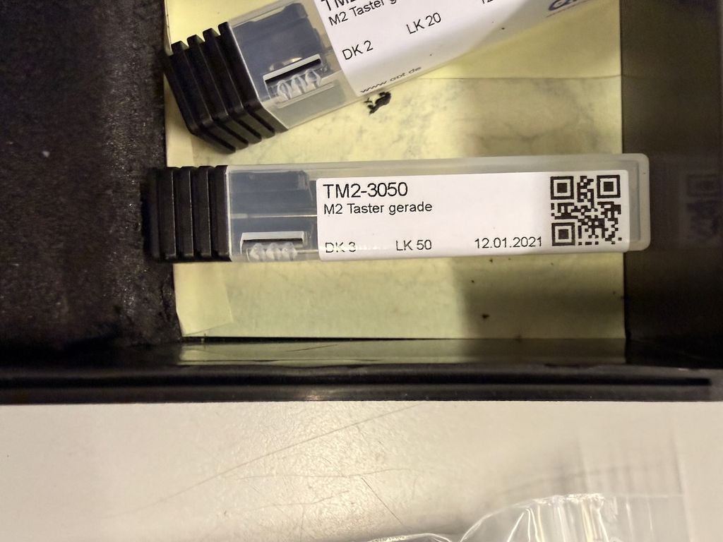 Komplettes Messtaster-Set von RENISHAW bestehend aus einem TP200 Messtaster (SF MOD) inklusive mehrerer M2-Tastereinsätze (gerade Ausführung, unterschiedliche Längen) sowie Original-Transportkoffer.