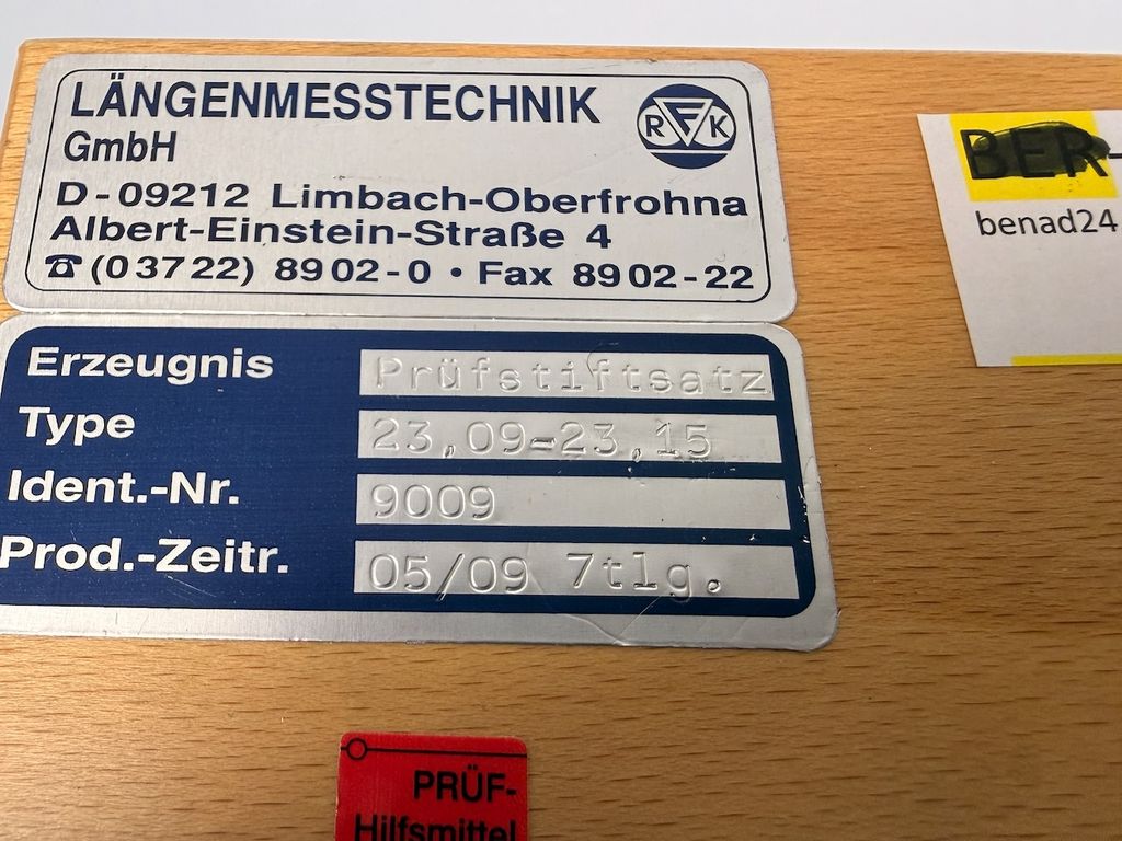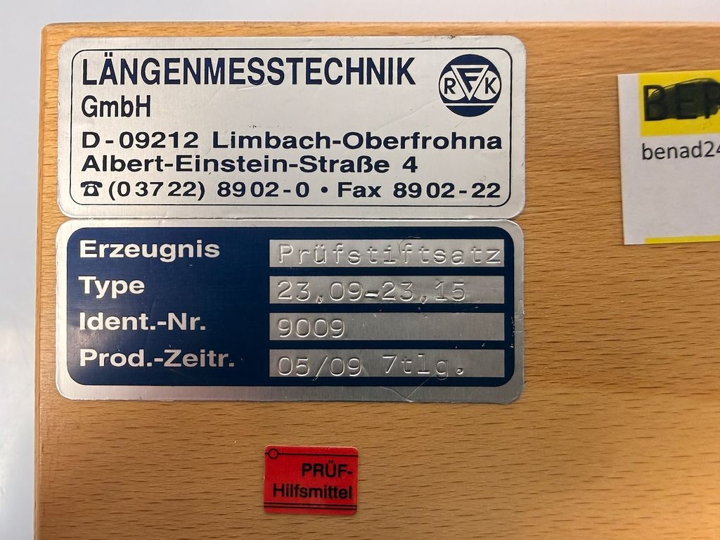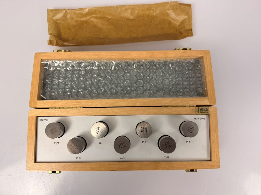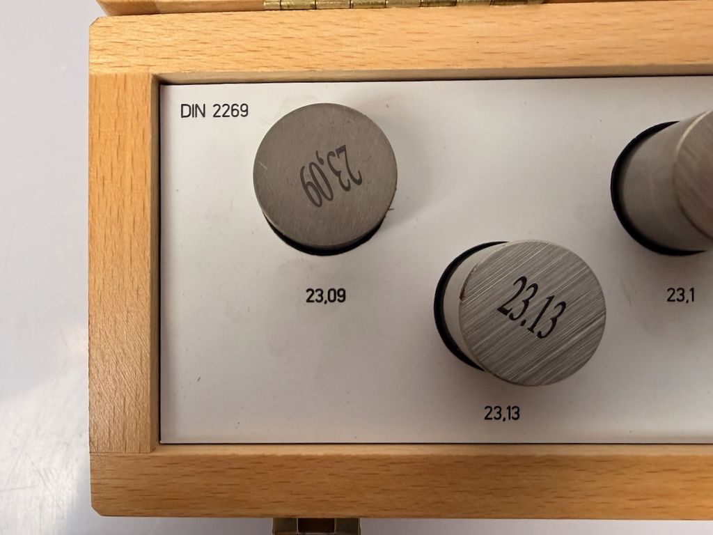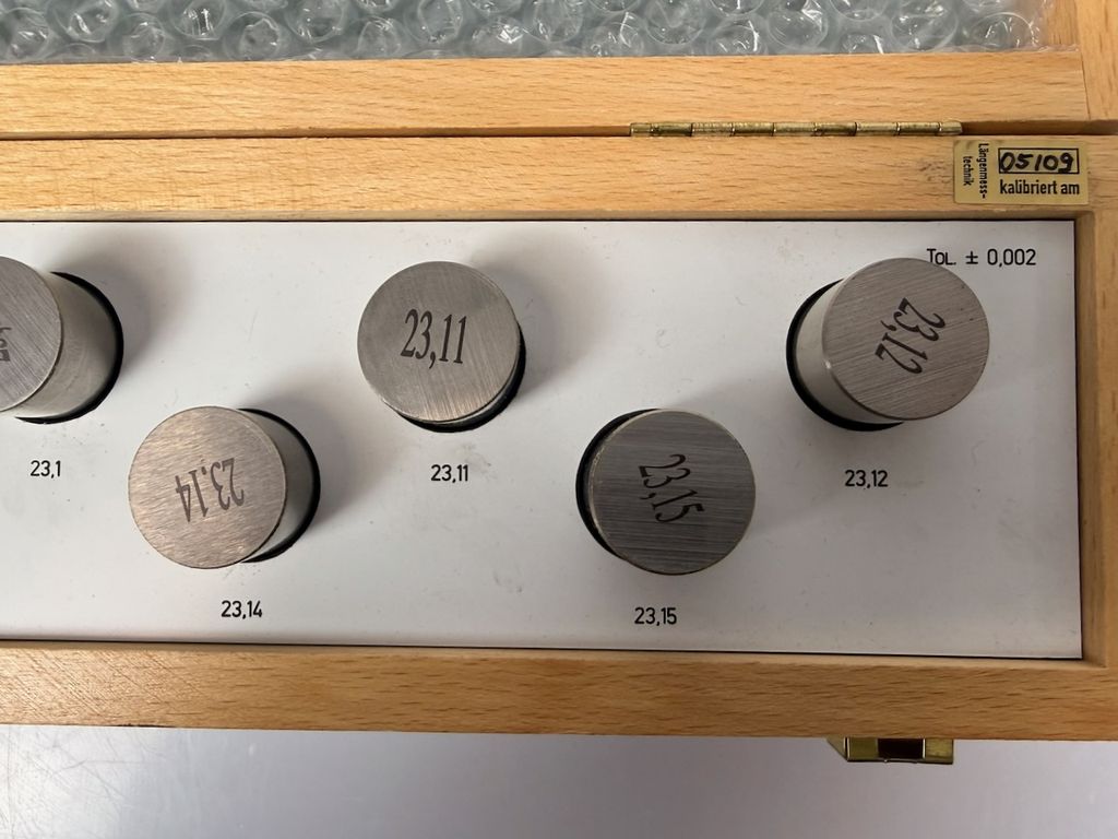Prüfstiftsatz (Prüfmaßsatz) nach DIN 2269 zur Feinabstimmung und Überprüfung von Messmitteln bzw. zur Vergleichsmessung. Der Satz ist 7-teilig und deckt den Bereich 23,09 bis 23,15 mm ab. Lieferung im originalen Holzkasten.