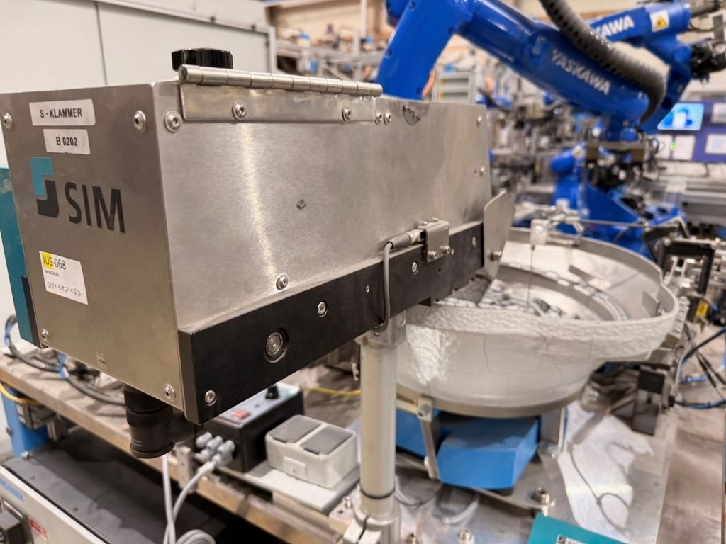 Komplettes SIM-Zuführtechnikpaket, bestehend aus Rundförderer, Transportband sowie den originalen SIM-Steuer- und Leistungseinheiten.