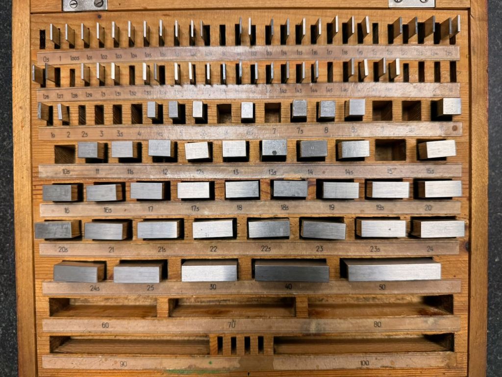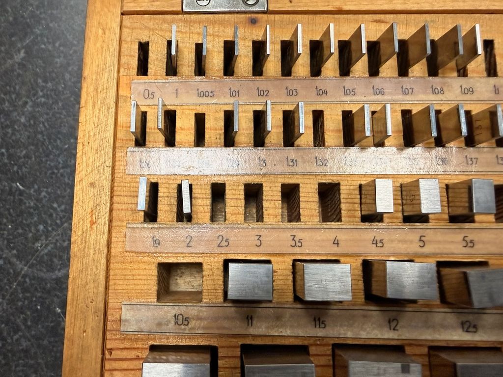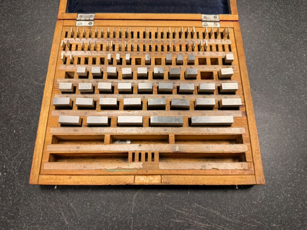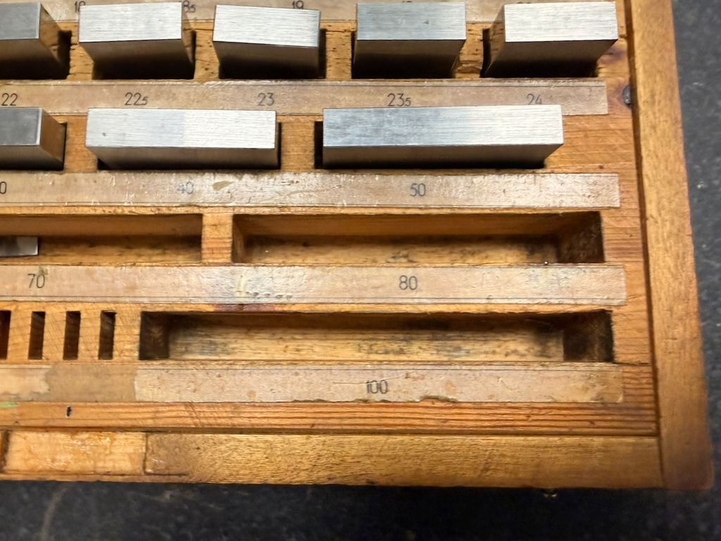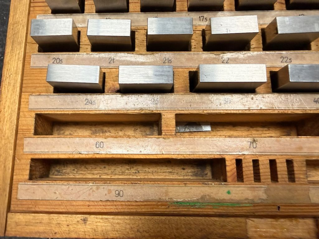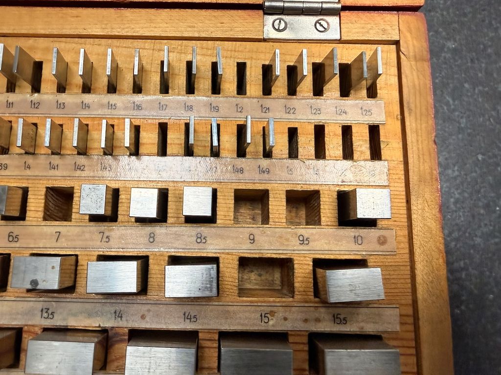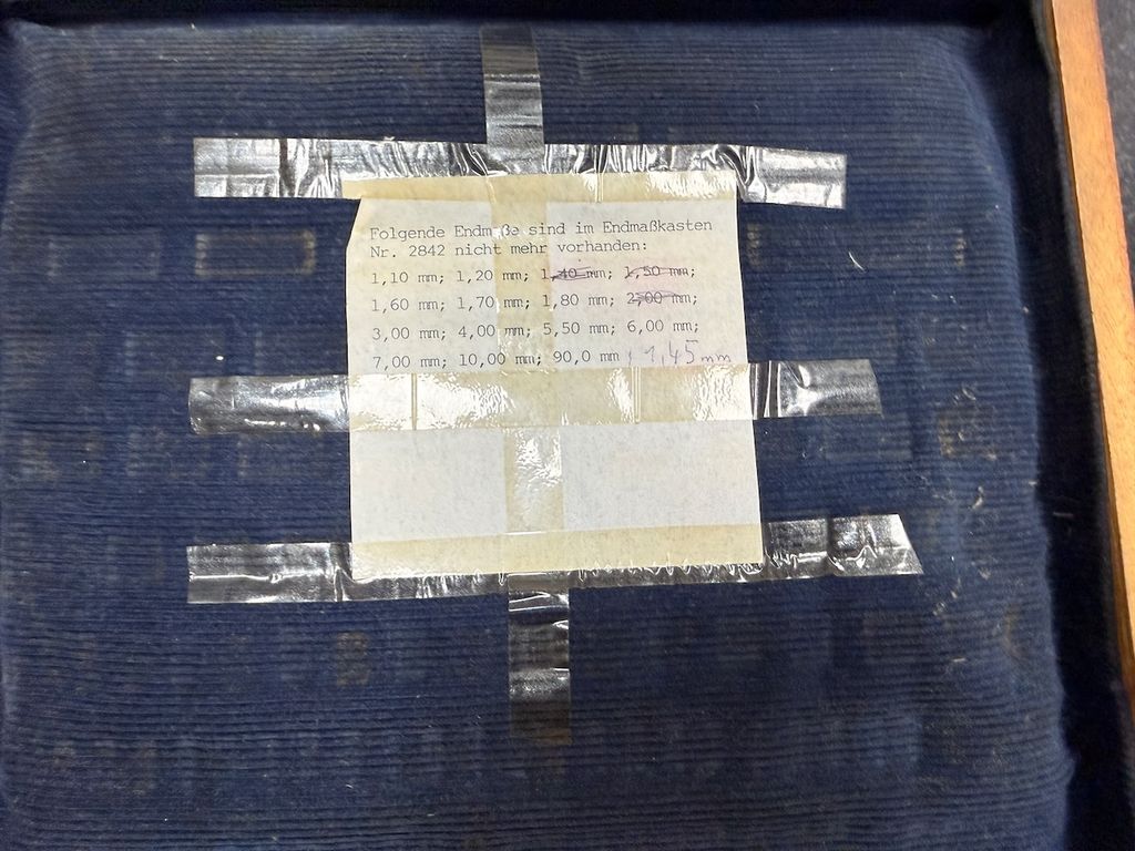 Der Satz ist unvollständig. Laut beiliegendem Hinweis fehlen mehrere Endmaße (u. a. 1,10 mm; 1,20 mm; 1,40 mm; 1,50 mm; 1,60 mm; 1,70 mm; 1,80 mm; 2,00 mm; 3,00 mm; 4,00 mm; 5,50 mm; 6,00 mm; 7,00 mm; 10,00 mm; 90,0 mm – ohne Gewähr, gemäß Zettel im Deckel).