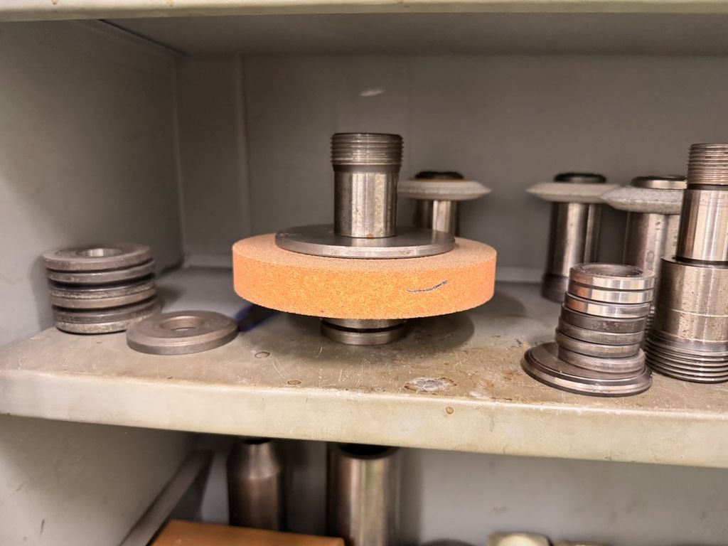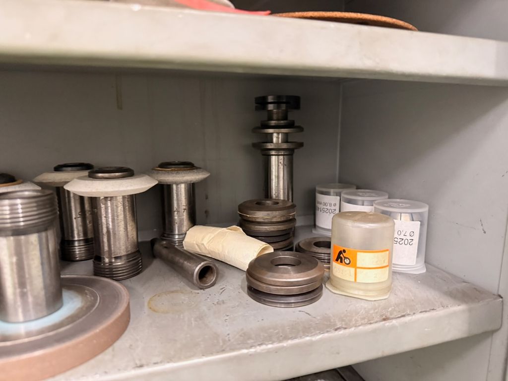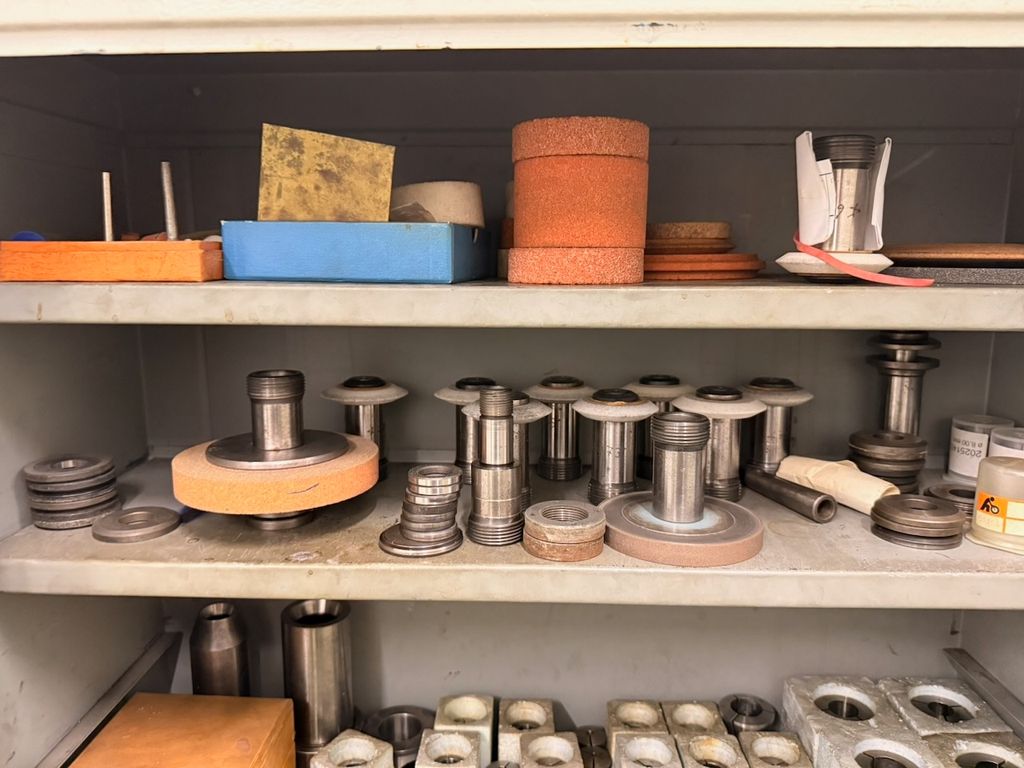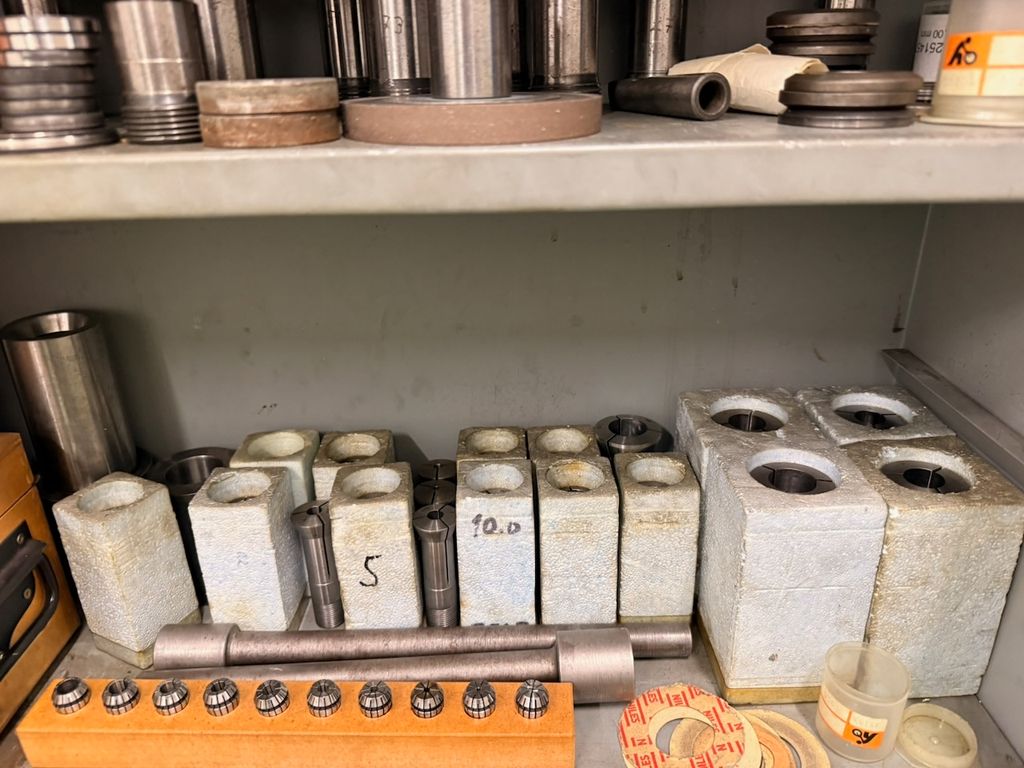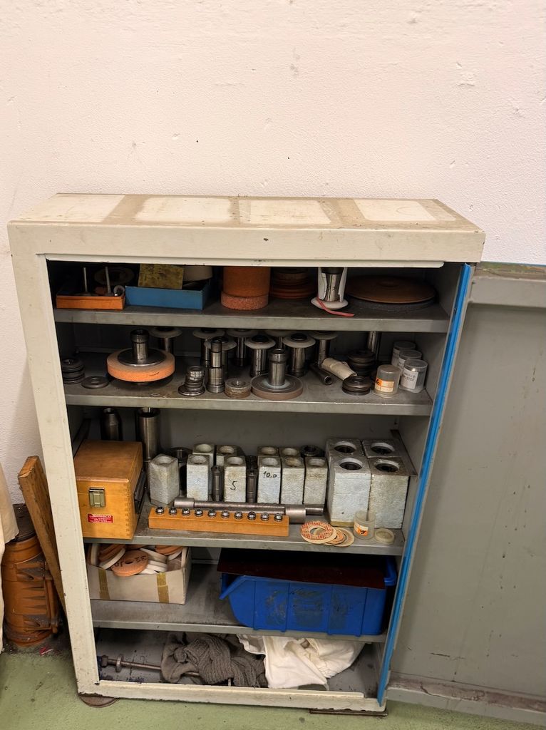 Der Schrank ist bestückt mit verschiedenen Schleifdornen, Aufnahmedornen, Spannaufnahmen, Schleifscheiben, Spannzangen sowie weiterem Zubehör.