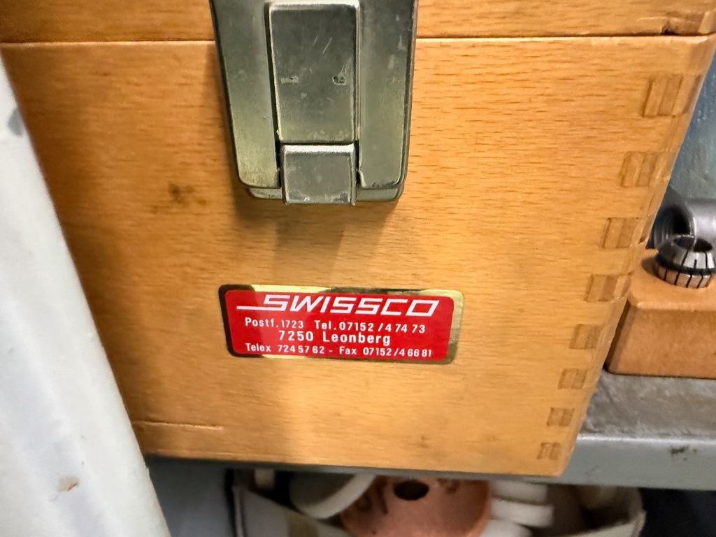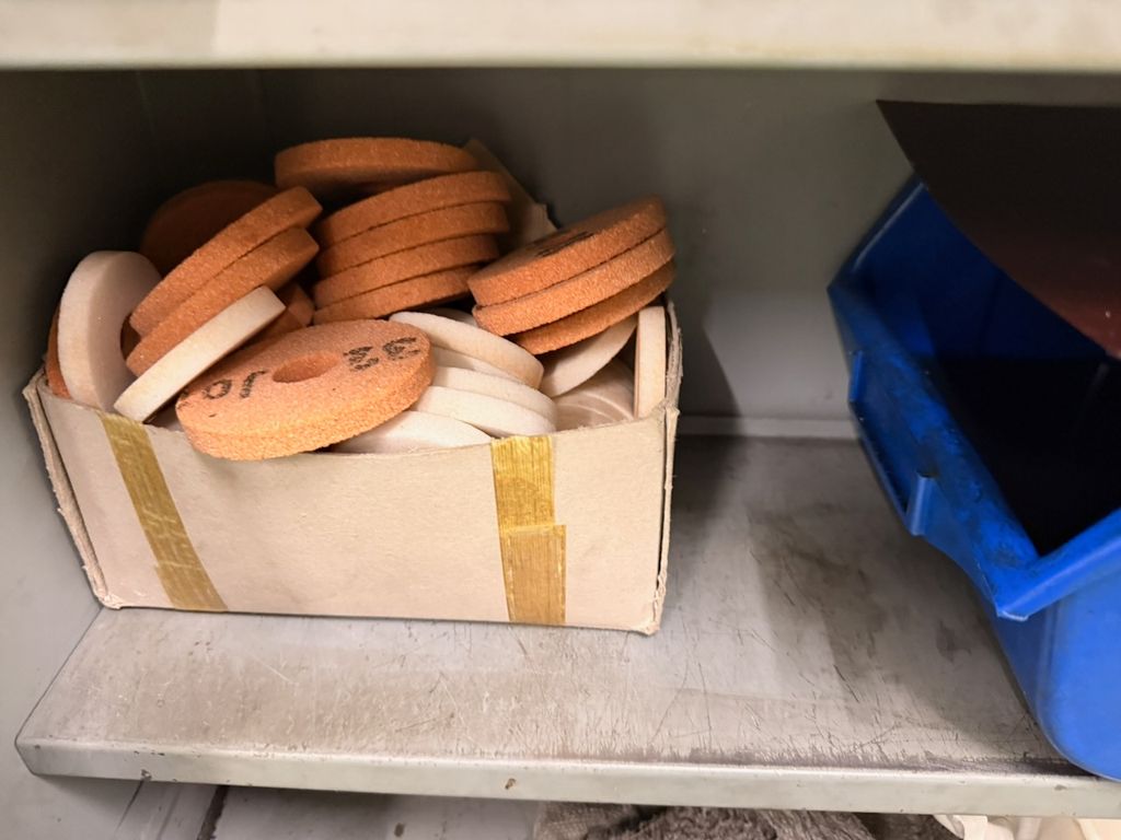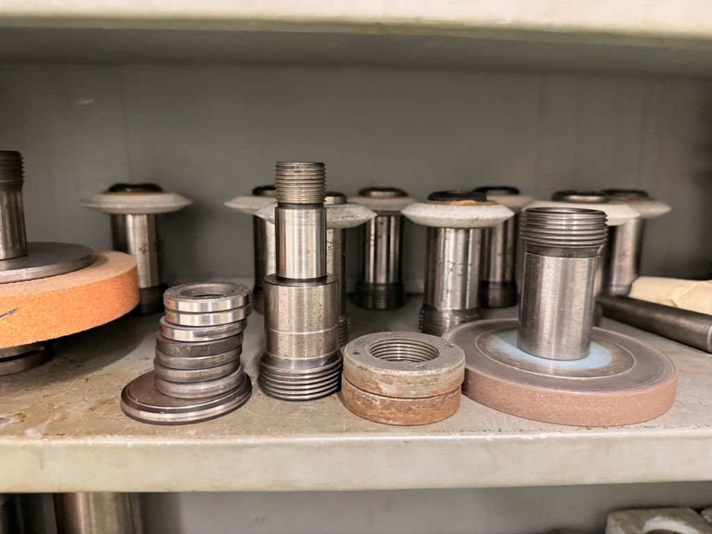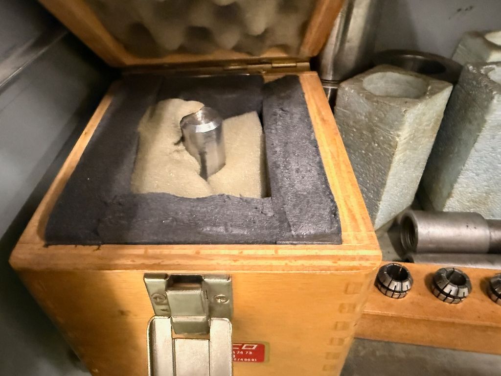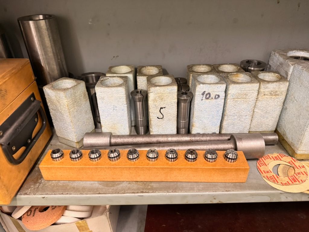 Der Schrank ist bestückt mit verschiedenen Schleifdornen, Aufnahmedornen, Spannaufnahmen, Schleifscheiben, Spannzangen sowie weiterem Zubehör.