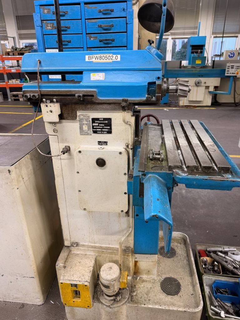 Universal-Fräsmaschine sowjetischer Bauart. Sehr massive Gusskonstruktion, handverstellte Achsen, horizontaler Frässpindelaufbau mit Fräskopf. Geeignet für robuste Zerspanungsarbeiten.