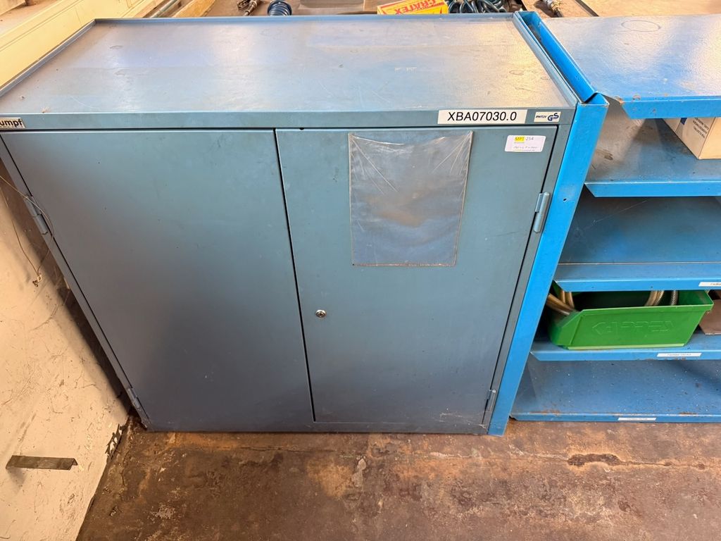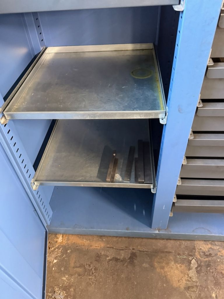 Stabiler Industrie-Werkzeugschrank aus Stahlblech, geeignet für Werkstatt- und Fertigungsumgebungen. Ausführung mit Flügeltüren, 2 ausziehbaren Fachböden sowie 9 Schubladen. Robuste Bauweise für schwere Werkzeuge und Zubehör.