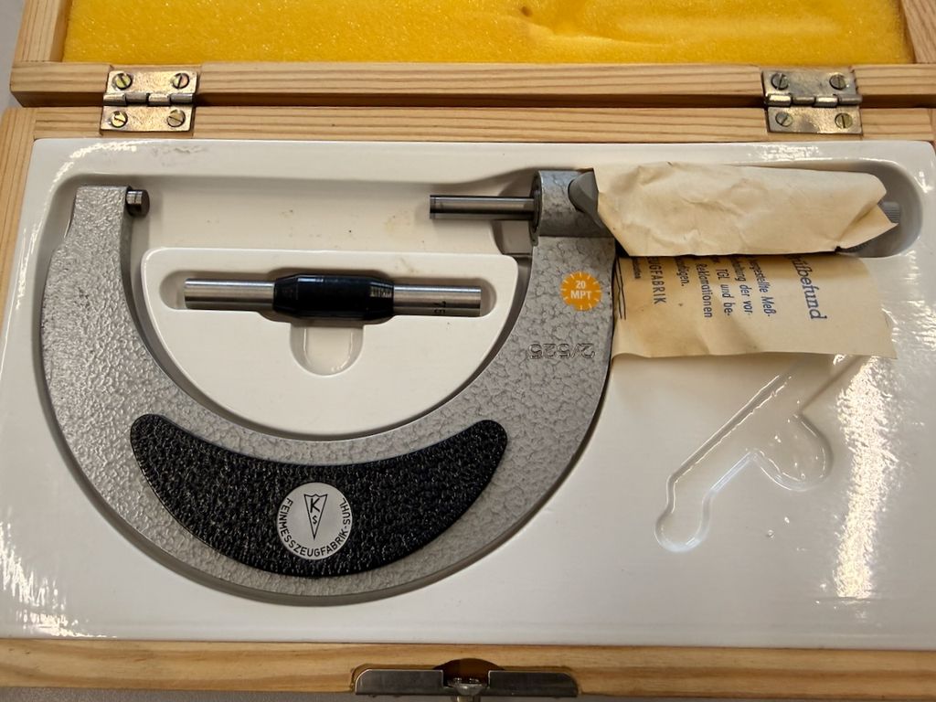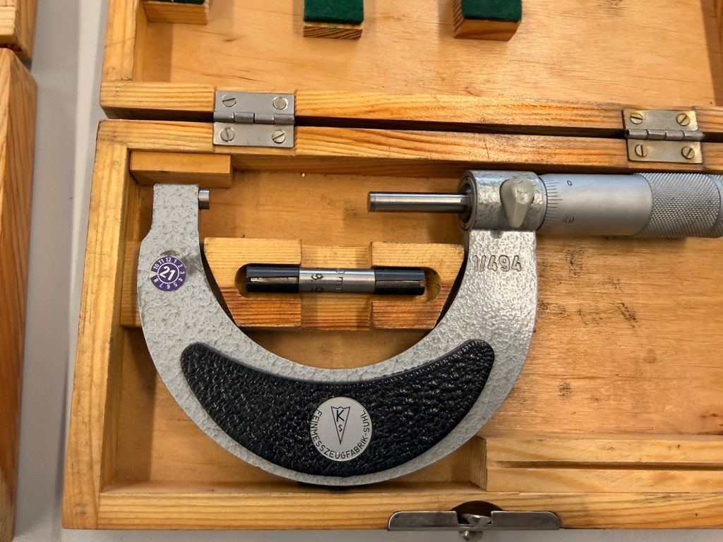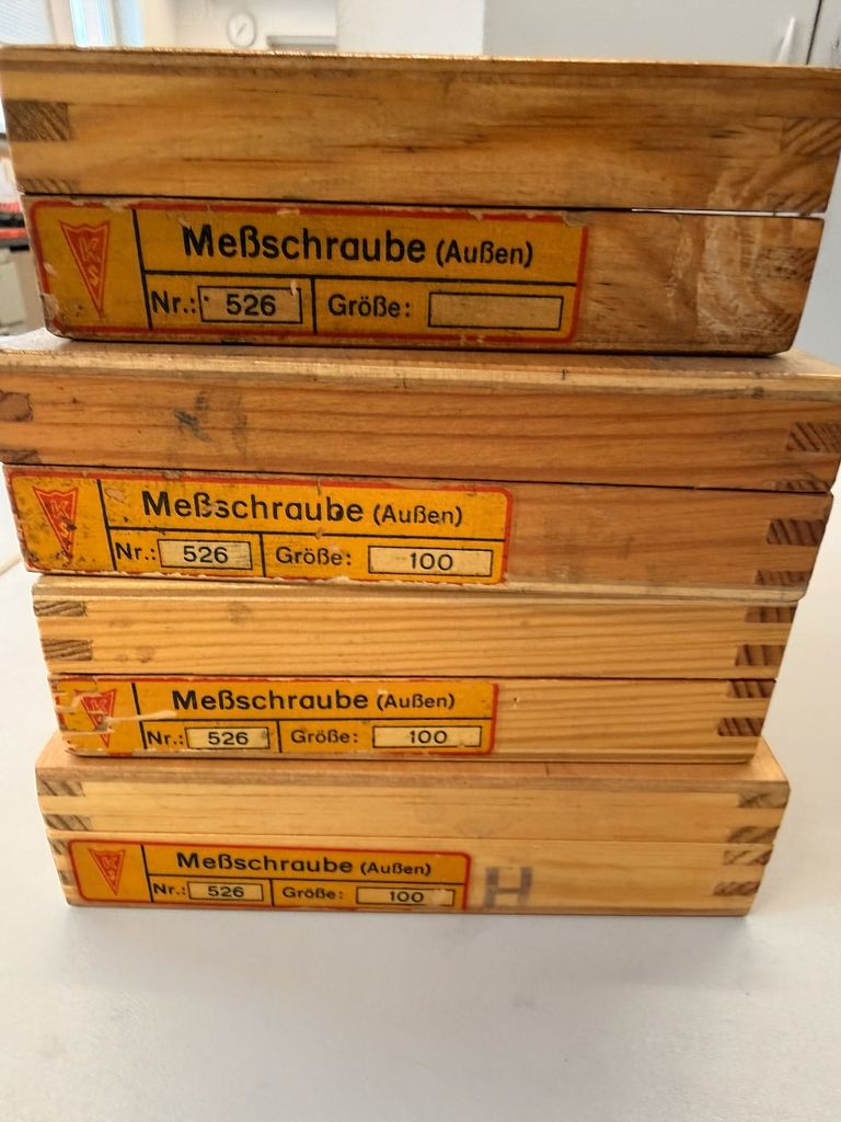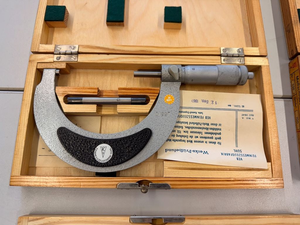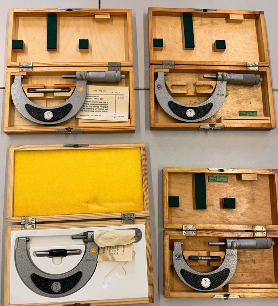 4-teiliges Set mechanischer Bügelmessschrauben für Außenmessungen, überwiegend in originalen Holzetuis. Die Messschrauben stammen aus industriellem Bestand, augenscheinlich klassische deutsche/DDR-Fertigung (u. a. Feinmesszeugfabrik), teils mit Beipackzetteln und Einstellmaßen.