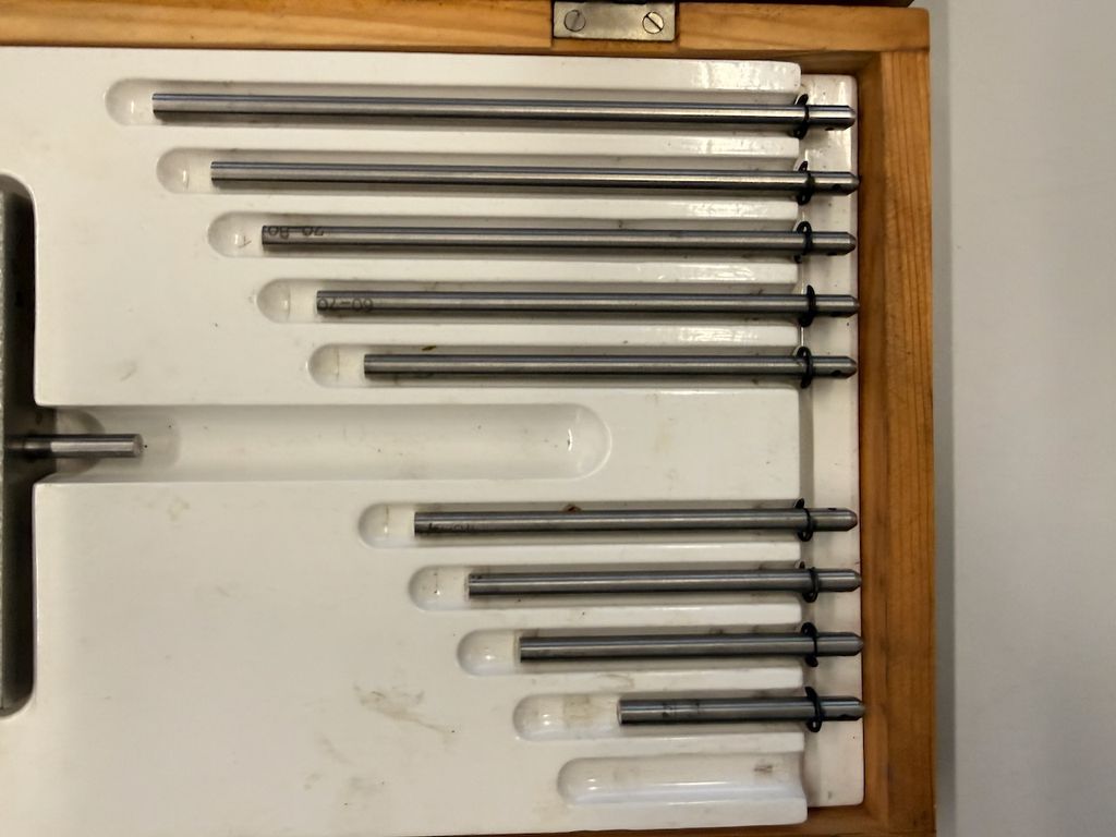 nnenmessgerät / Feinmesszeug der Feinmesszeugfabrik Suhl (DDR) zur präzisen Innen- und Vergleichsmessung. Das Set befindet sich im originalen Holzkasten und umfasst eine analoge Messuhr sowie mehrere Messstifte / Verlängerungen für unterschiedliche Messbereiche.