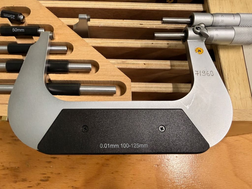 Der Satz ist nicht vollständig: Es sind nur 3 Bügelmessschrauben vorhanden (Messbereiche 75–100 / 100–125 / 125–150 mm).