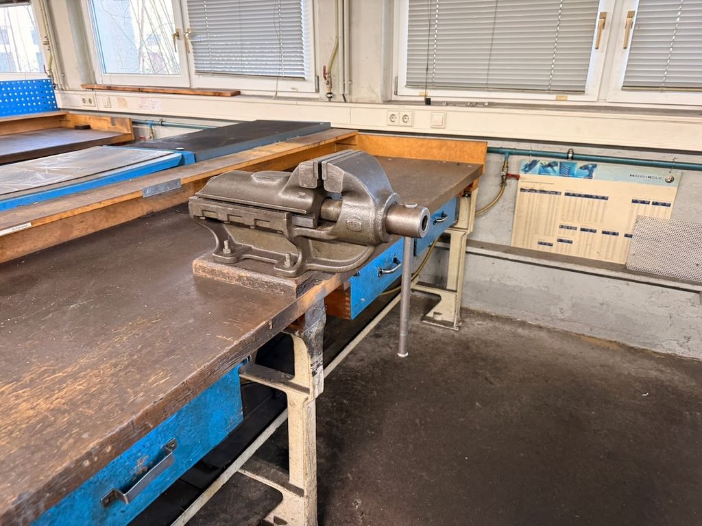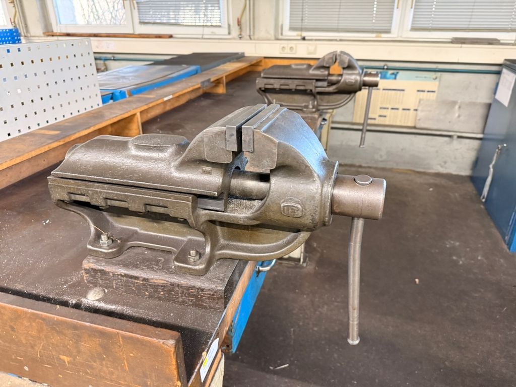 Auf der Arbeitsplatte sind 2 Schraubstöcke montiert.