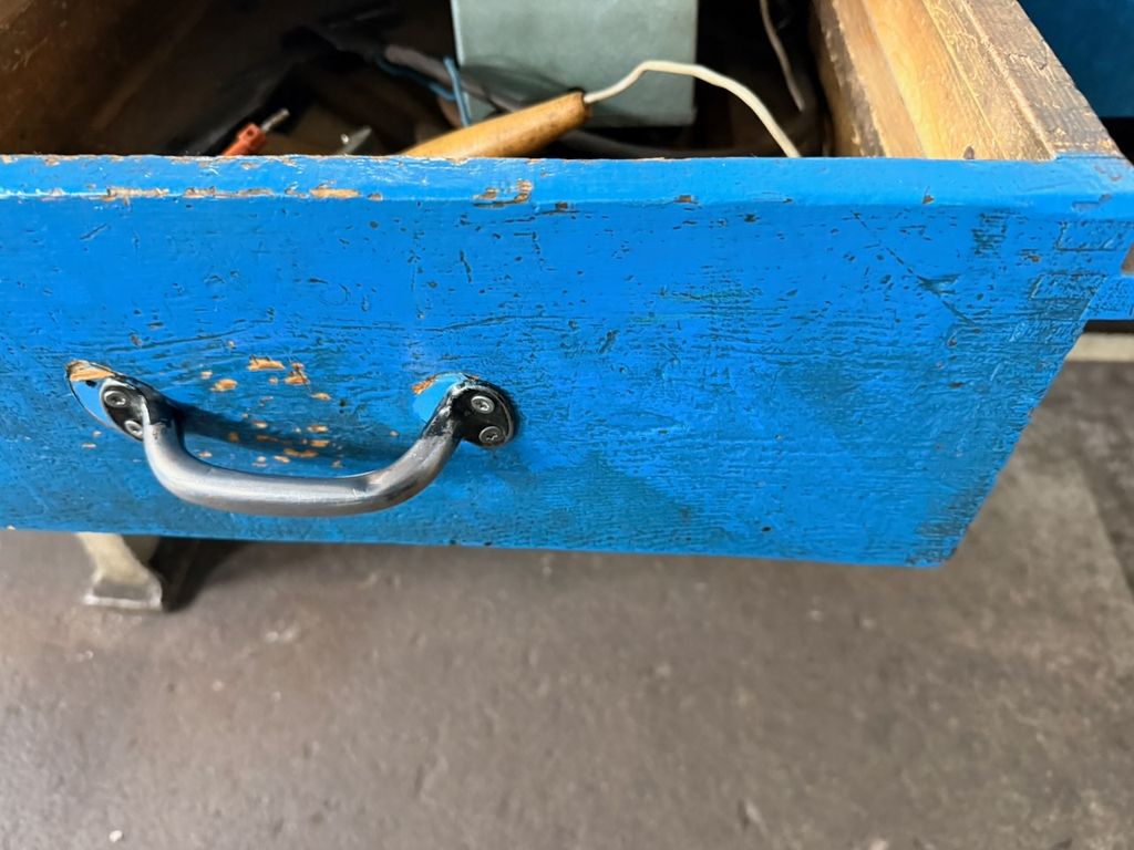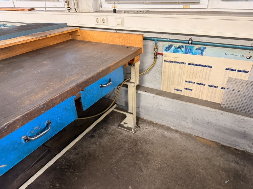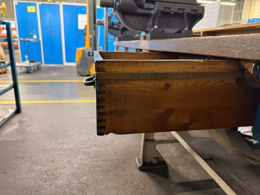 Stabile Werkbank in massiver Ausführung mit Stahlgestell und robuster Arbeitsplatte. Unter der Arbeitsfläche befindet sich 4 integrierte Schubladen aus Holz sowie eine Ablagefläche im unteren Bereich.