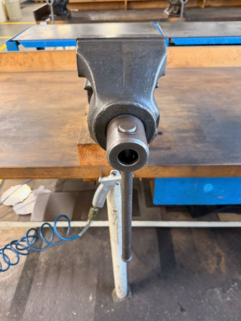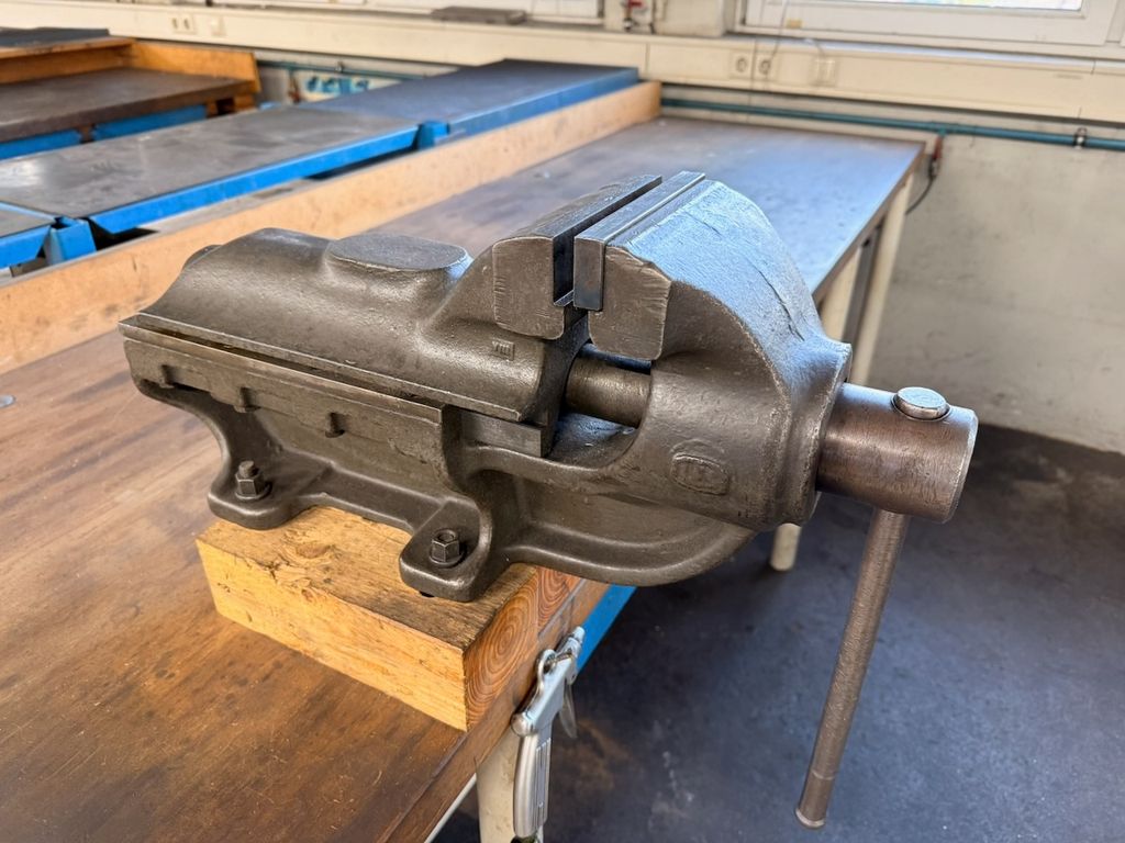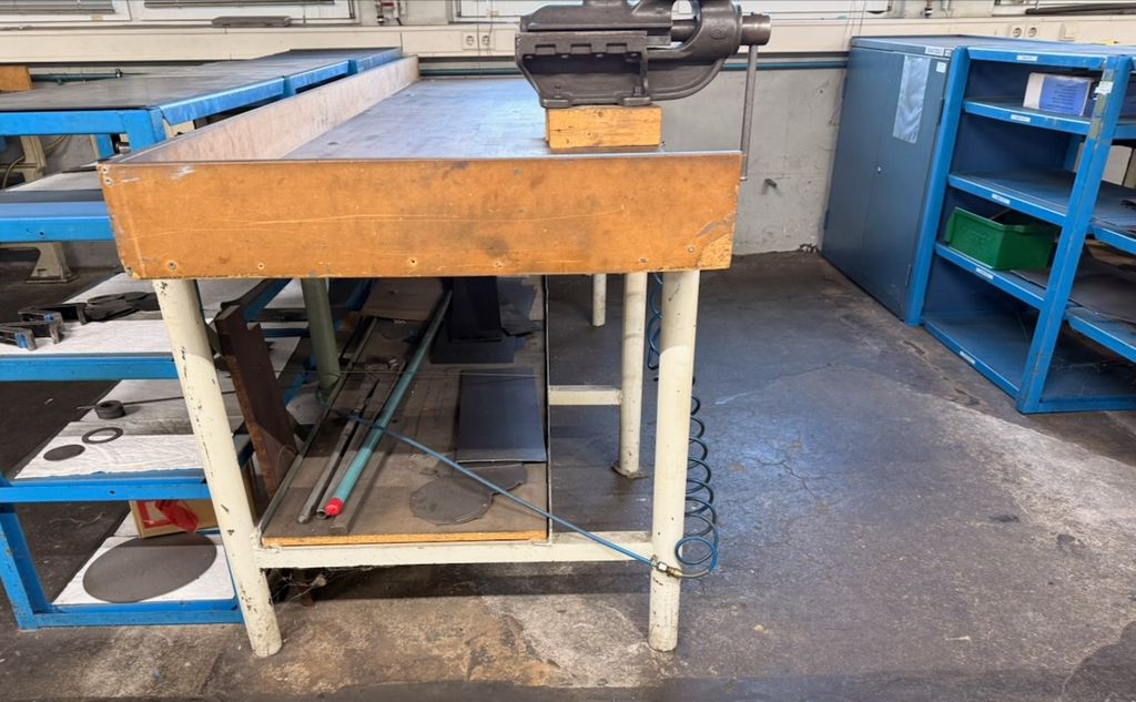Auf der Arbeitsplatte ist ein Schraubstock montiert.