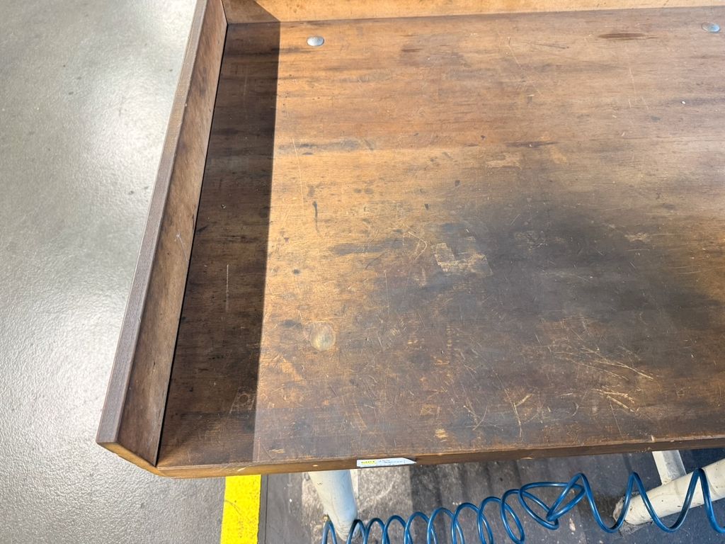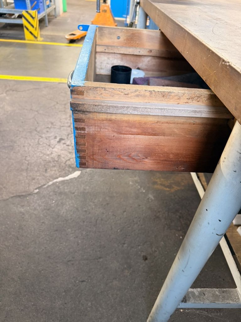 Stabile Werkbank in massiver Ausführung mit Stahlgestell und robuster Arbeitsplatte. Unter der Arbeitsfläche befindet sich 2 integrierte Schubladen aus Holz sowie eine Ablagefläche im unteren Bereich.