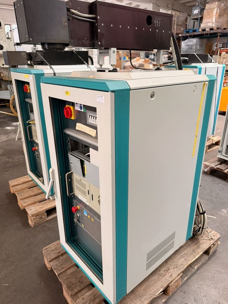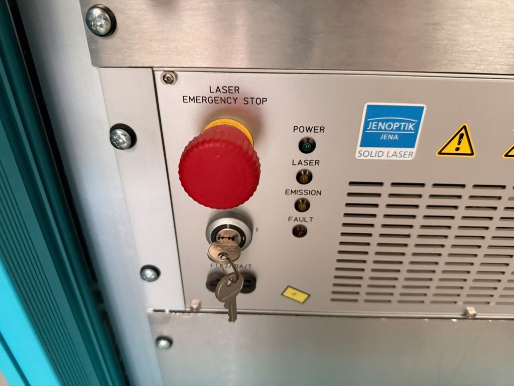 Jenoptik JOL-D5.1-BP Scheibenlaser mit SCANLAB SCANgine 14 Scannerkopf, Schaltschrank mit Steuer- und Leistungselektronik, Delta Elektronika Netzteile, Kamera- und Optikeinheit, Sicherheitsmodul, Bedienfeld mit Not-Aus, Pilotlaser, Diodenlasereinschub, Wellrohrschlauch mit Kabelsatz..