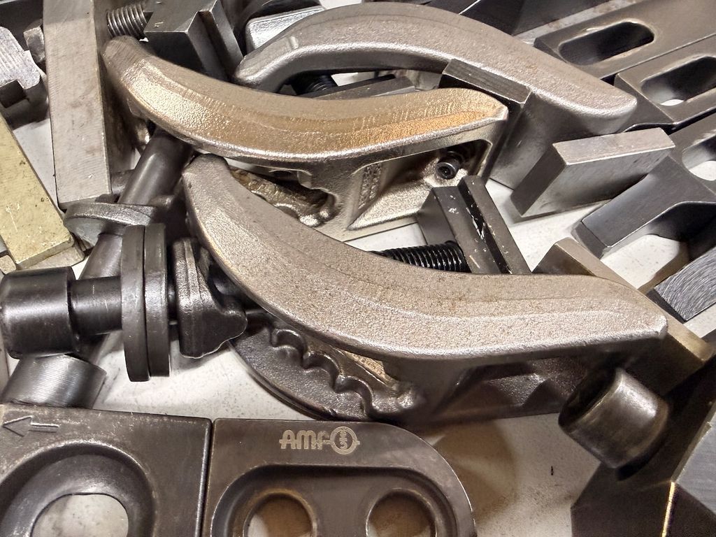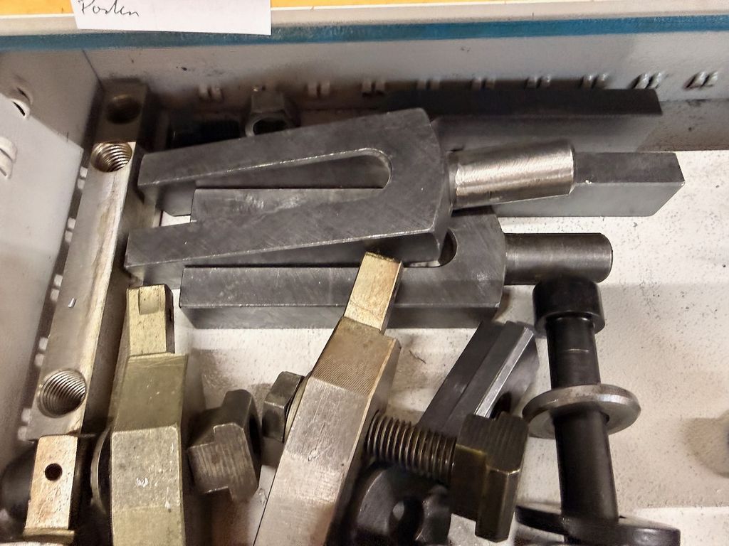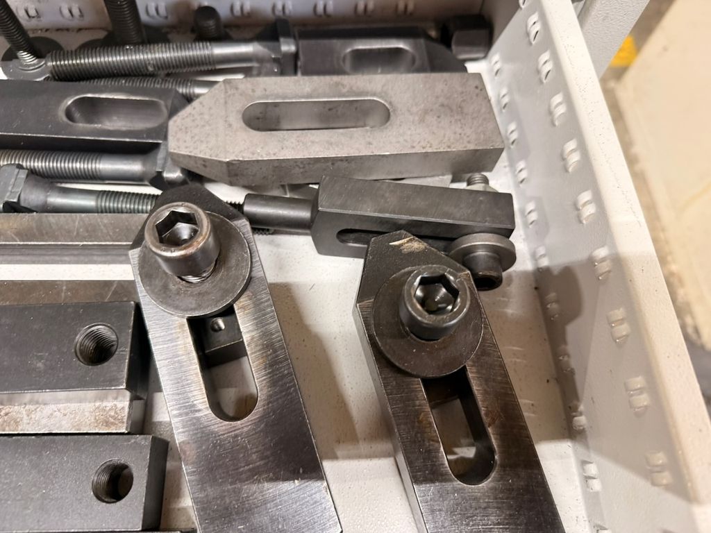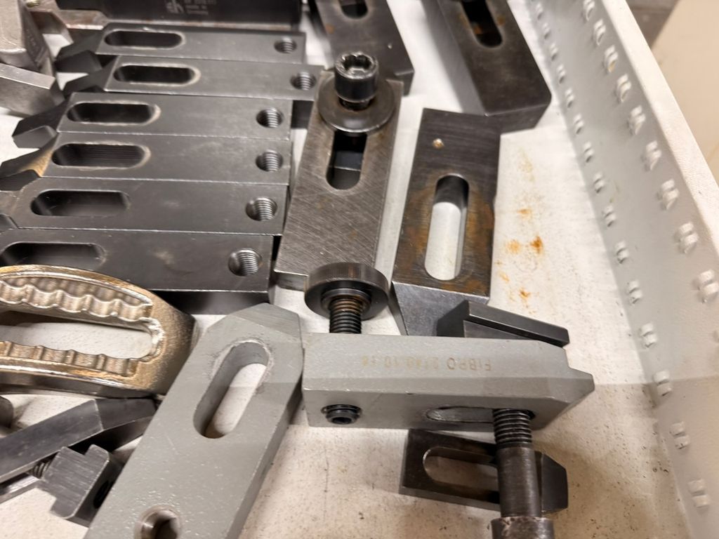 Posten bestehend aus verschiedenen Spannelementen für konventionelle und CNC-Maschinen. Der Inhalt umfasst zahlreiche Spannpratzen, Niederzugspanner, Briden, Anschläge, Schrauben und Distanzstücke. Die Teile sind überwiegend aus gehärtetem Werkzeugstahl und in gebrauchtem, aber funktionsfähigem Zustand.