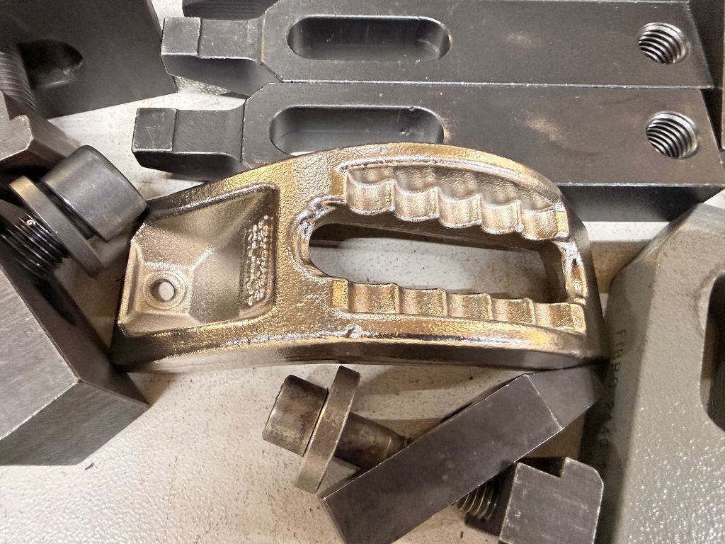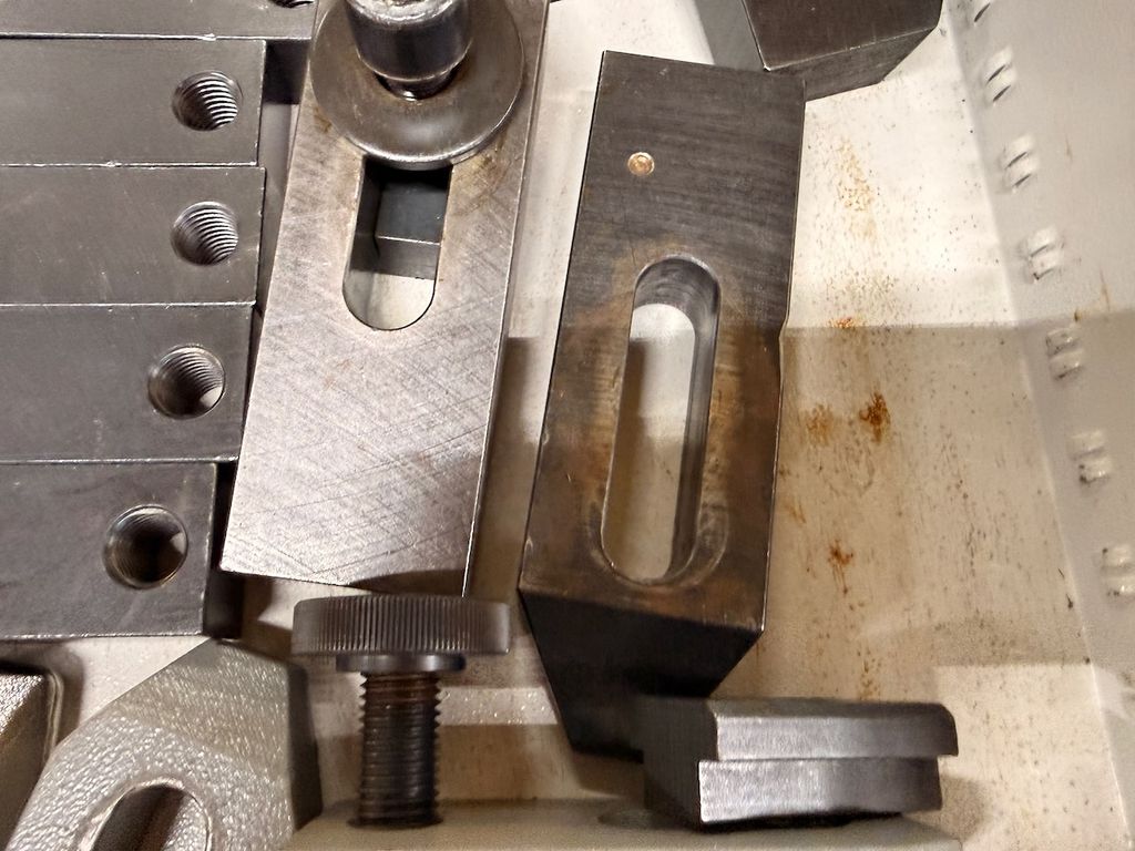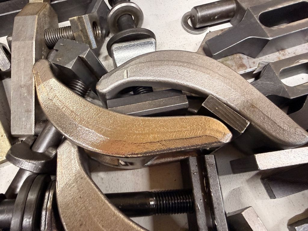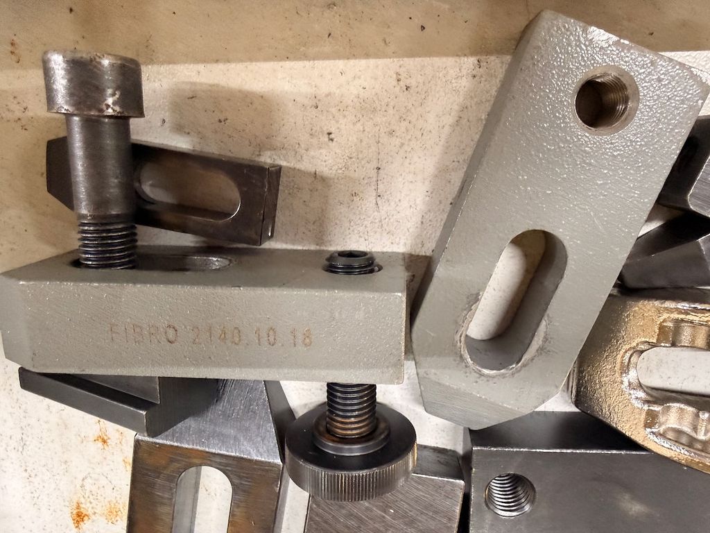 Posten bestehend aus verschiedenen Spannelementen für konventionelle und CNC-Maschinen. Der Inhalt umfasst zahlreiche Spannpratzen, Niederzugspanner, Briden, Anschläge, Schrauben und Distanzstücke. Die Teile sind überwiegend aus gehärtetem Werkzeugstahl und in gebrauchtem, aber funktionsfähigem Zustand.